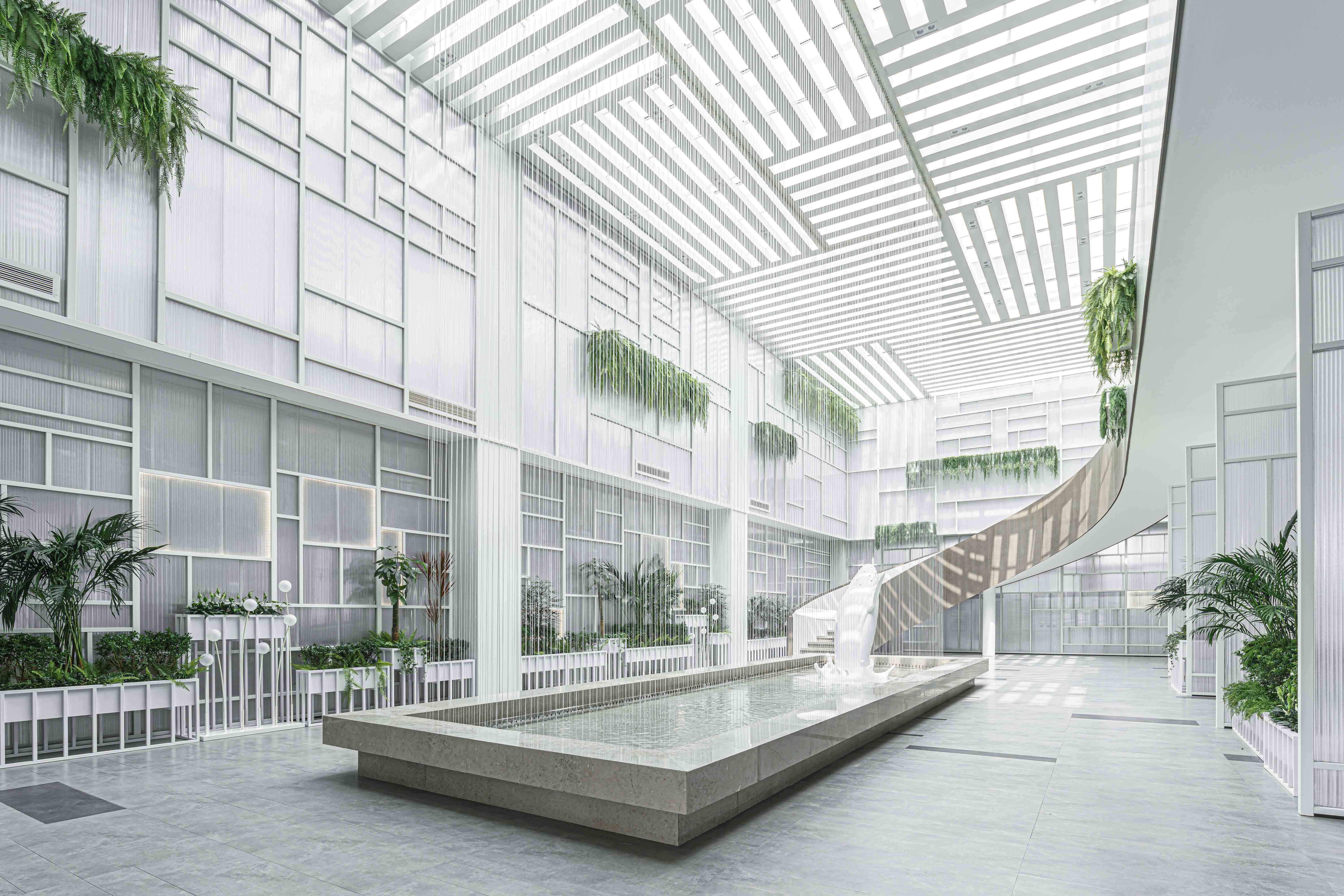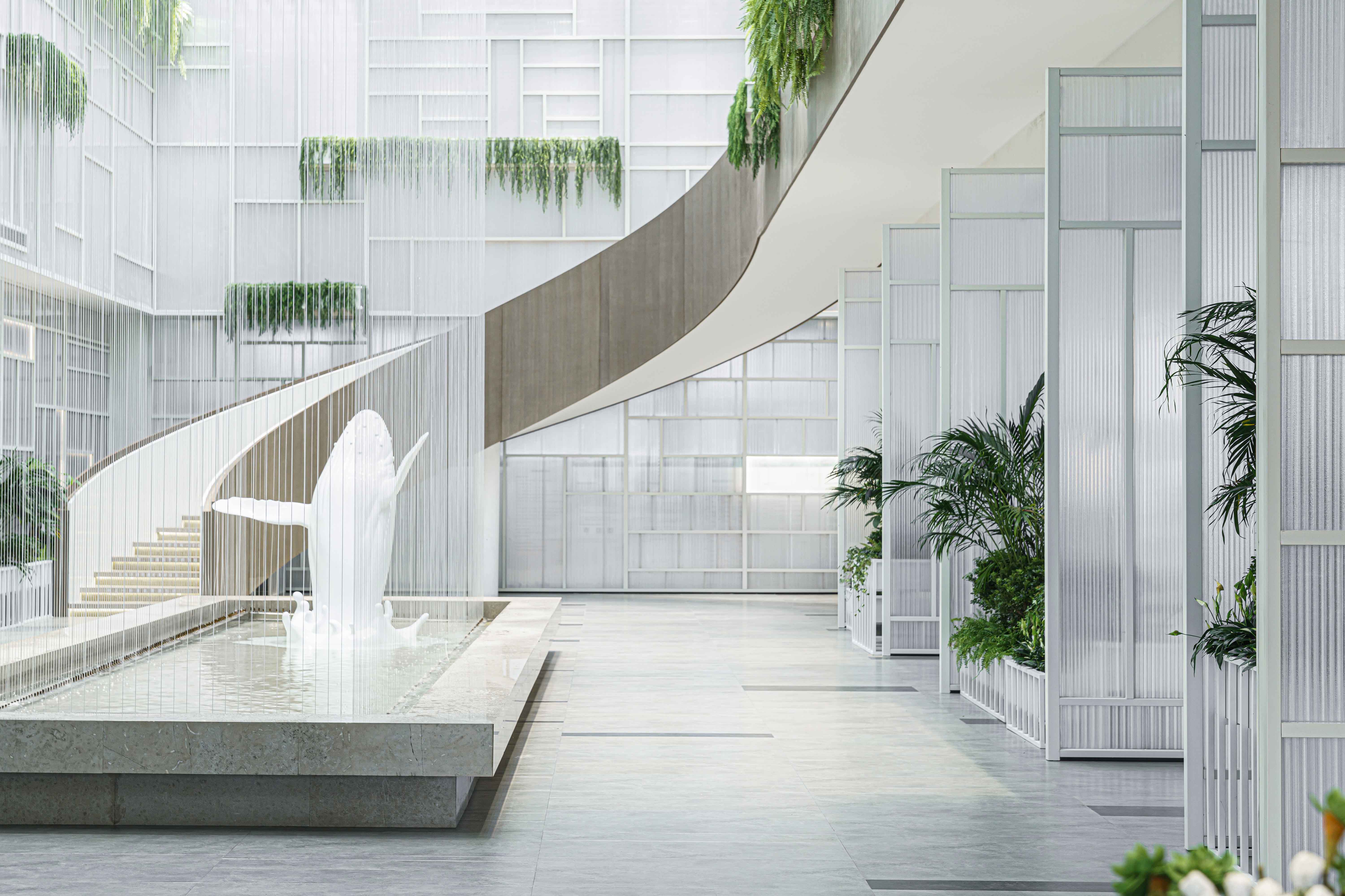 山水湖城售楼处 中庭 进入前厅,放眼望去,温室花园映入眼帘。生机勃勃的植物在灯光的照耀下显得格外郁郁葱葱。 设计以人与自然和谐相处为出发点,在空间中打造了一个中央花园。流动性的线条结合有机绿植,为人们营造出一个伊甸寻梦、绿叶丛林的感官空间。生动的鲸鱼雕塑在律动的水流下也显得熠熠生辉,用植物、动物、水等元素呼应了自然的主题。