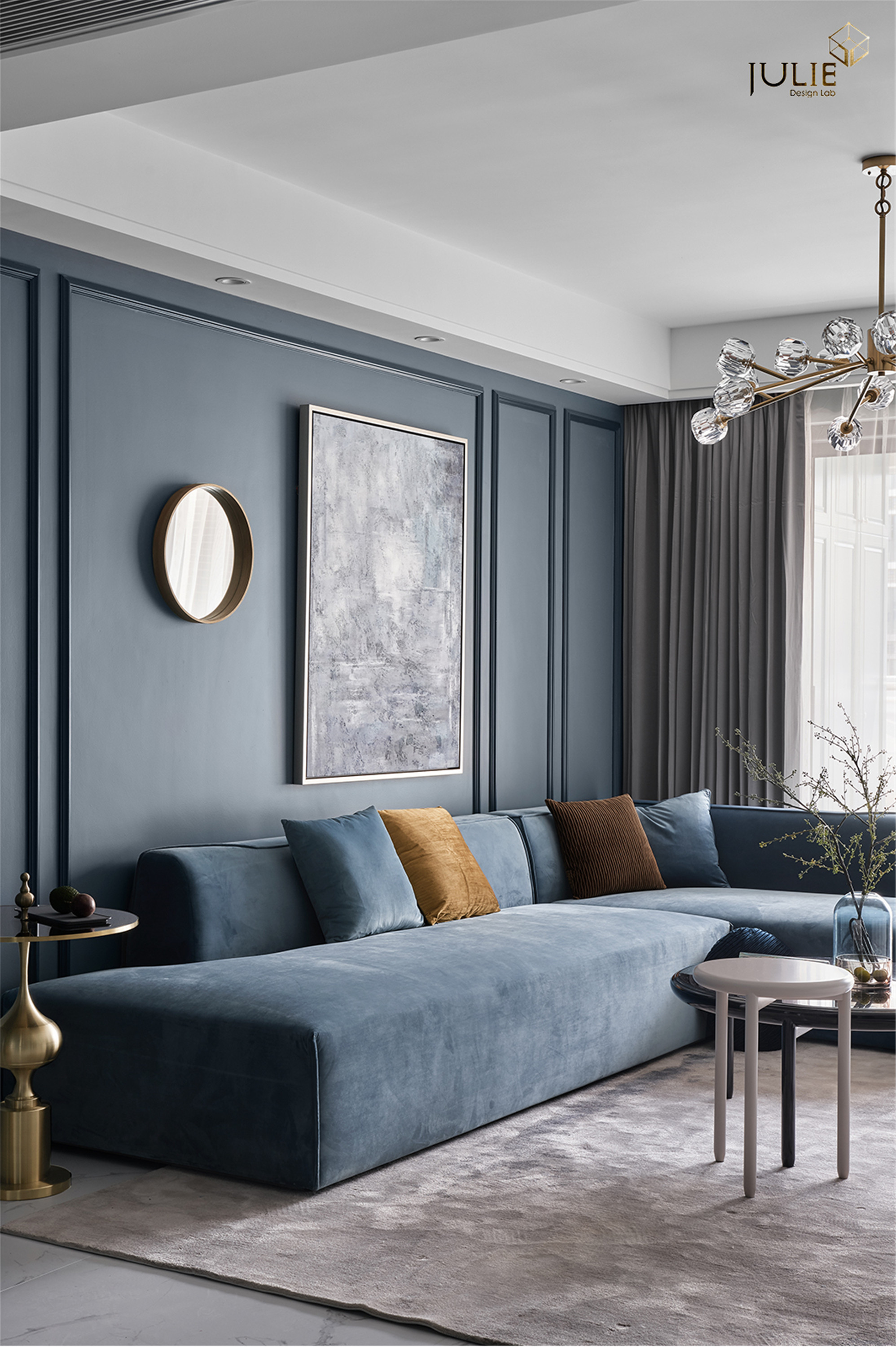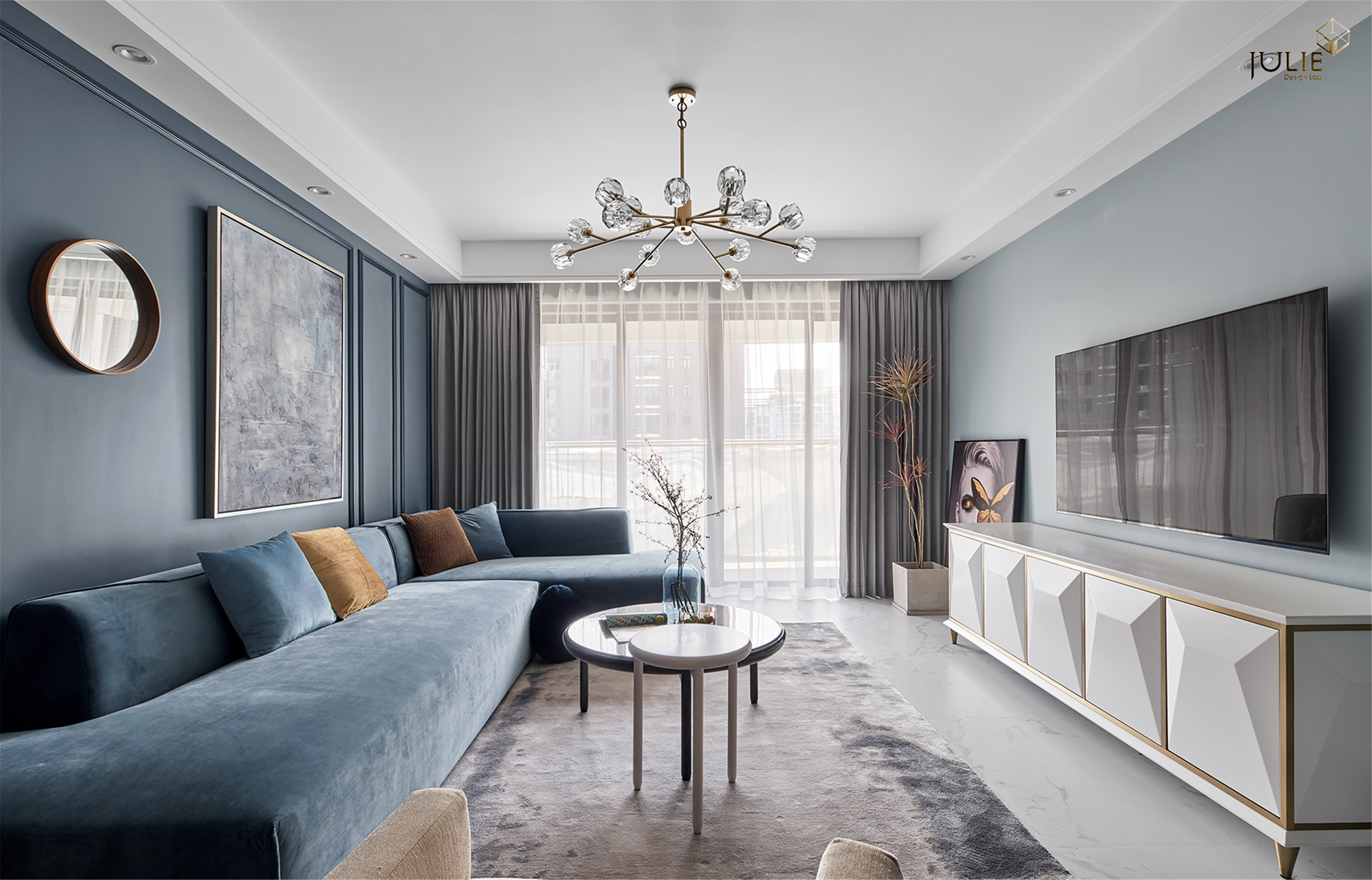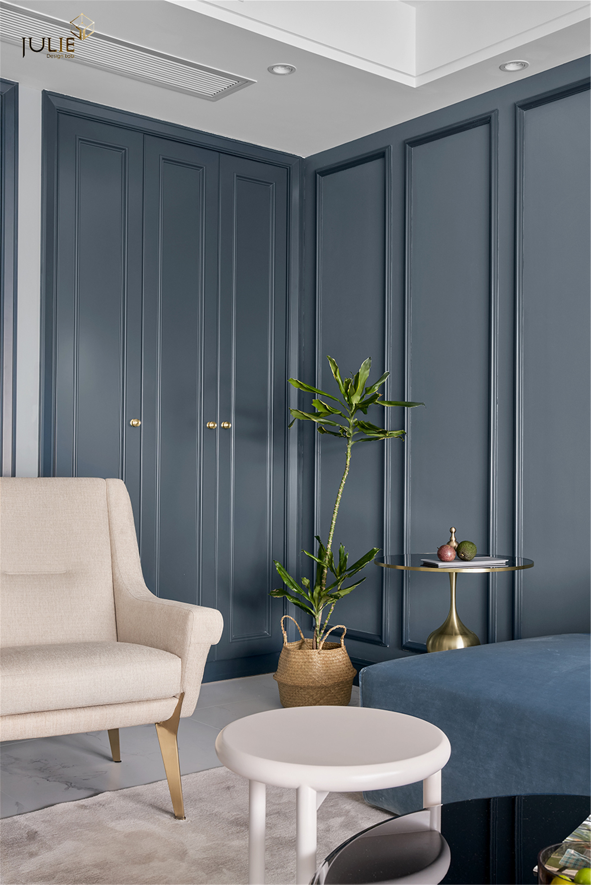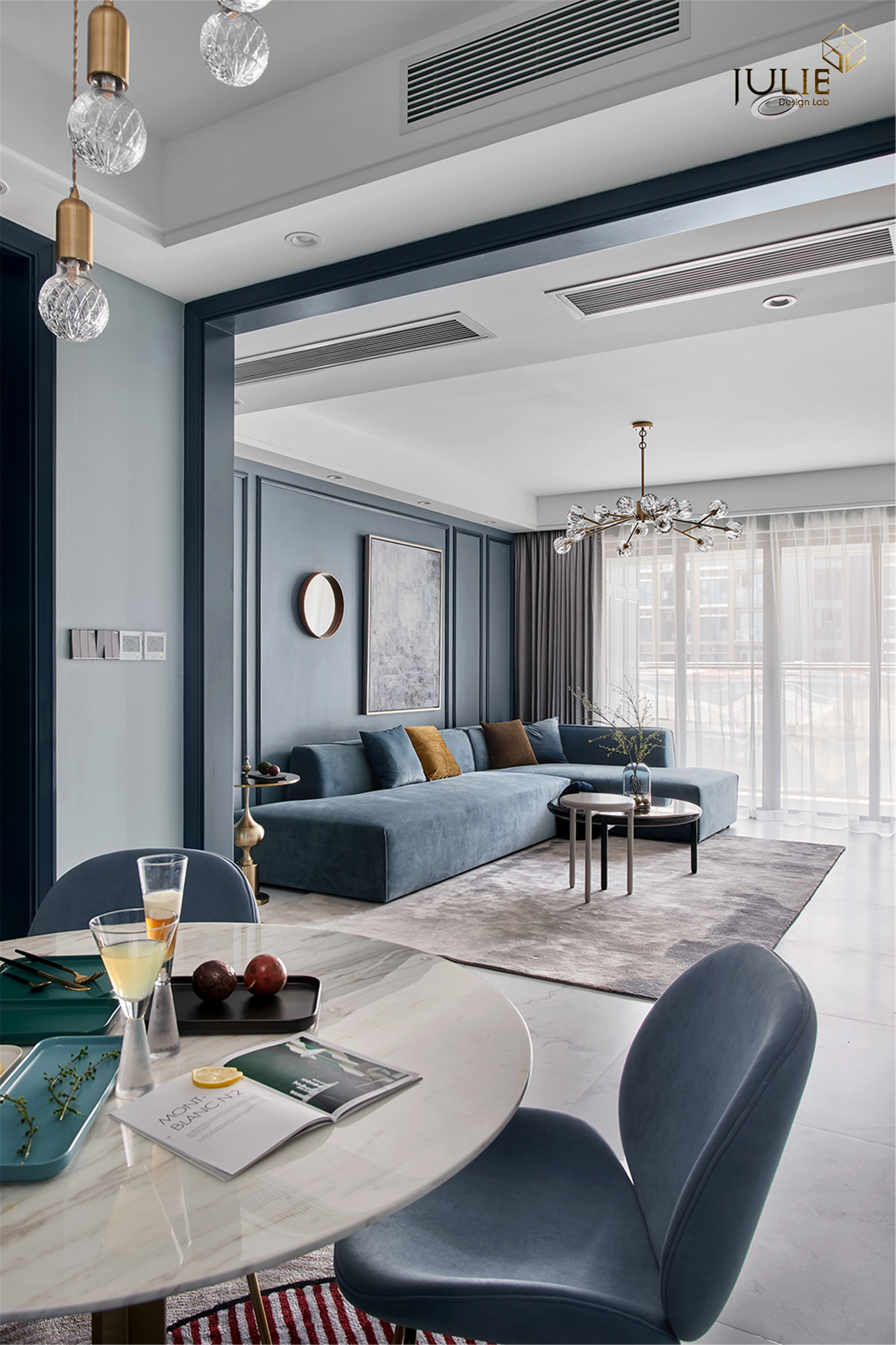项目定位:打破常规的居家配色,采用雾霾蓝做主色调,让人沉静在轻松的氛围当中。