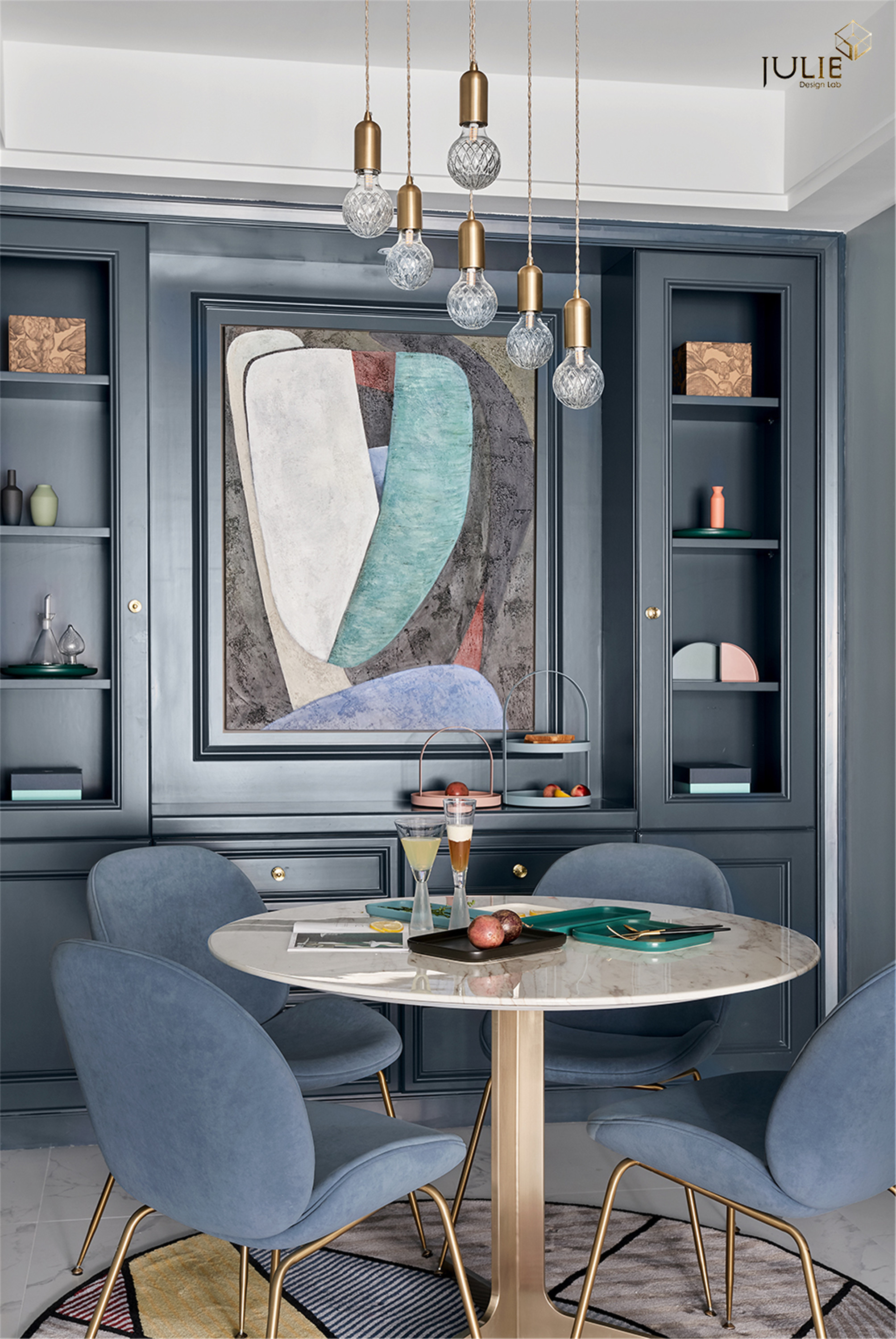 空间布局:开放式客餐厅,餐厅区域利用空间做了一面水墨蓝餐边柜,既有强大的收纳与展示功能,搭配个性的抽象挂画又让整个墙面更加丰富。