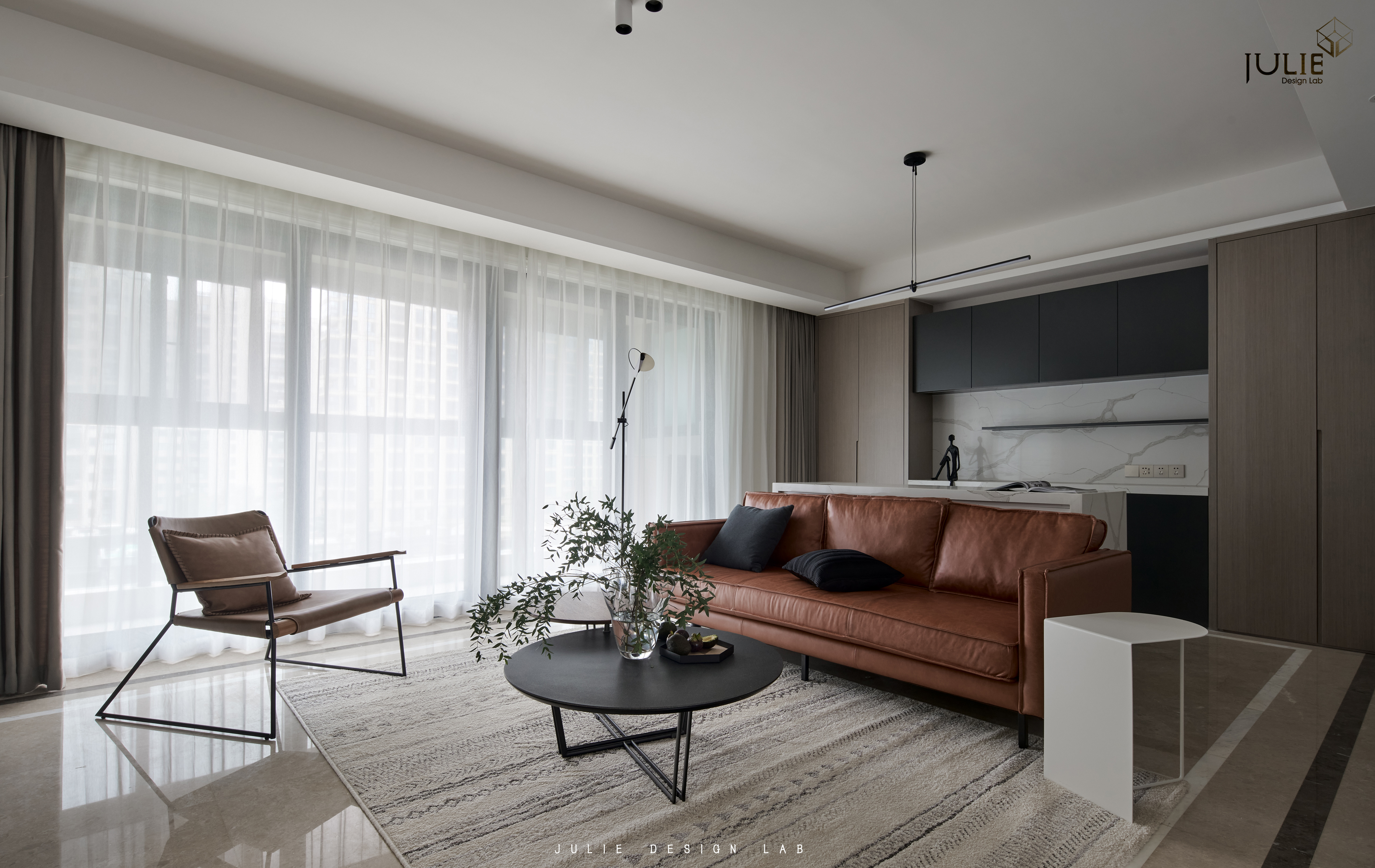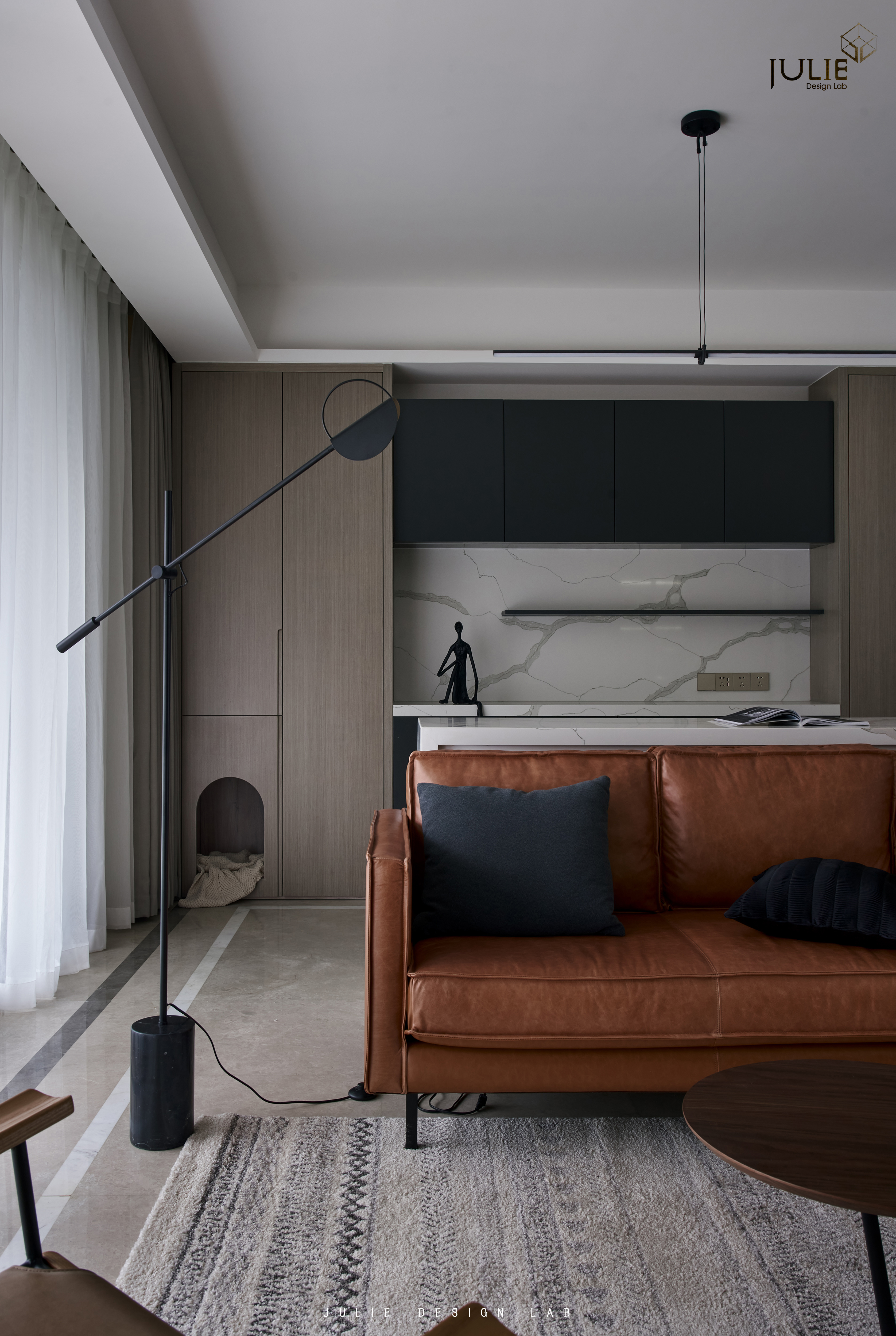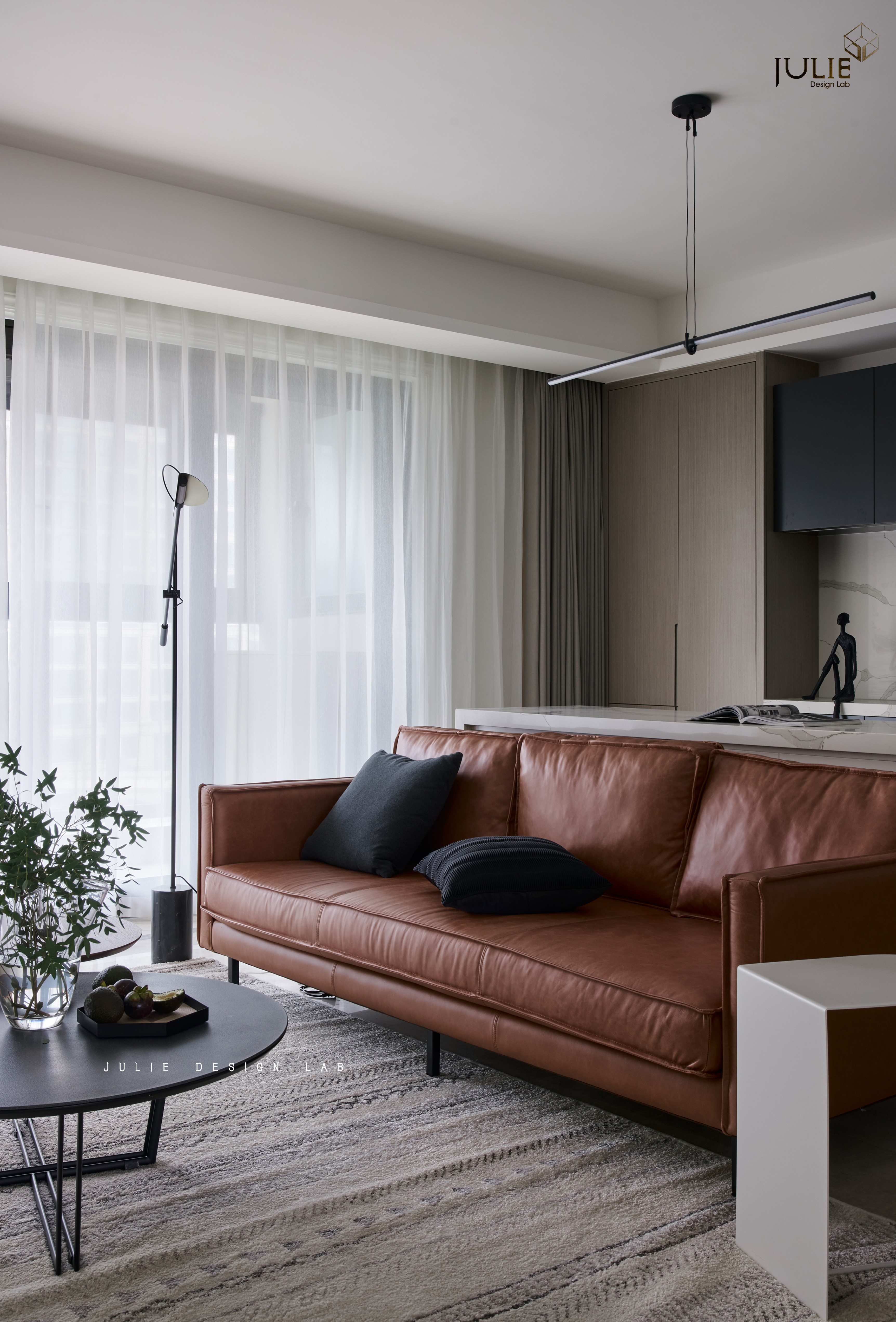 空间布局:客厅,焦糖色皮沙发、卡其色单人椅、一大一小的茶几、配上有设计感的落地灯和素雅装饰画,整个客厅的休闲氛围立刻营造了出来。