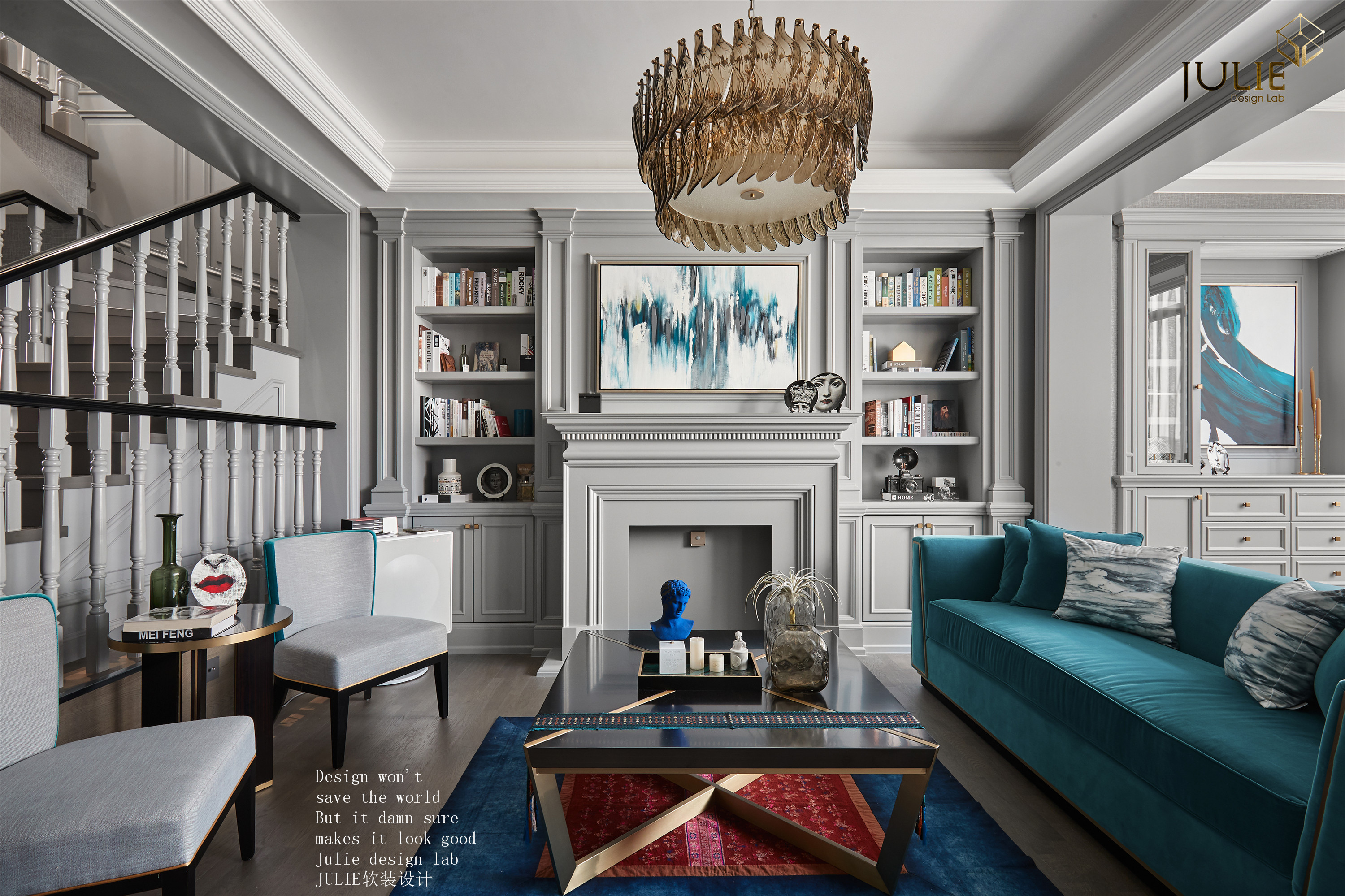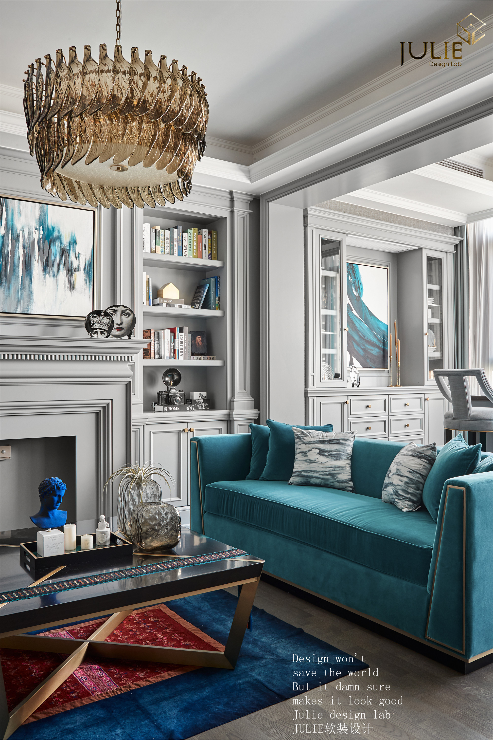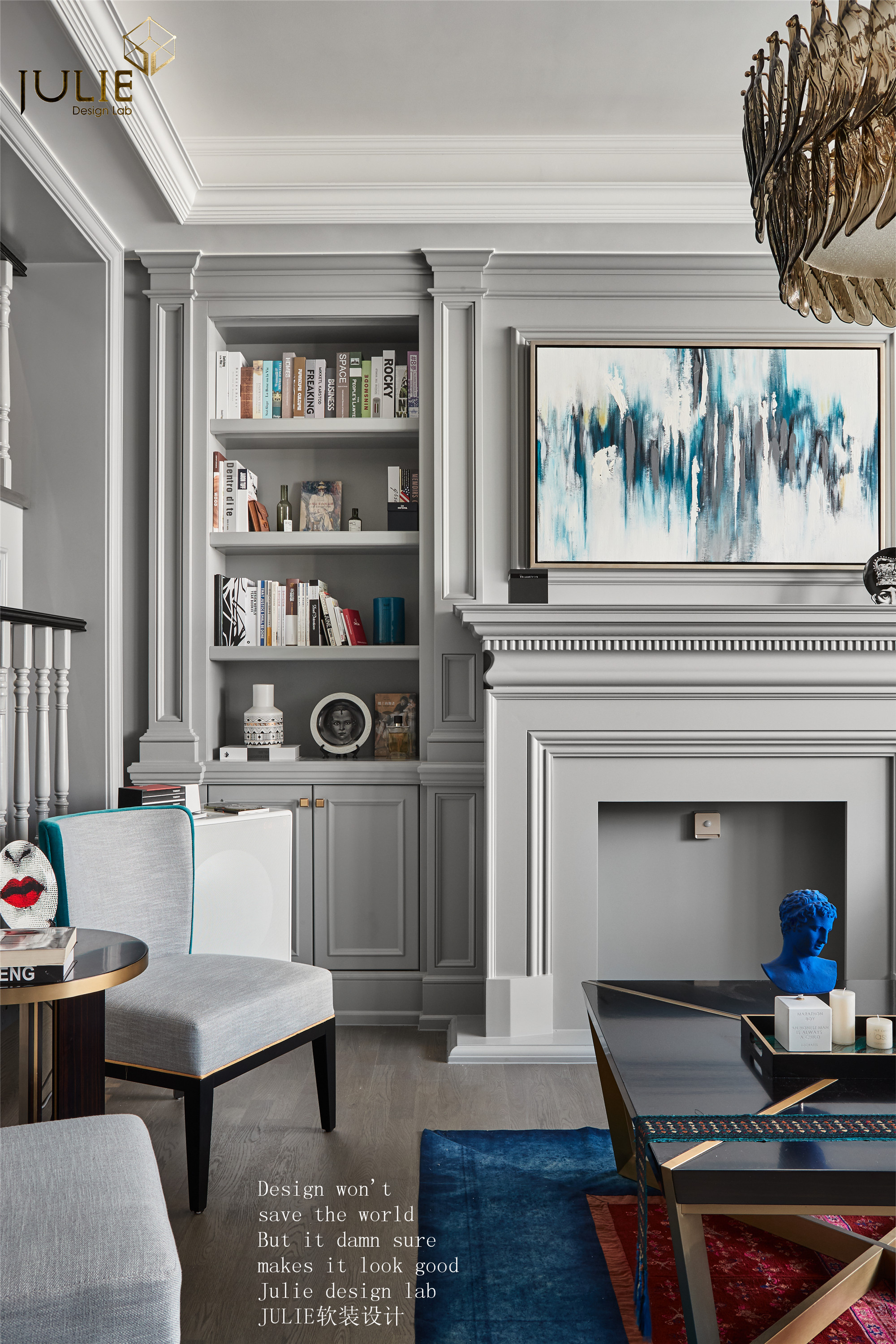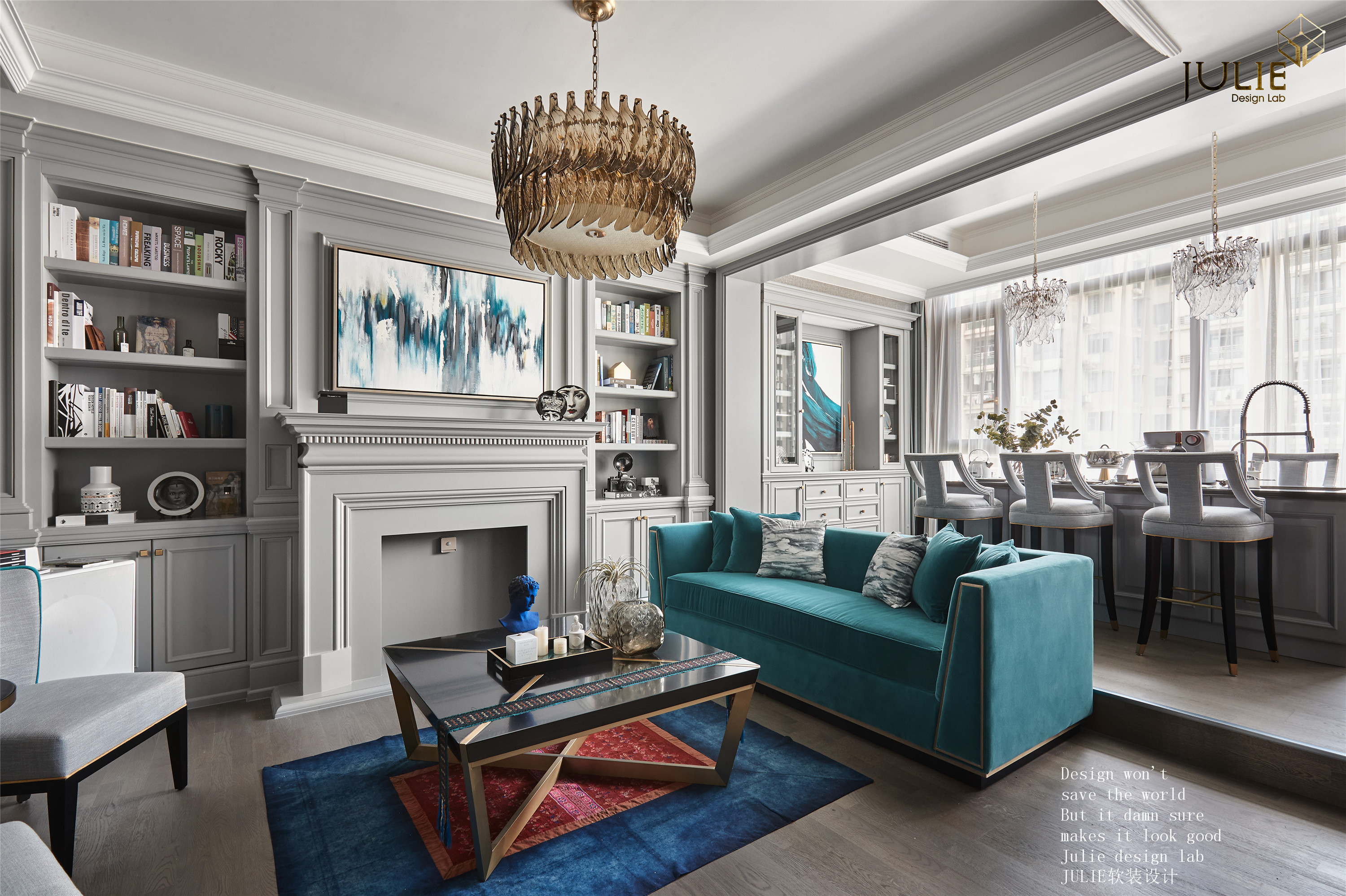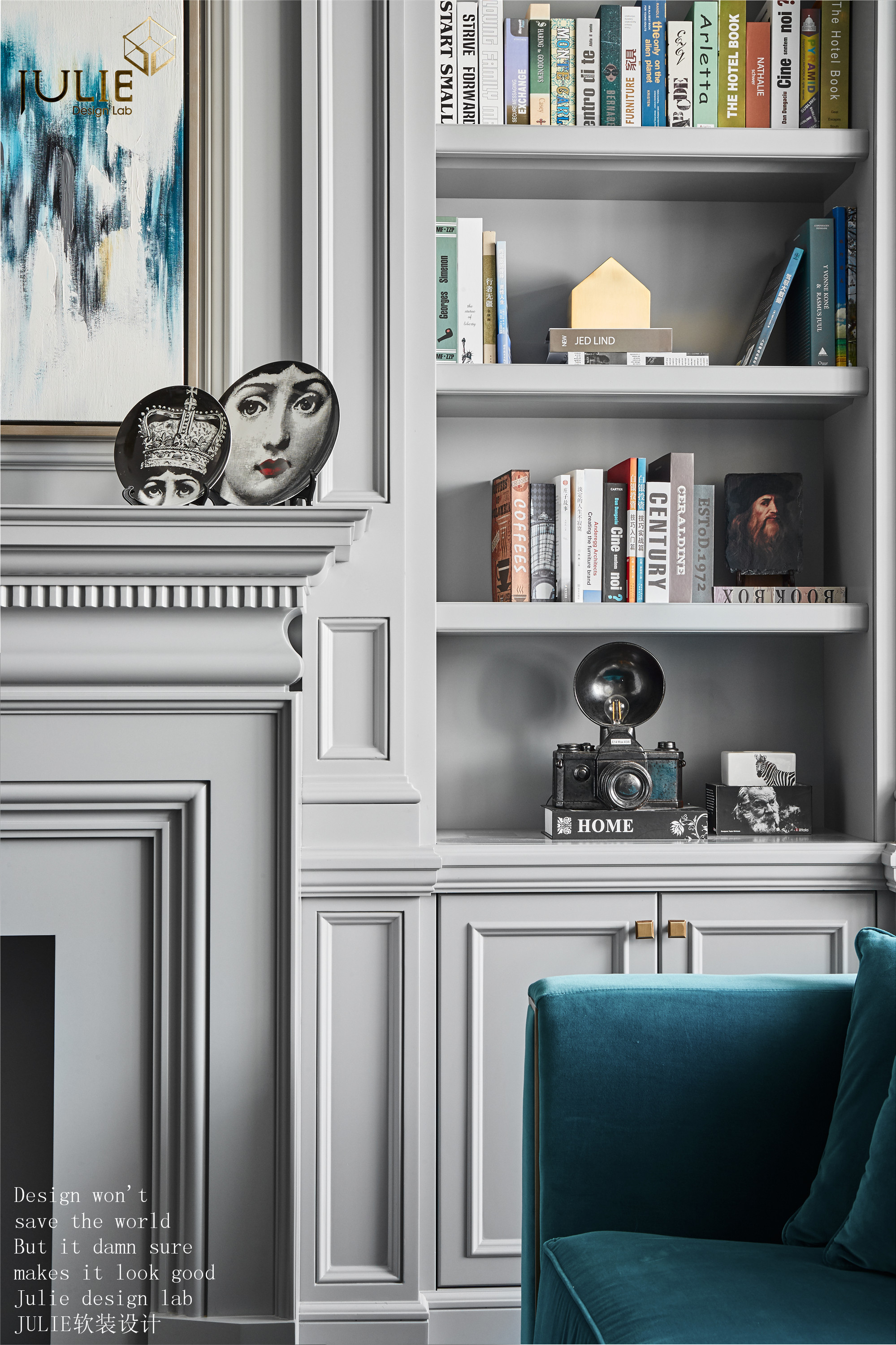 空间布局:走入客厅,被整面背景墙震撼到了。精致的美式护墙,让壁炉与书柜完美的结合,灰色又让木质更赋现代时尚元素,稳重而大气。个性的蓝绿色沙发,为空间增添了一丝活力,搭配黑色方形茶几与同色系单椅,让空间更加的完整统一。