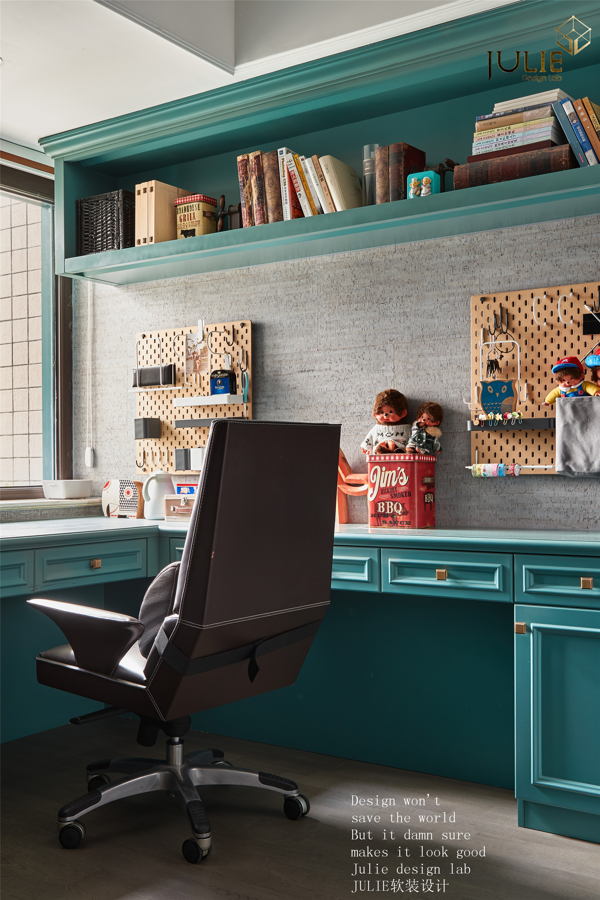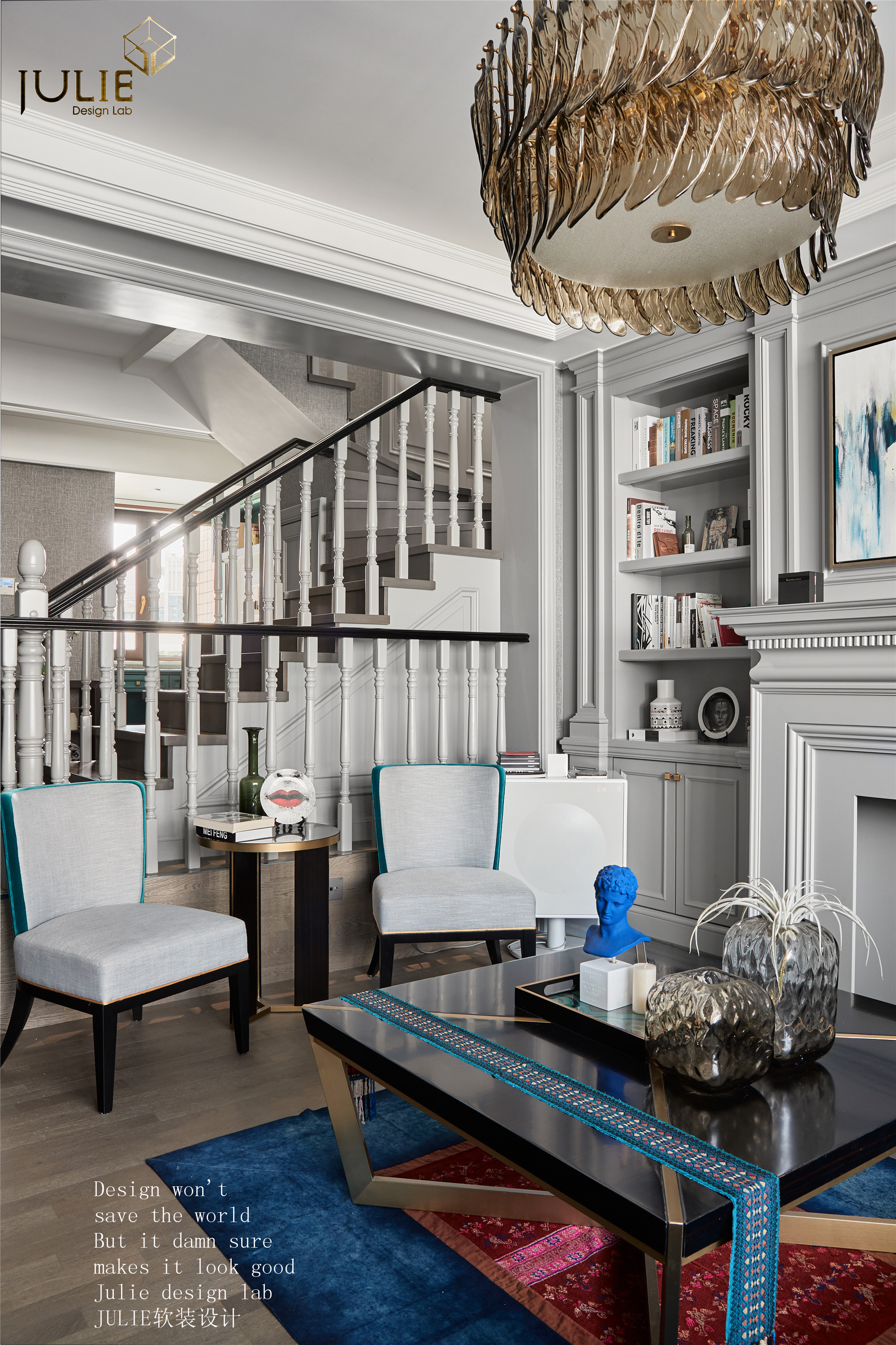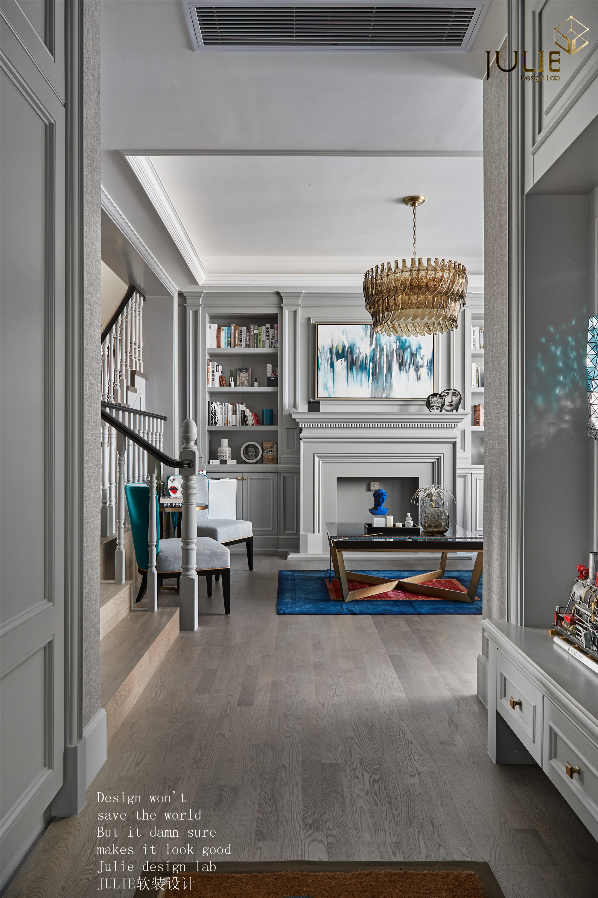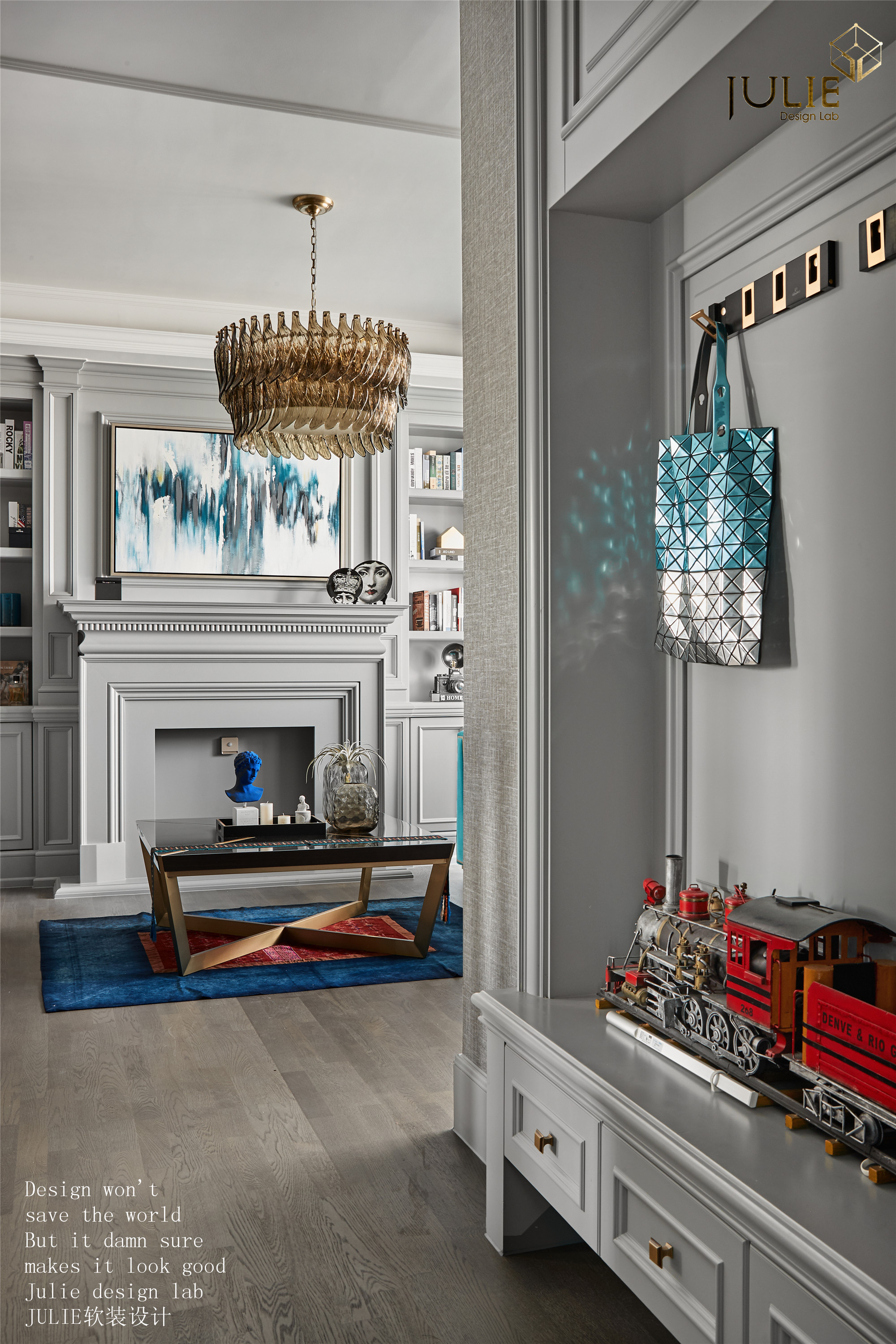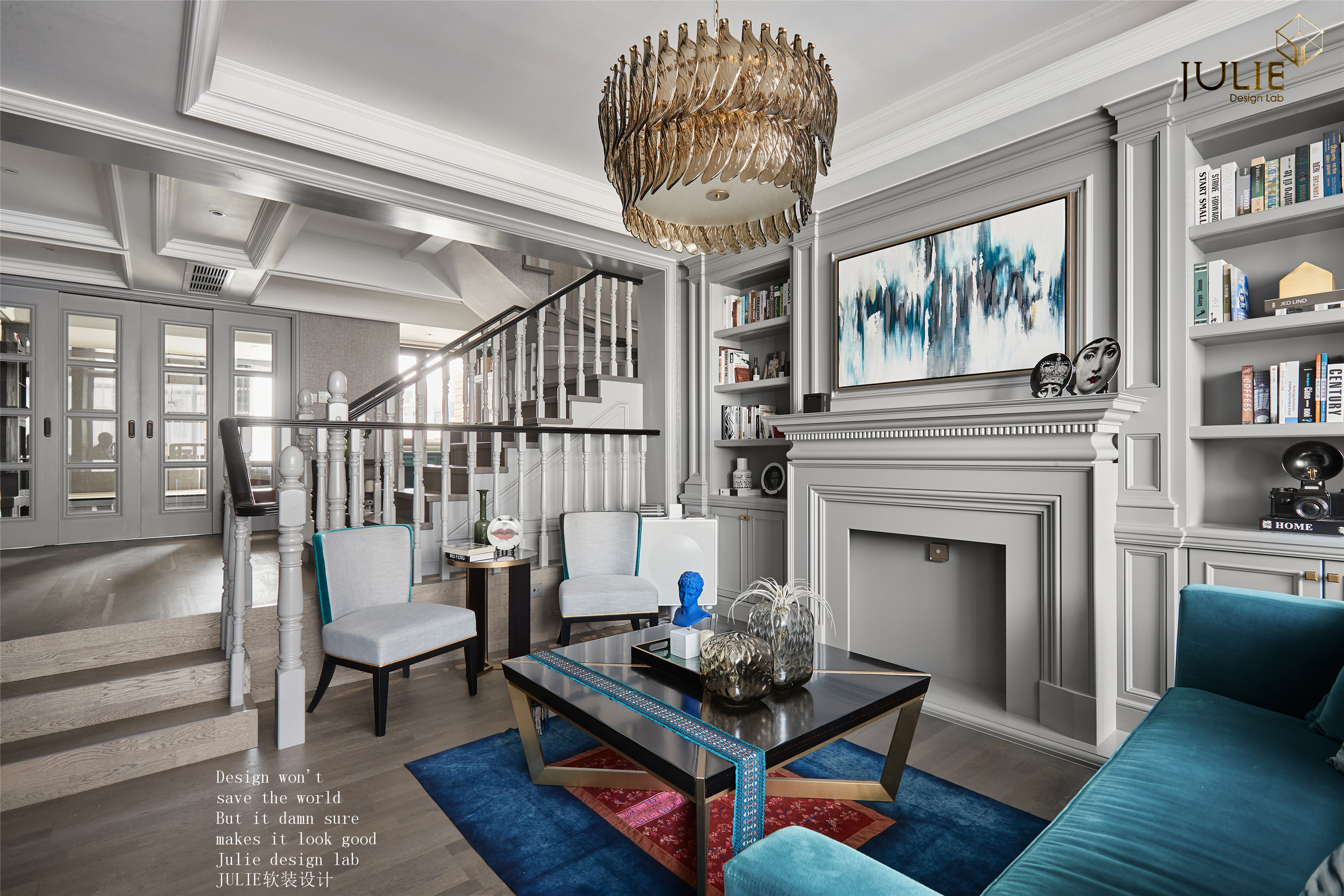 空间布局:走入客厅,被整面背景墙震撼到了。精致的美式护墙,让壁炉与书柜完美的结合,灰色又让木质更赋现代时尚元素,稳重而大气。个性的蓝绿色沙发,为空间增添了一丝活力,搭配黑色方形茶几与同色系单椅,让空间更加的完整统一。