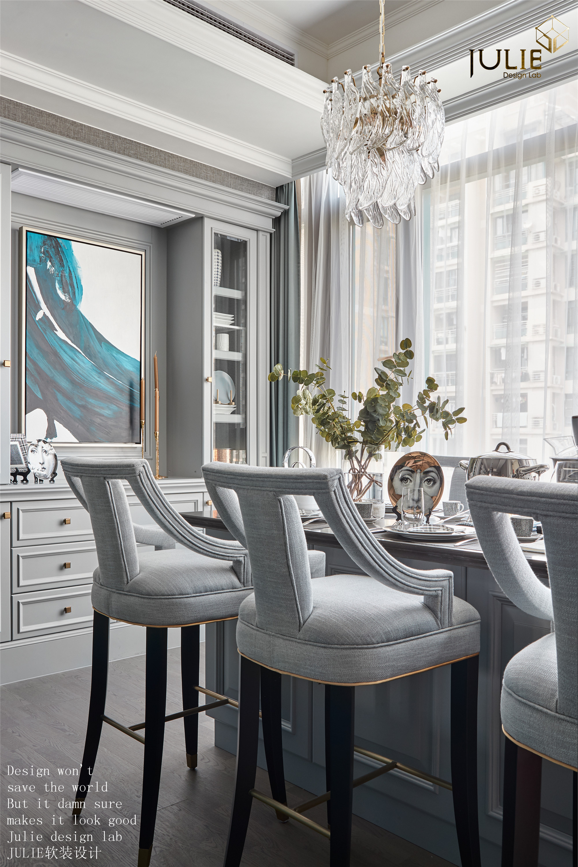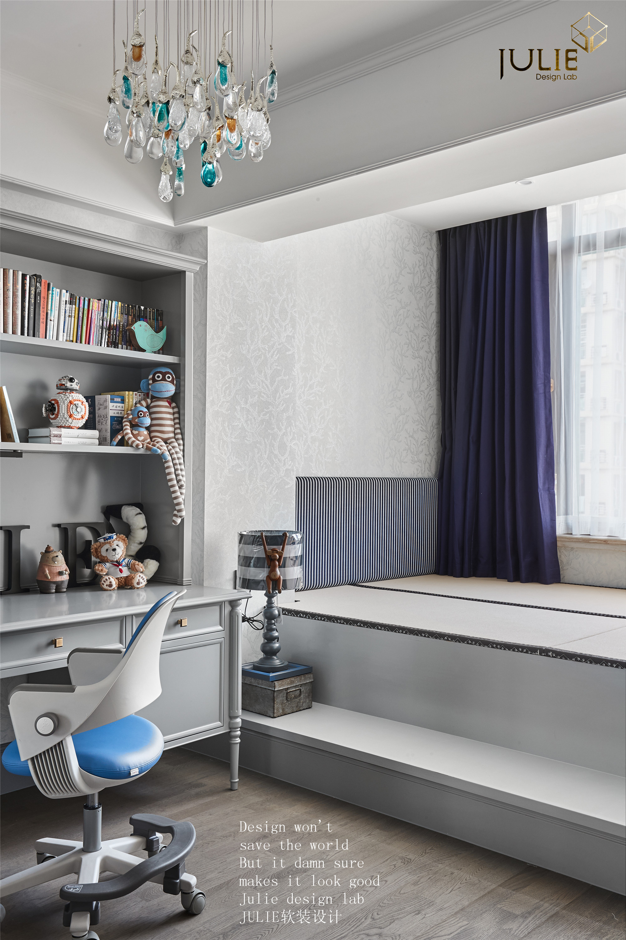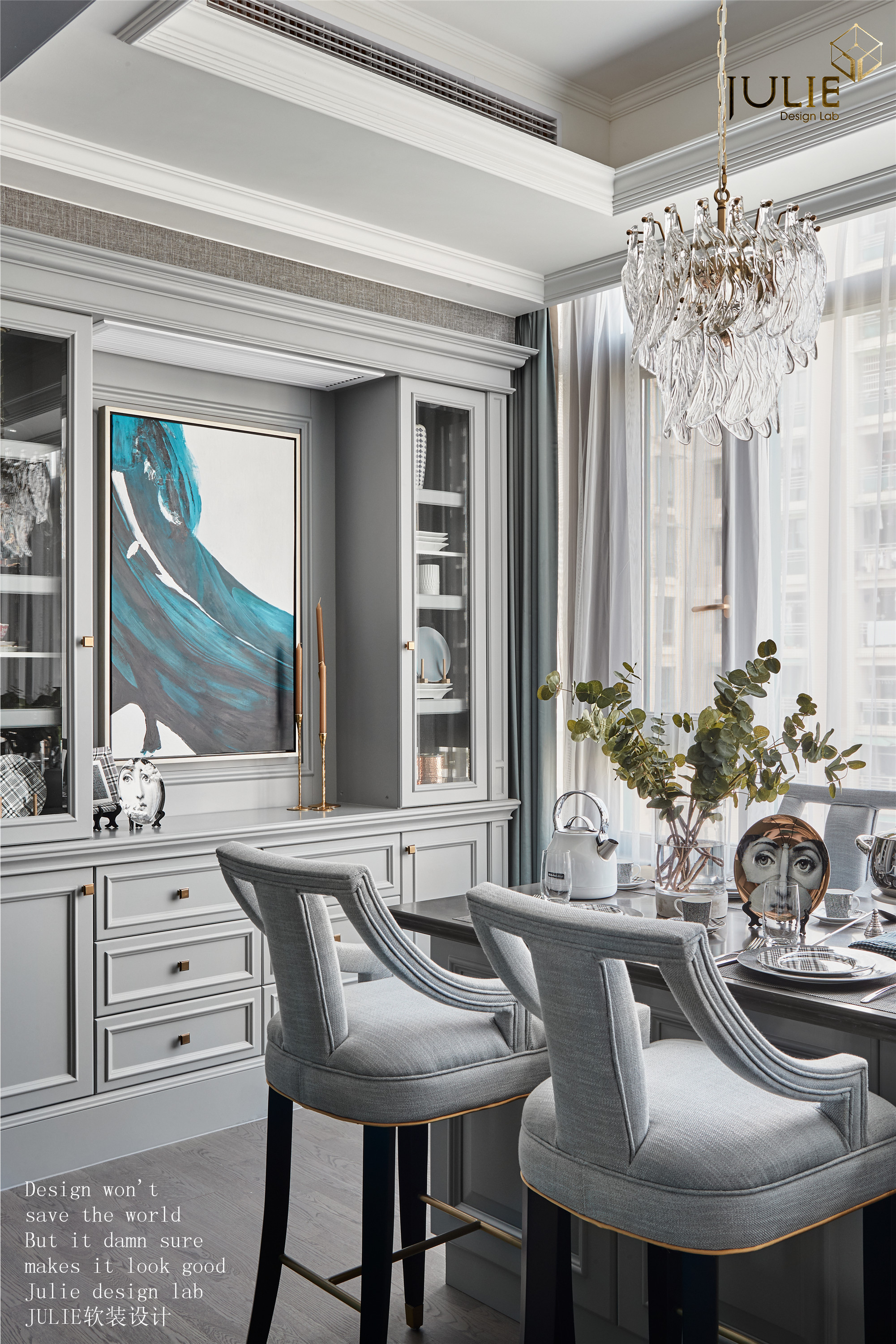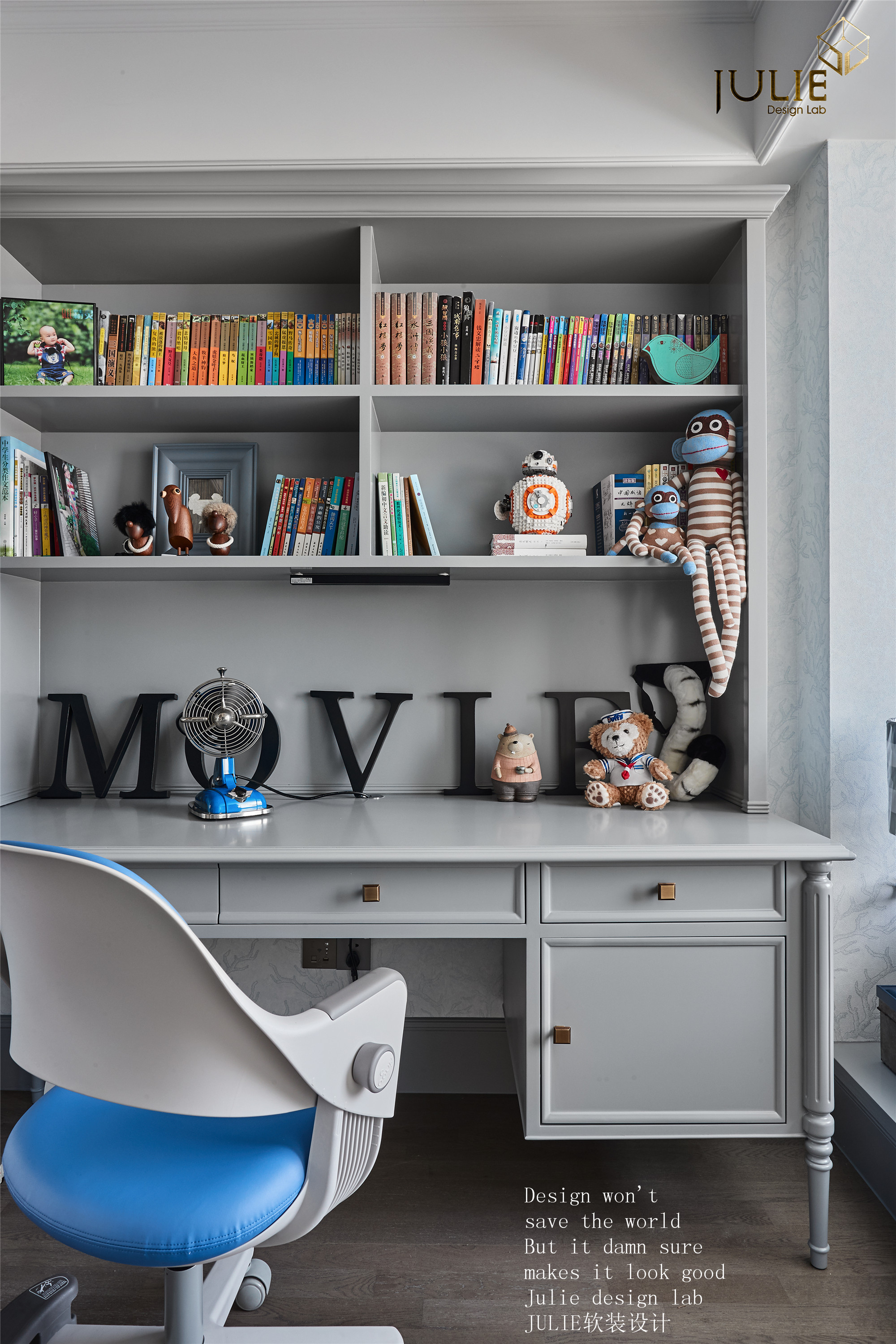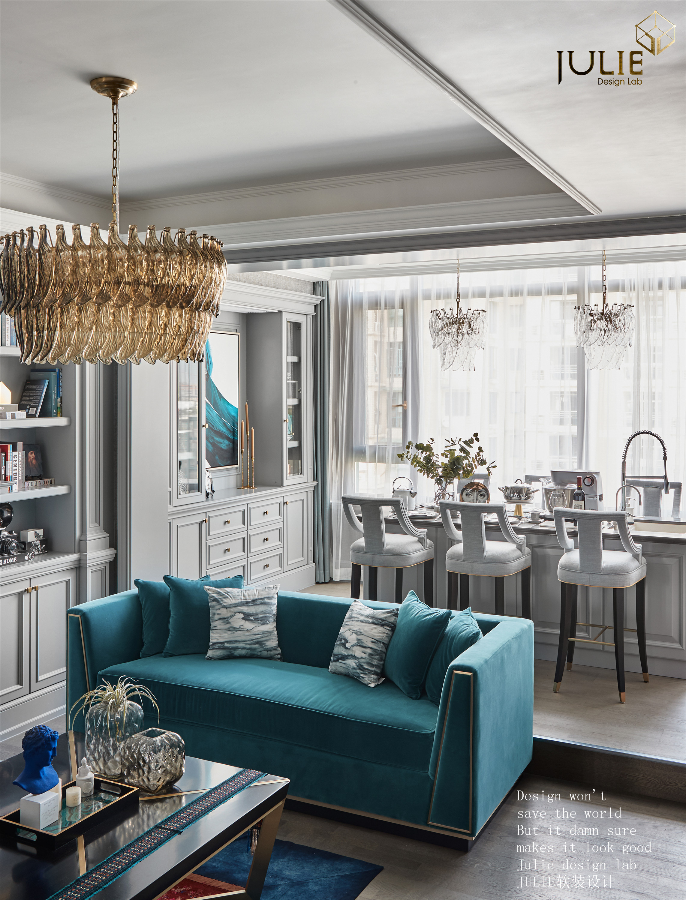 空间布局:走入客厅,被整面背景墙震撼到了。精致的美式护墙,让壁炉与书柜完美的结合,灰色又让木质更赋现代时尚元素,稳重而大气。个性的蓝绿色沙发,为空间增添了一丝活力,搭配黑色方形茶几与同色系单椅,让空间更加的完整统一。