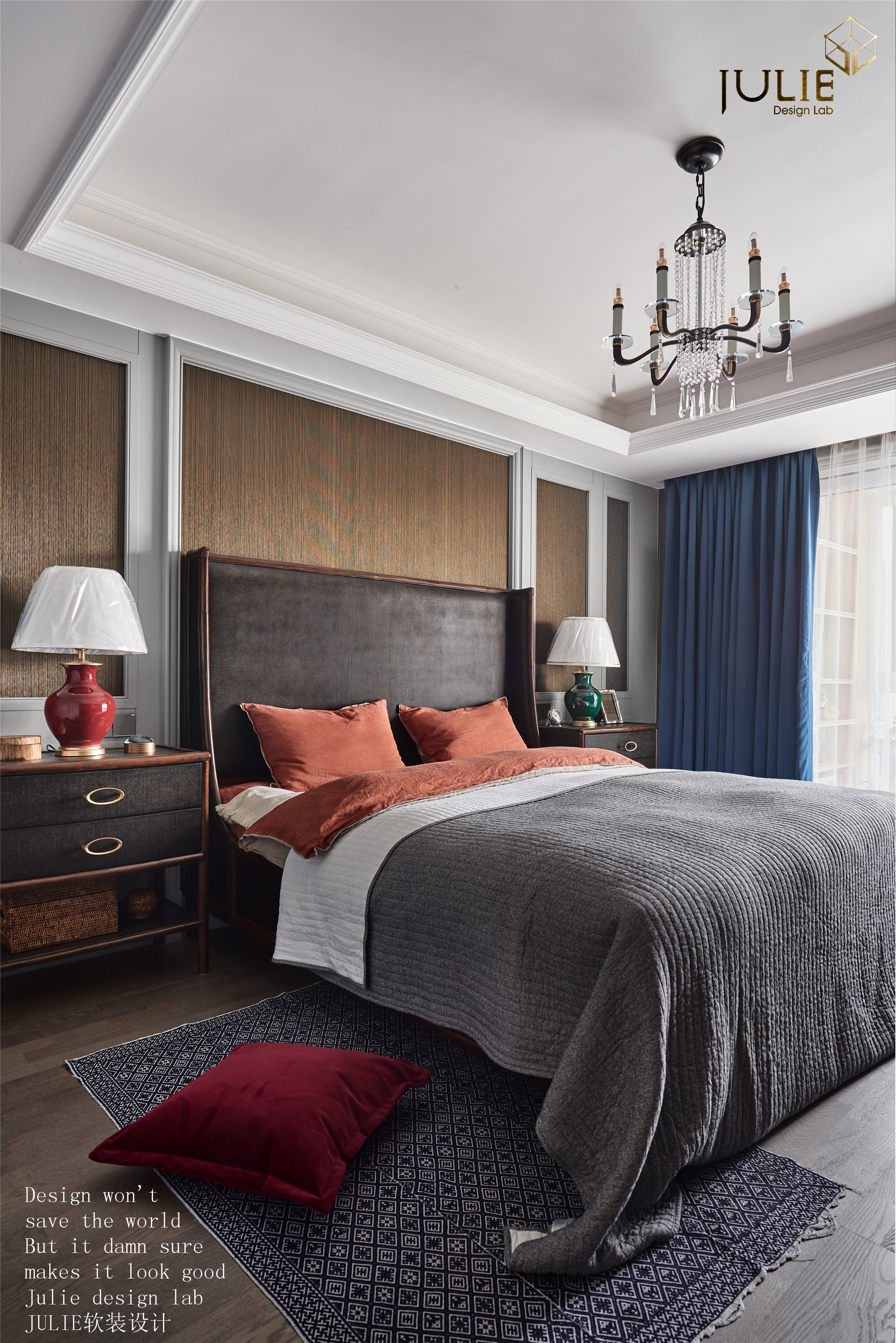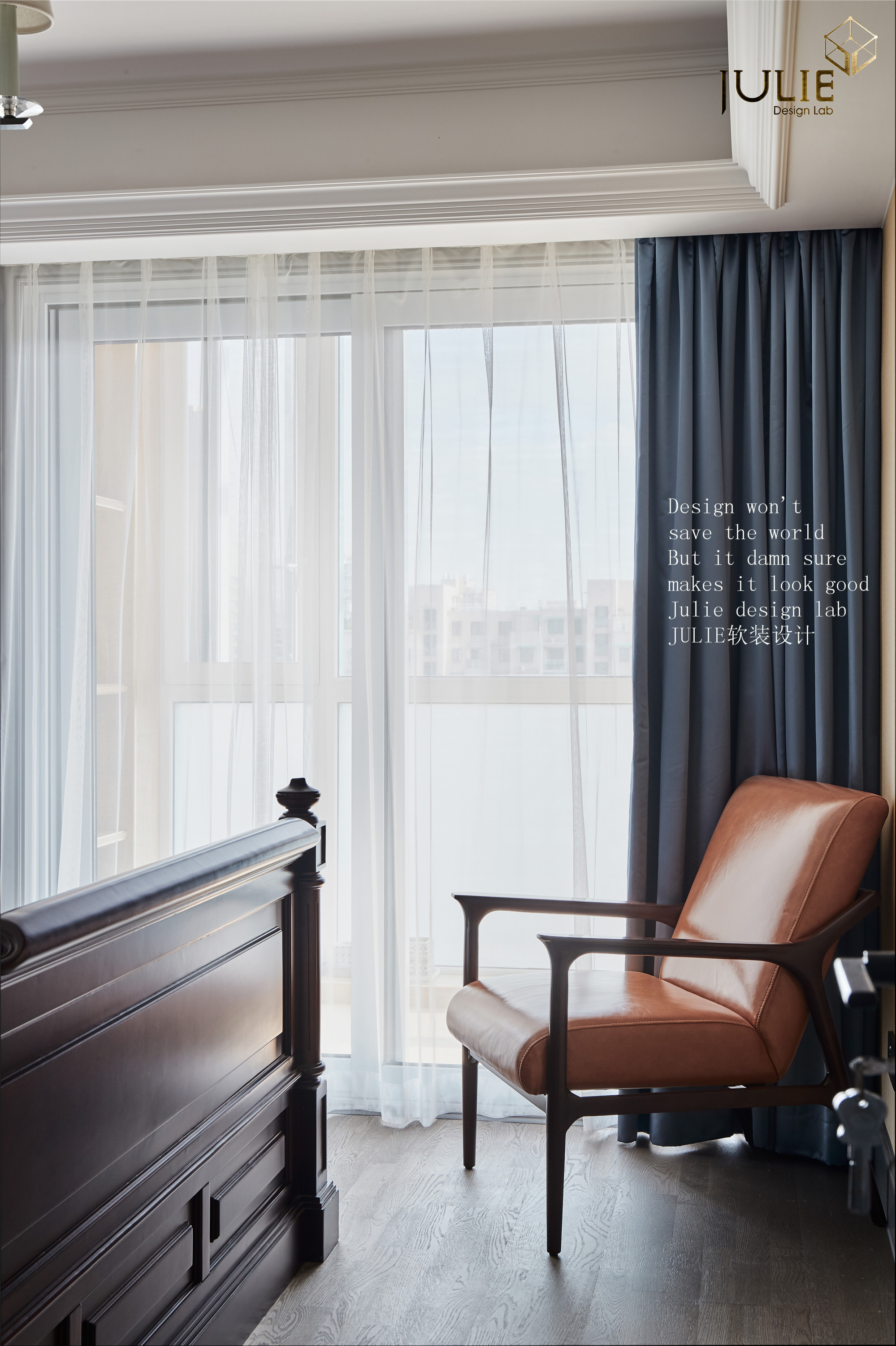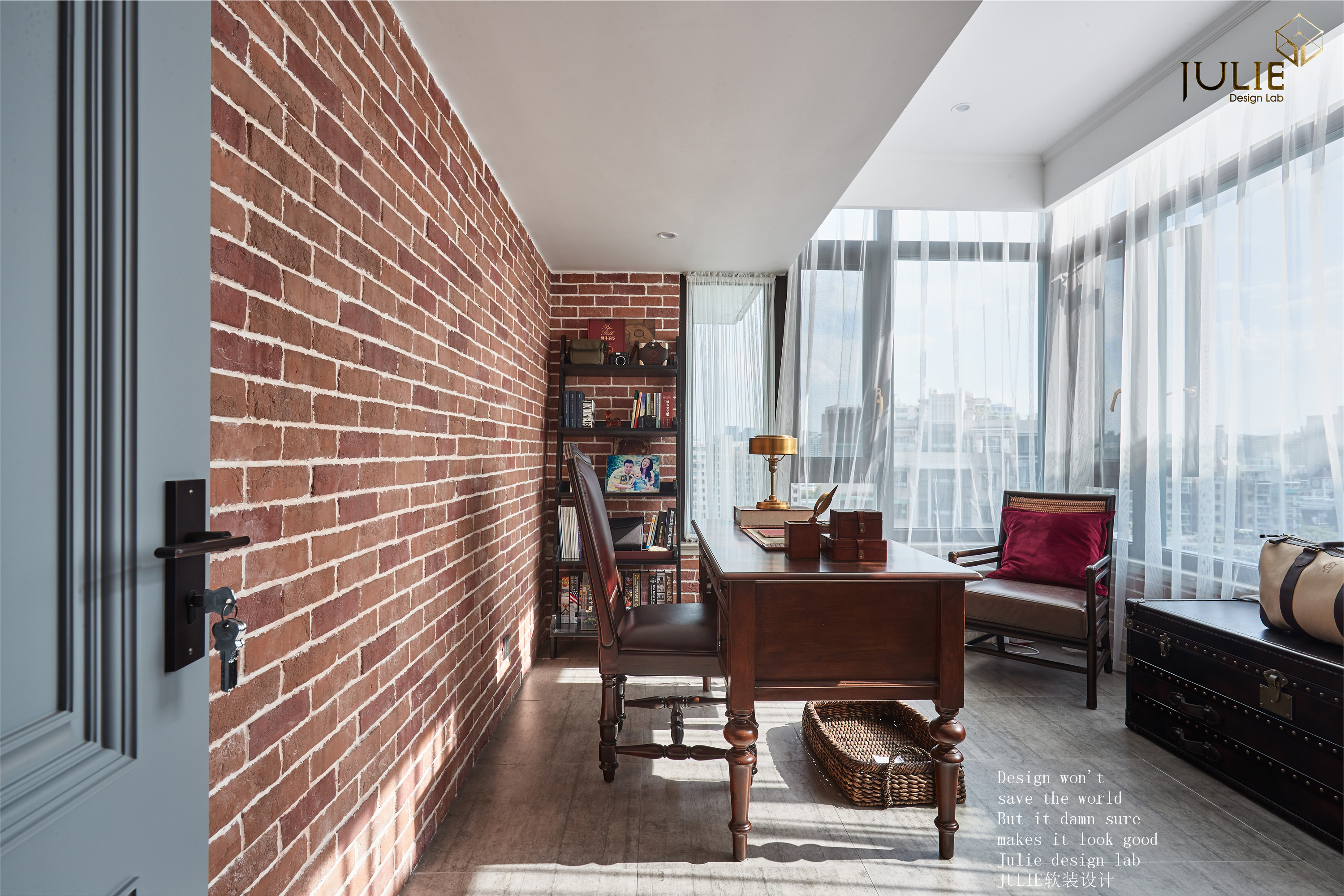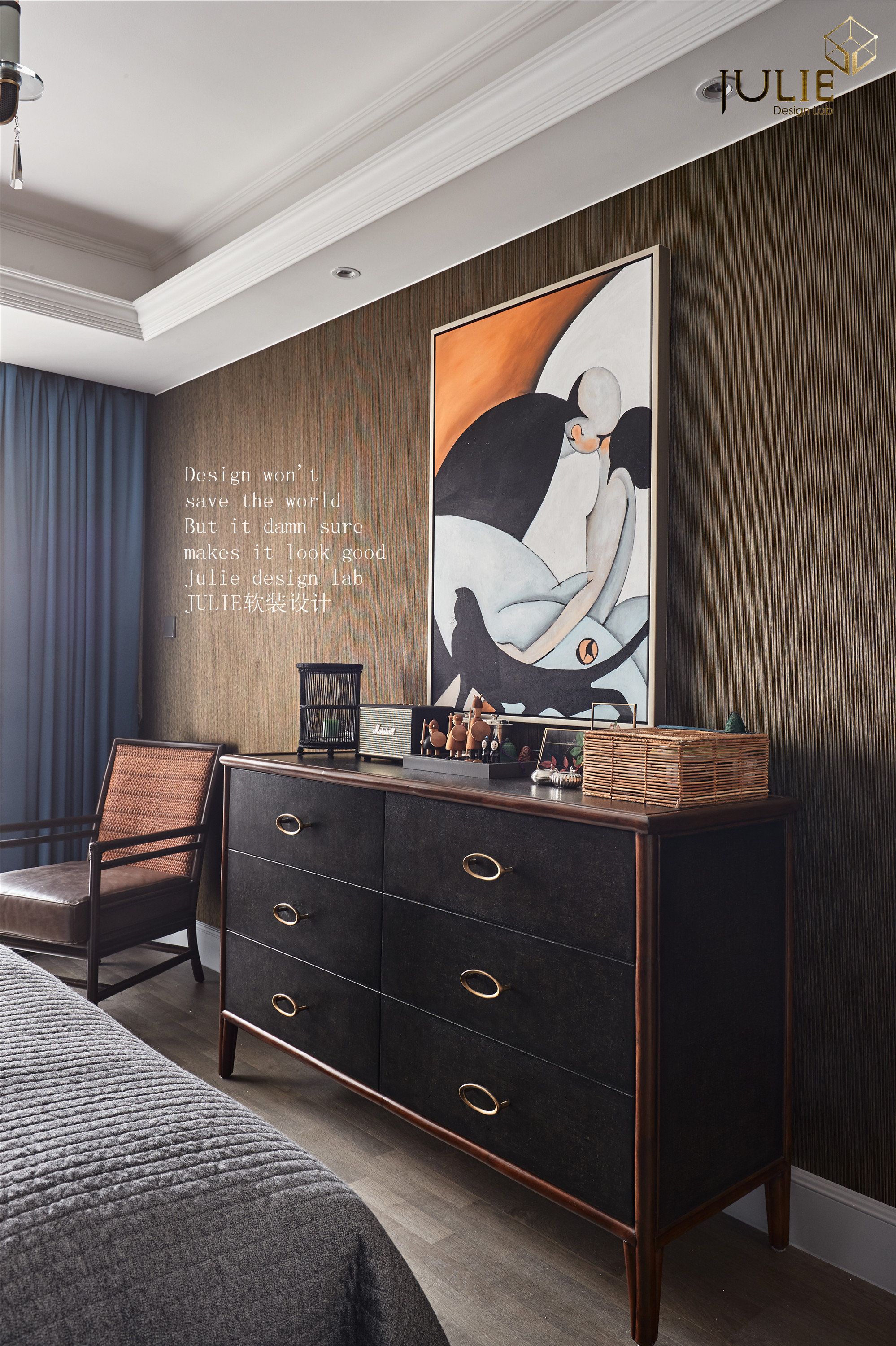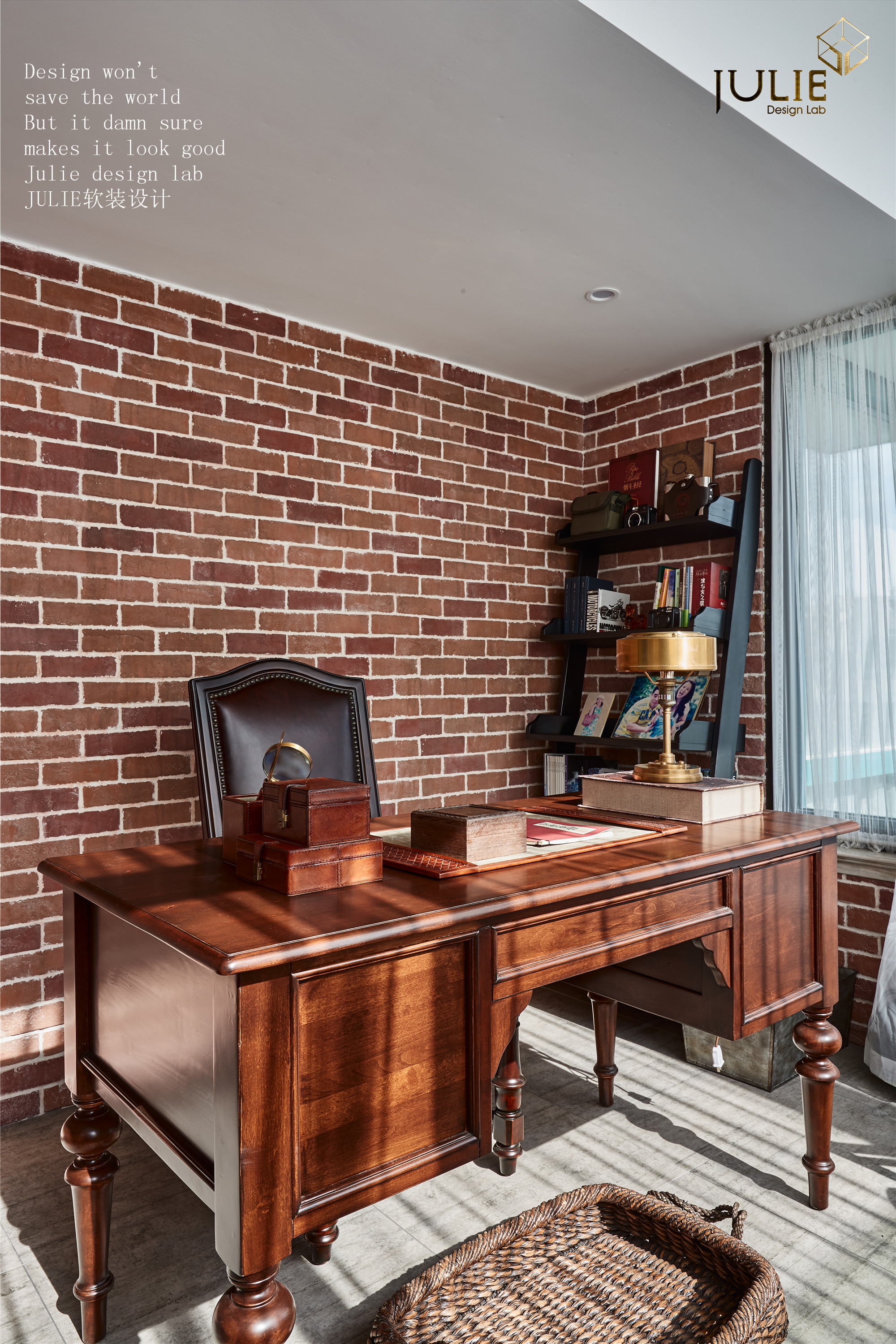 空间布局:走入客厅,被整面背景墙震撼到了。精致的美式护墙,让壁炉与书柜完美的结合,灰色又让木质更赋现代时尚元素,稳重而大气。个性的蓝绿色沙发,为空间增添了一丝活力,搭配黑色方形茶几与同色系单椅,让空间更加的完整统一。