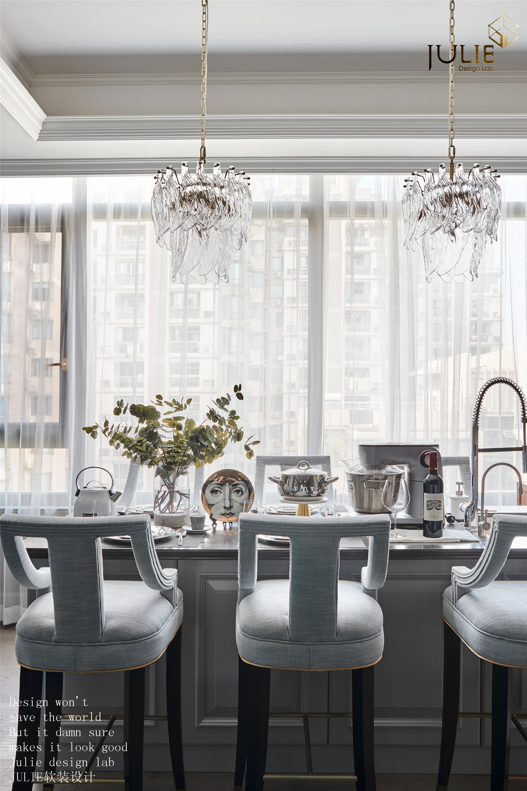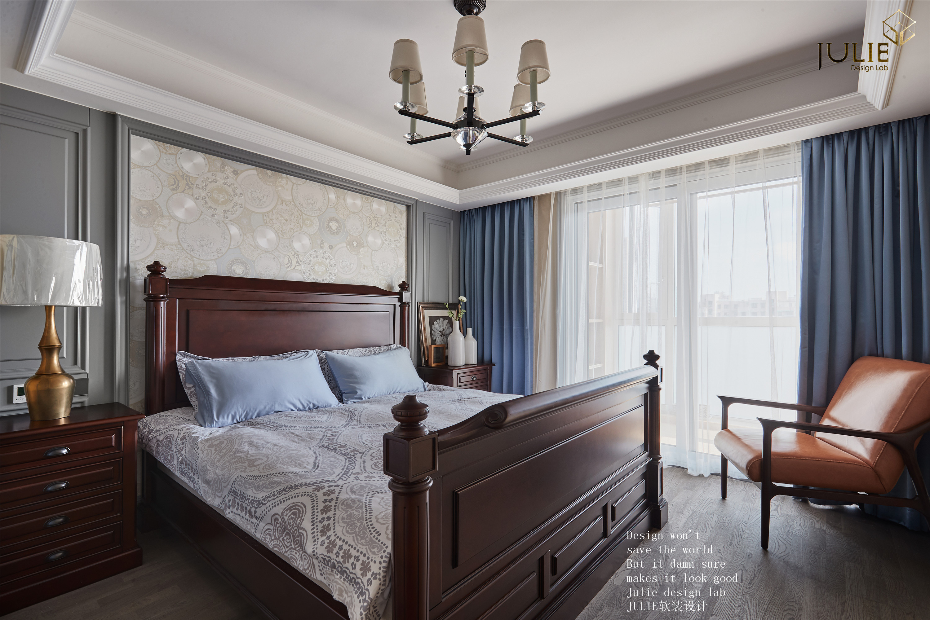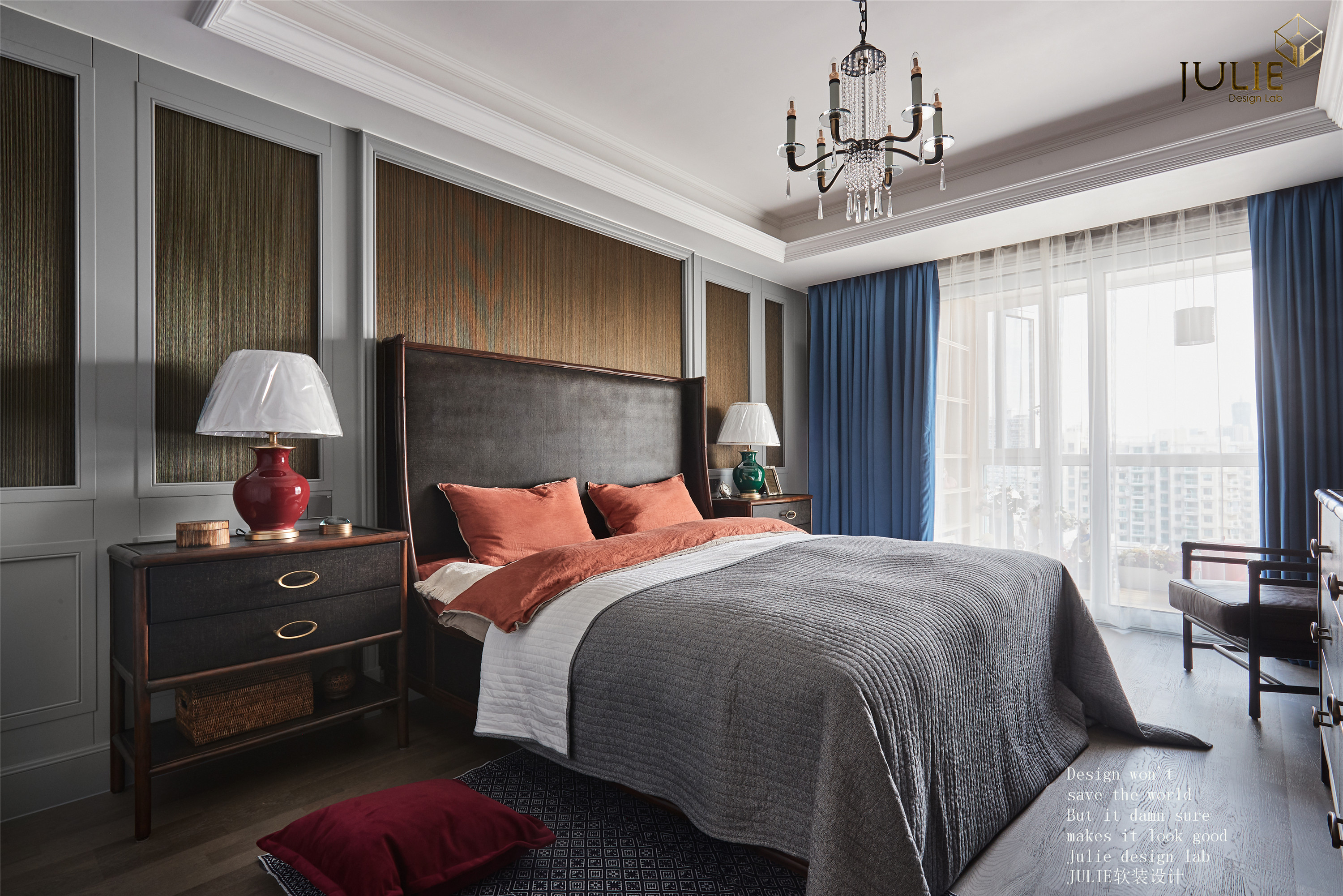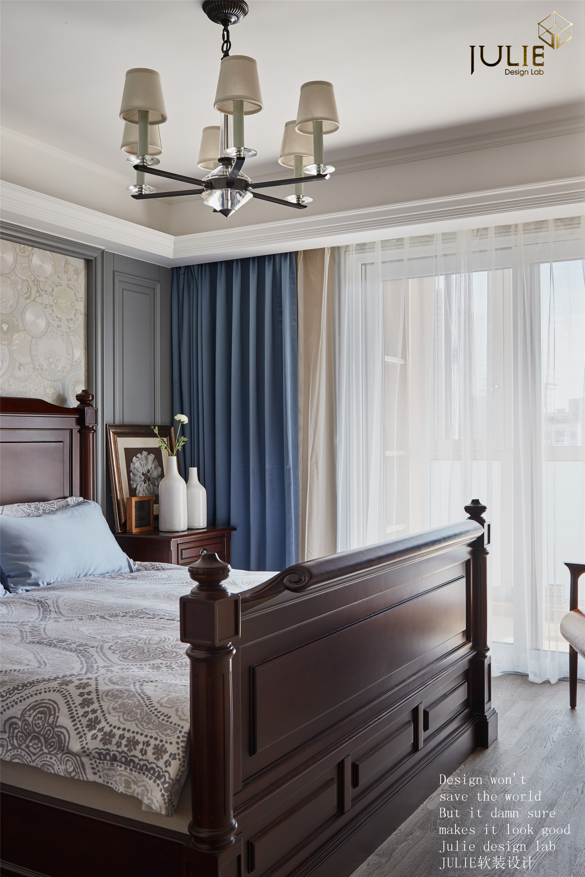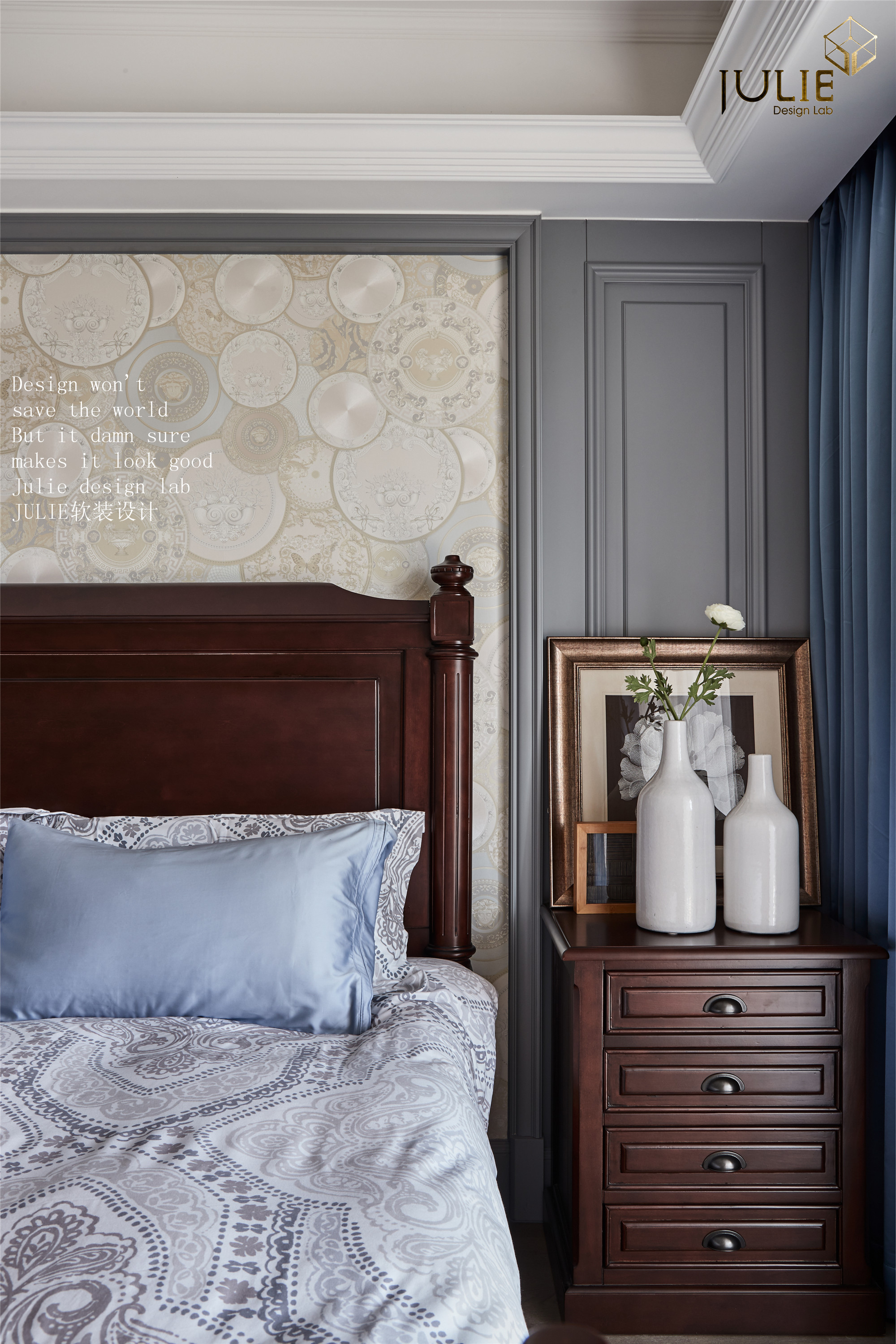 空间布局:走入客厅,被整面背景墙震撼到了。精致的美式护墙,让壁炉与书柜完美的结合,灰色又让木质更赋现代时尚元素,稳重而大气。个性的蓝绿色沙发,为空间增添了一丝活力,搭配黑色方形茶几与同色系单椅,让空间更加的完整统一。