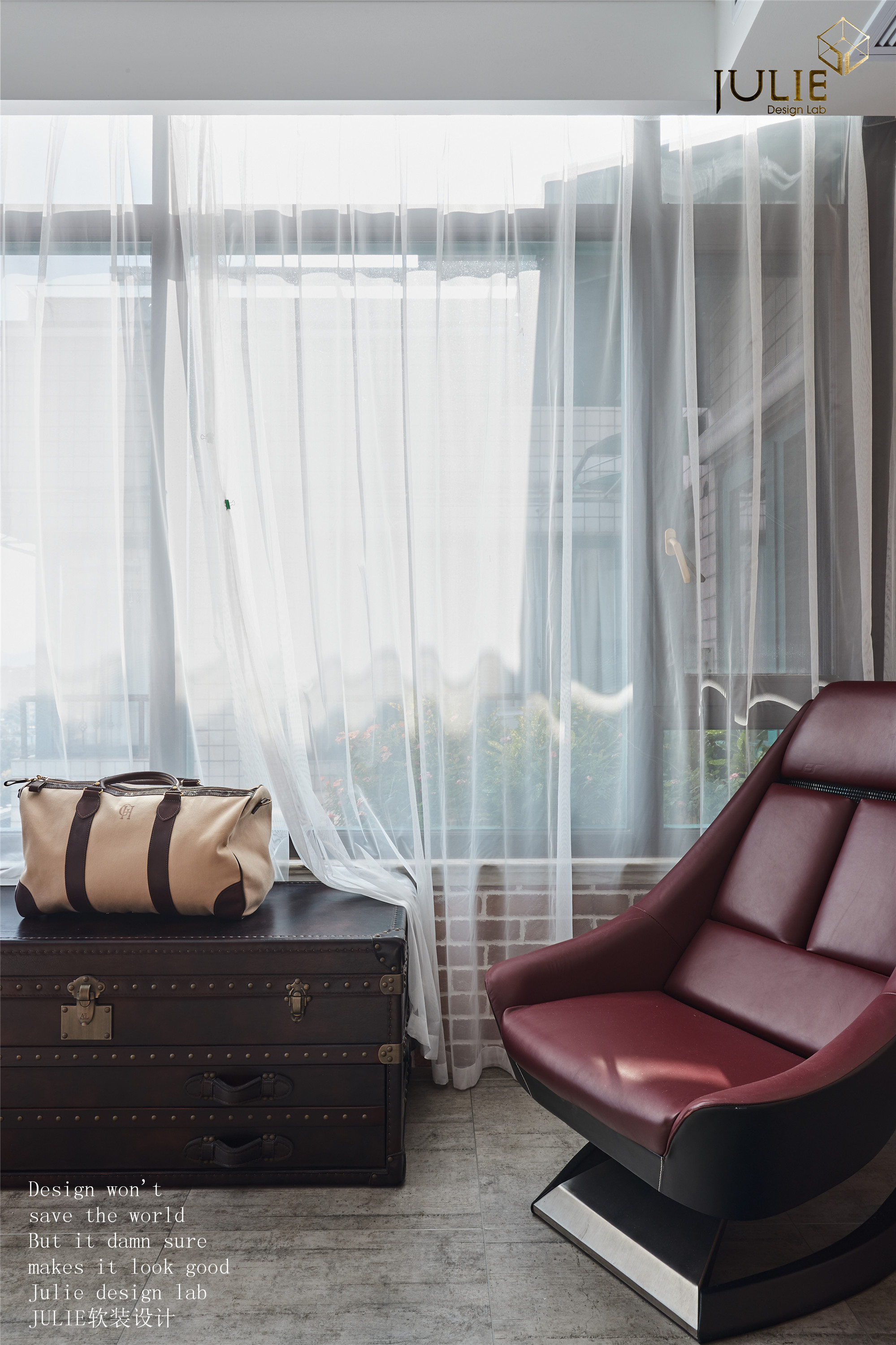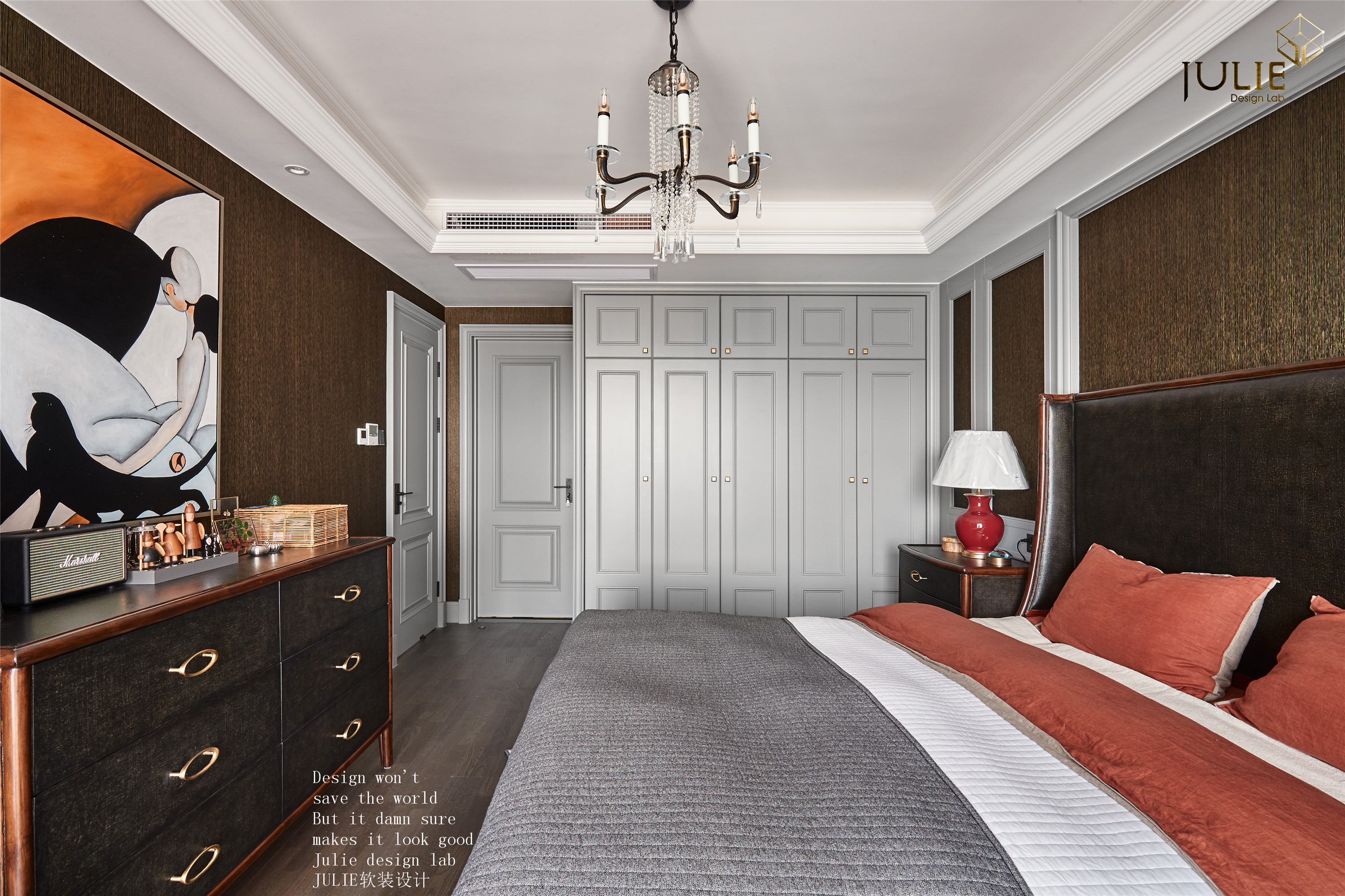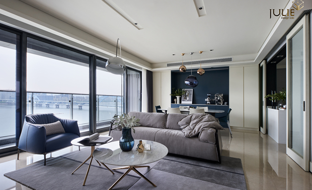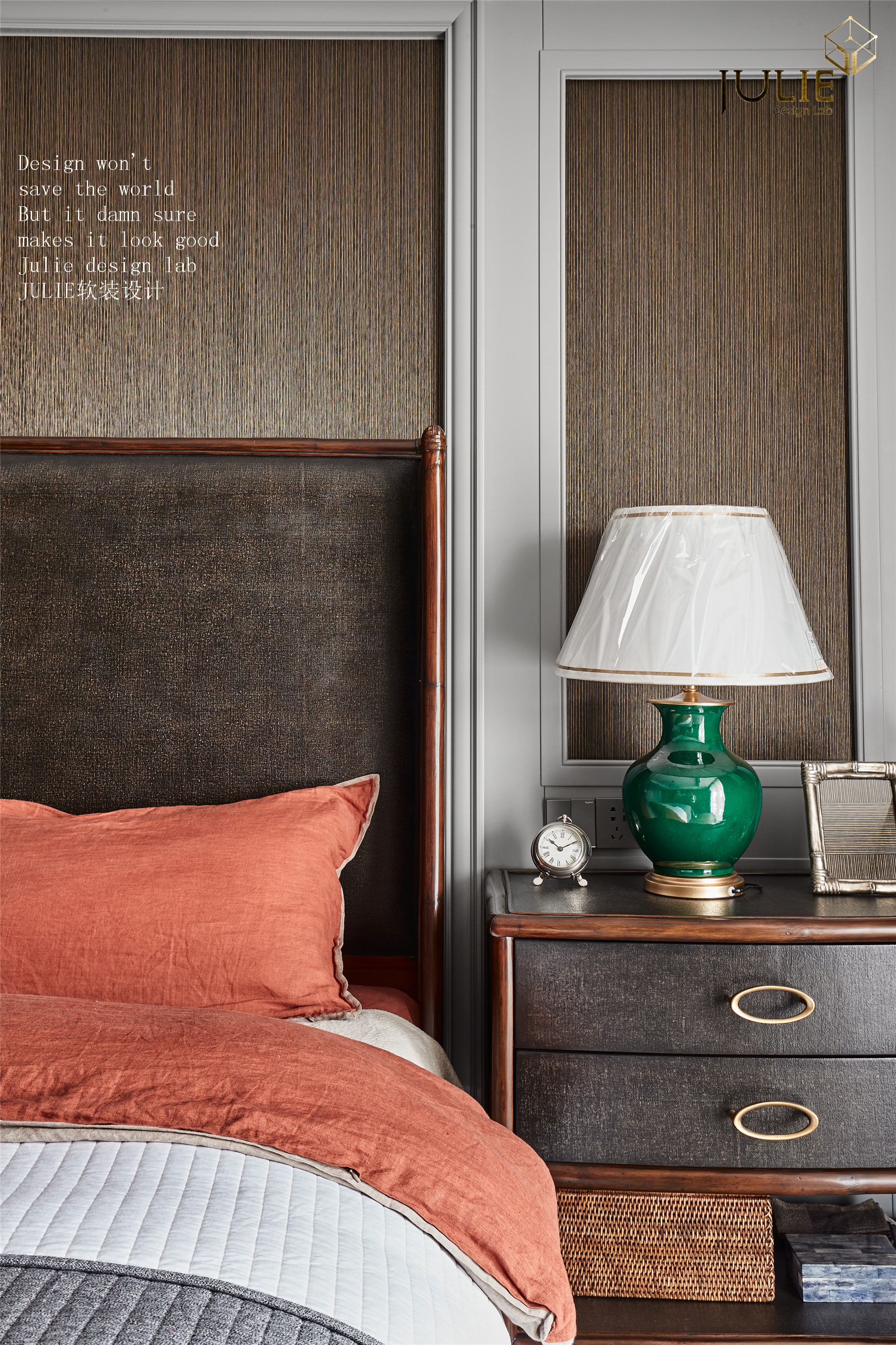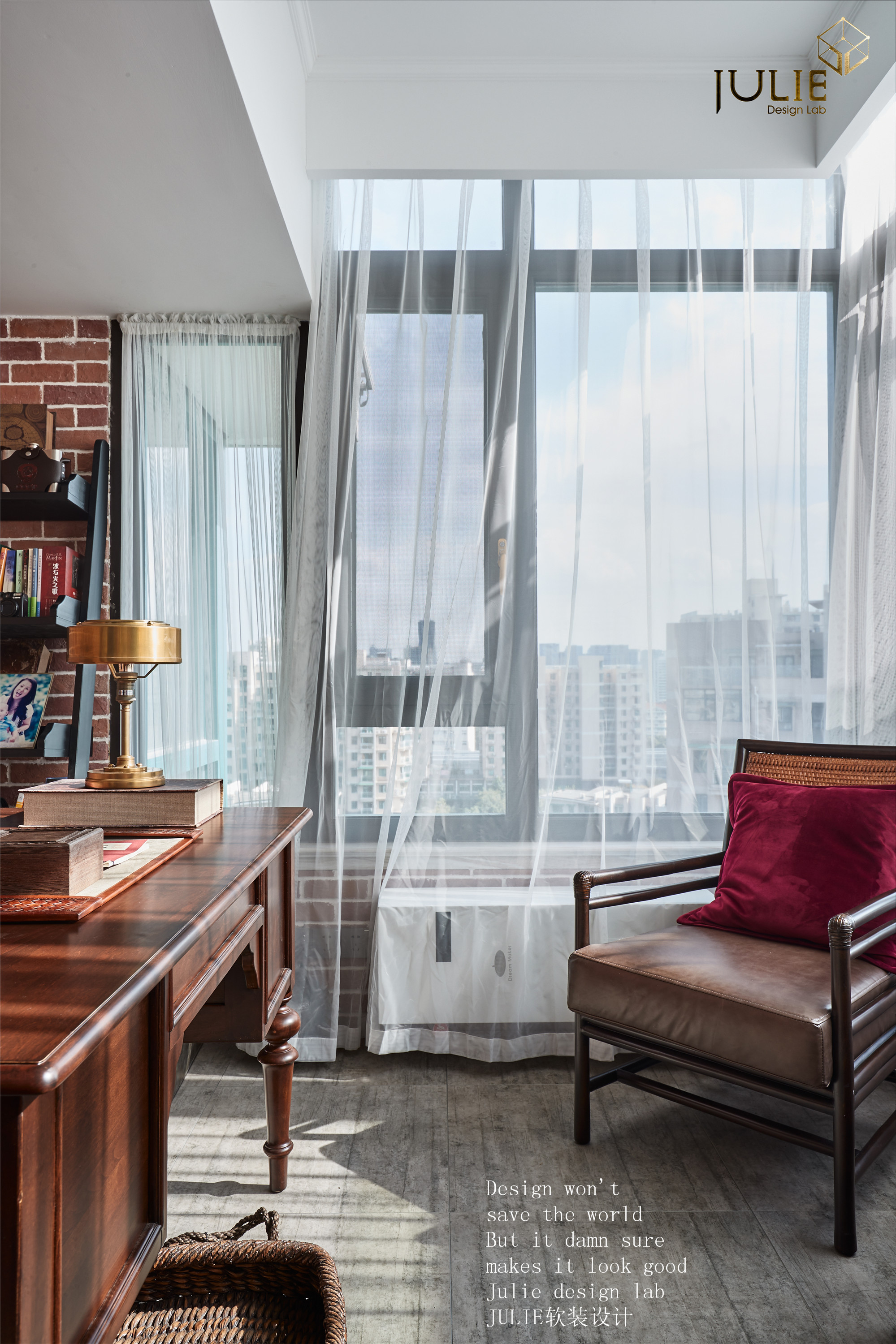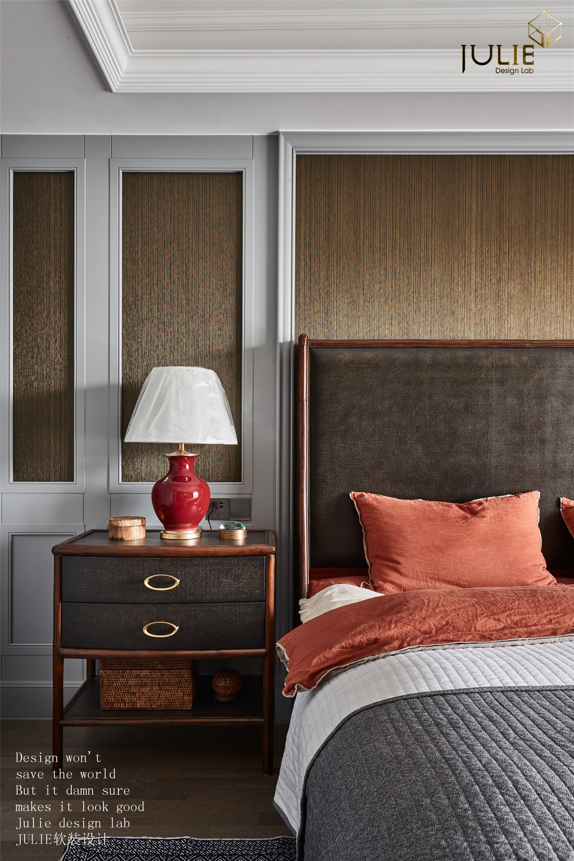 空间布局:走入客厅,被整面背景墙震撼到了。精致的美式护墙,让壁炉与书柜完美的结合,灰色又让木质更赋现代时尚元素,稳重而大气。个性的蓝绿色沙发,为空间增添了一丝活力,搭配黑色方形茶几与同色系单椅,让空间更加的完整统一。