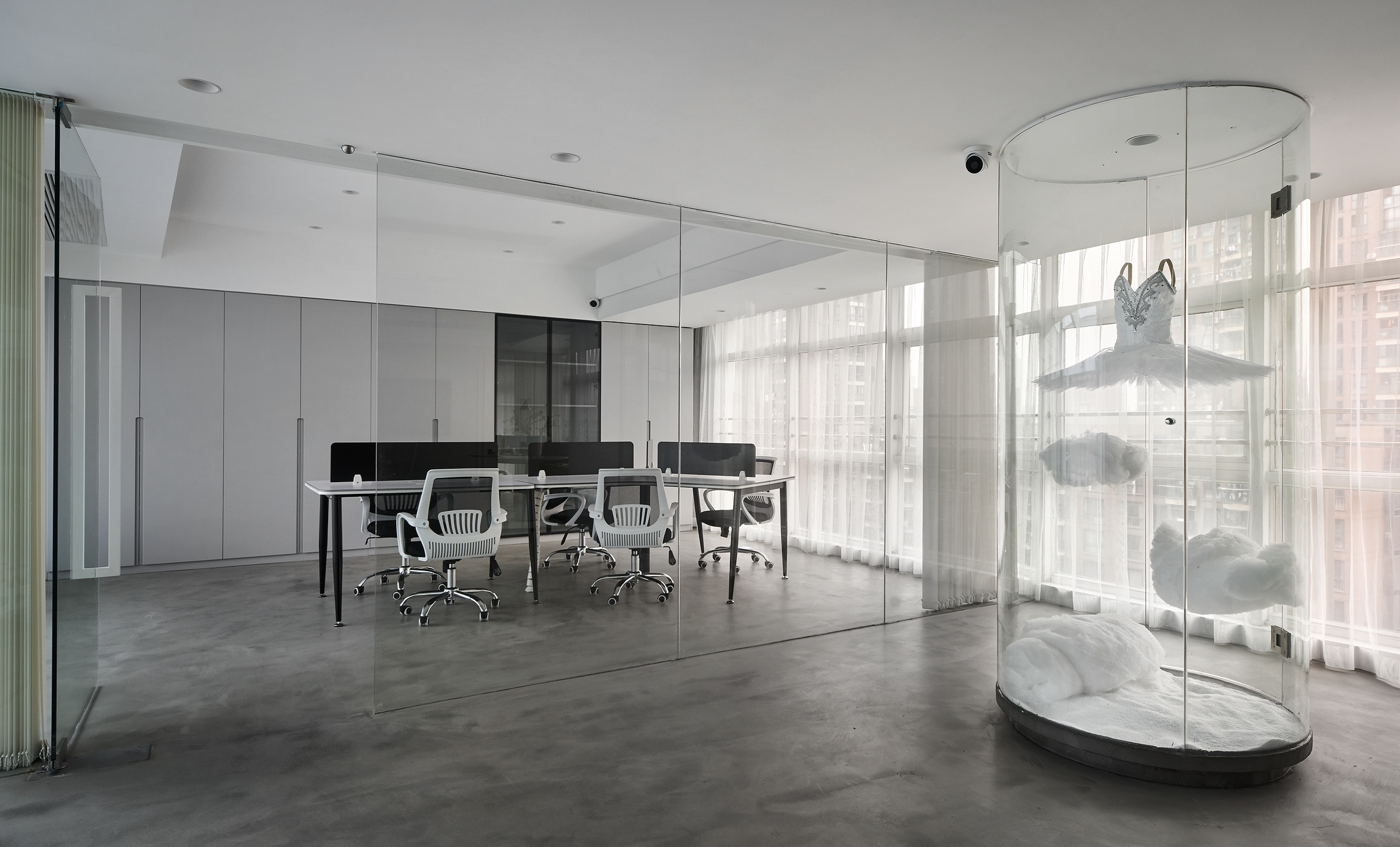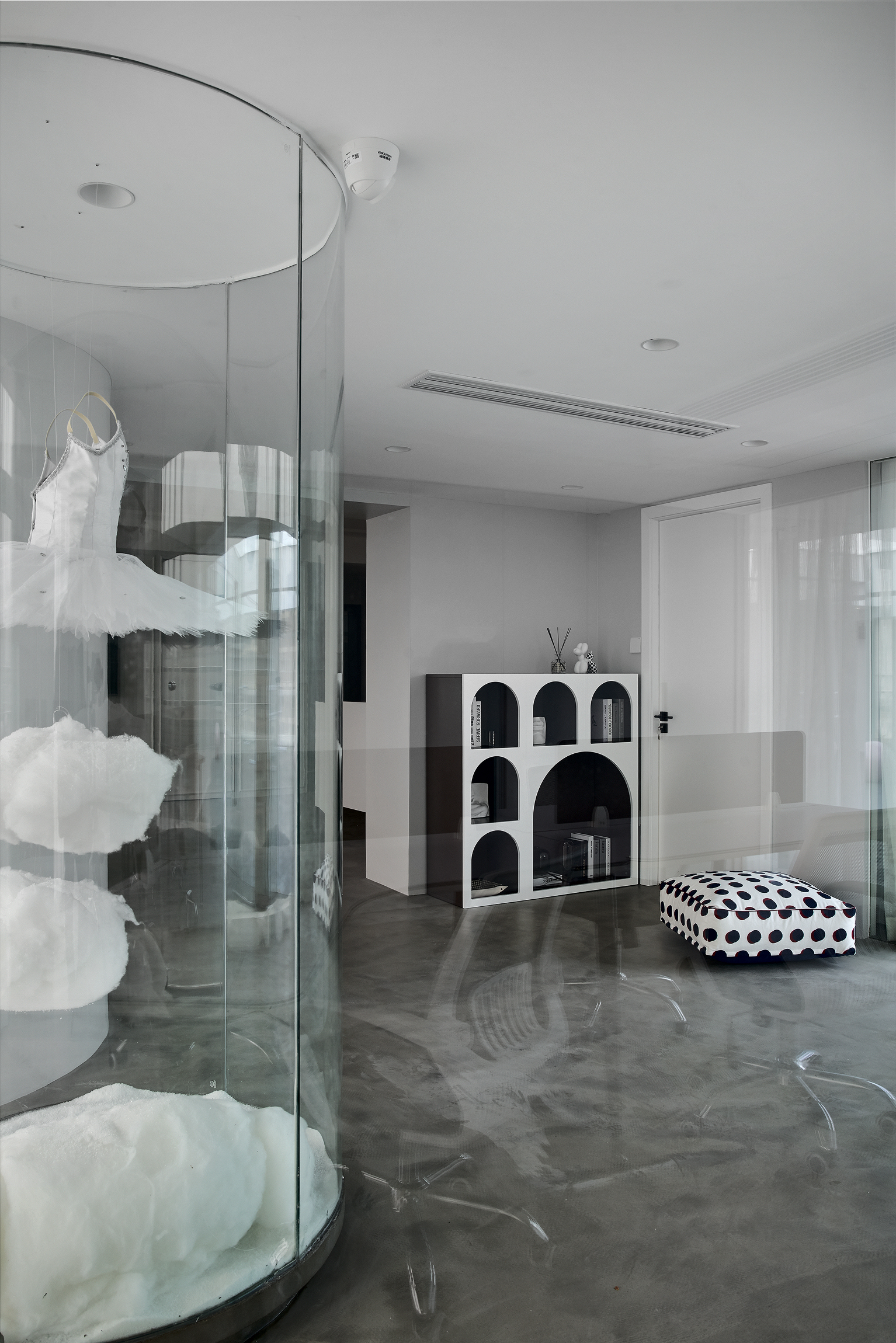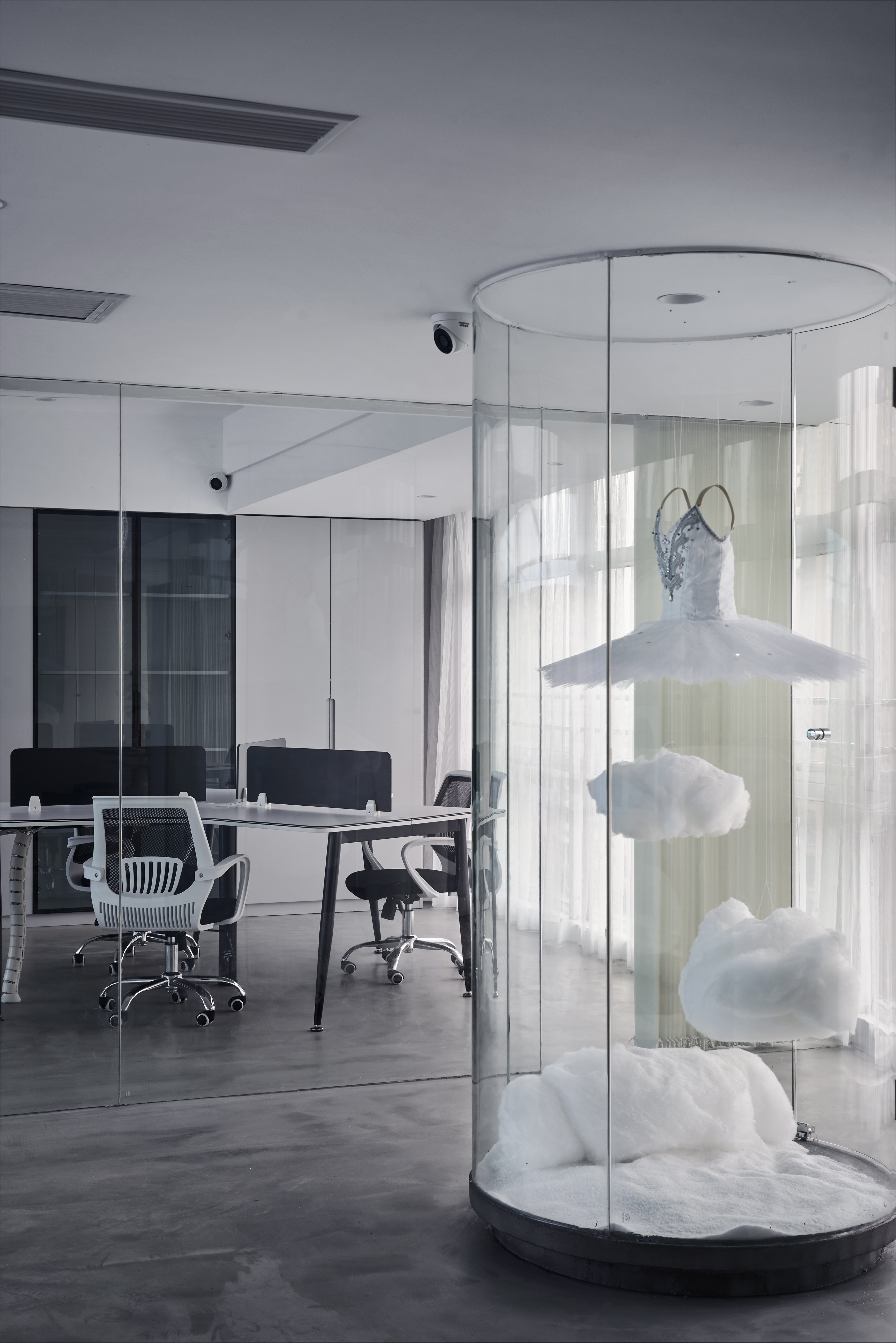 空间布局:圆柱形的玻璃橱窗使空间更加的通透,高洁优雅。芭蕾舞裙与白色云朵搭配,空灵梦幻,芭蕾舞女孩们梦的开始。