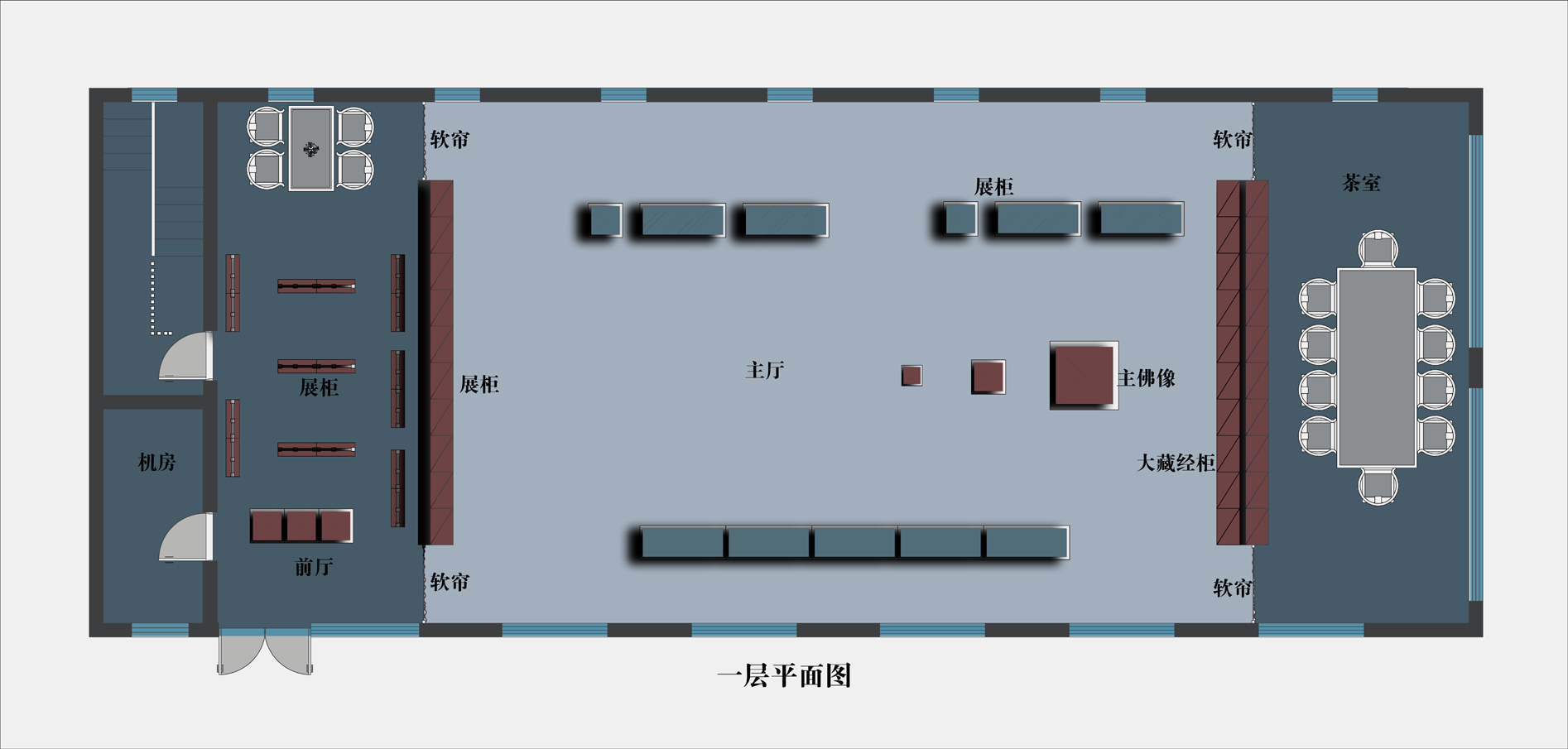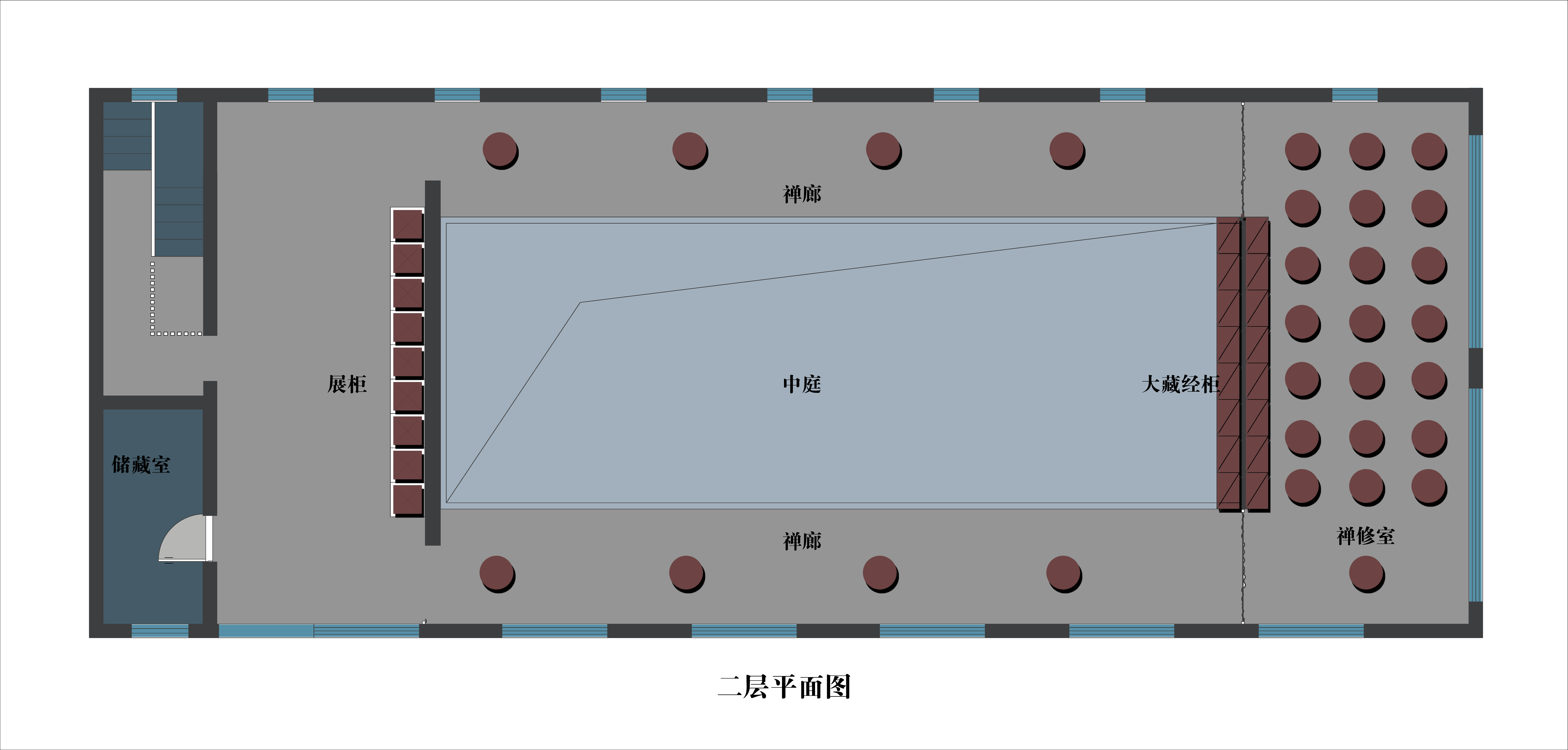 空间布局:空间布局上,考虑到整个场域的特定性,所以考虑设计了一个高6米的中庭层高,体现出这种精神层面的庄严感以及恭敬心,在空间的布局上通过中式的对称手法,让空间比较稳定,回廊的设计让其有展示的特性也有功能上的功用,而主人收藏的精品唐卡,又可以作为修行者观想的灵魂导师,特意体现出既美观又实用的融合。