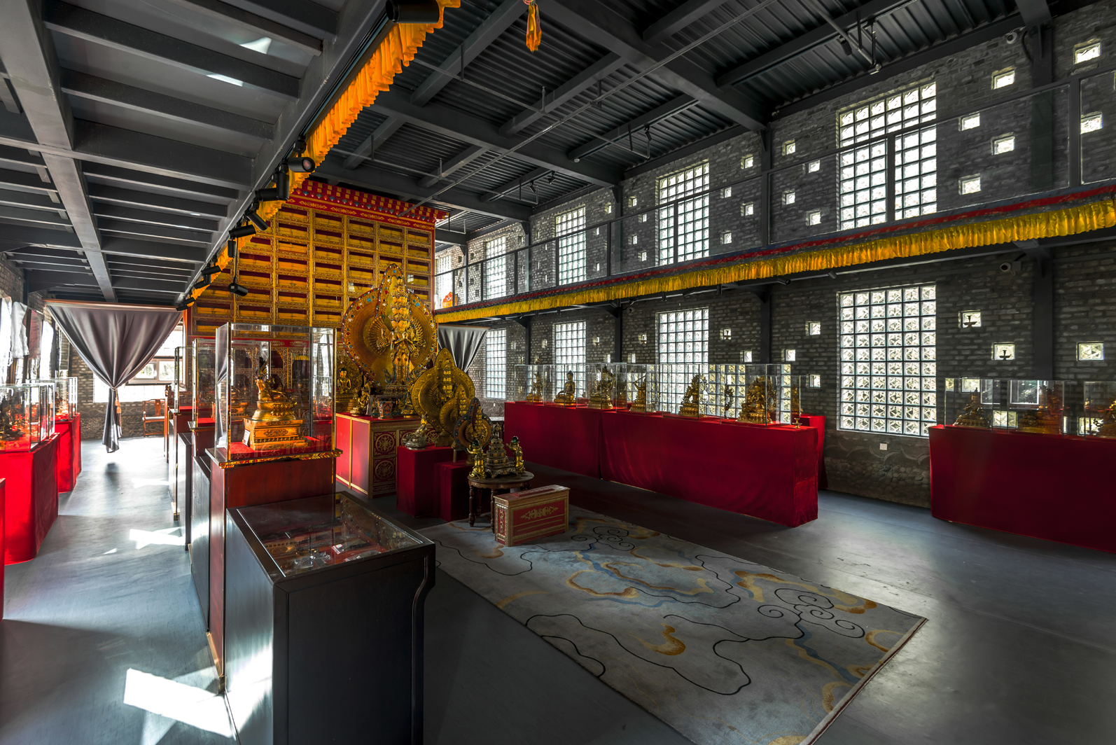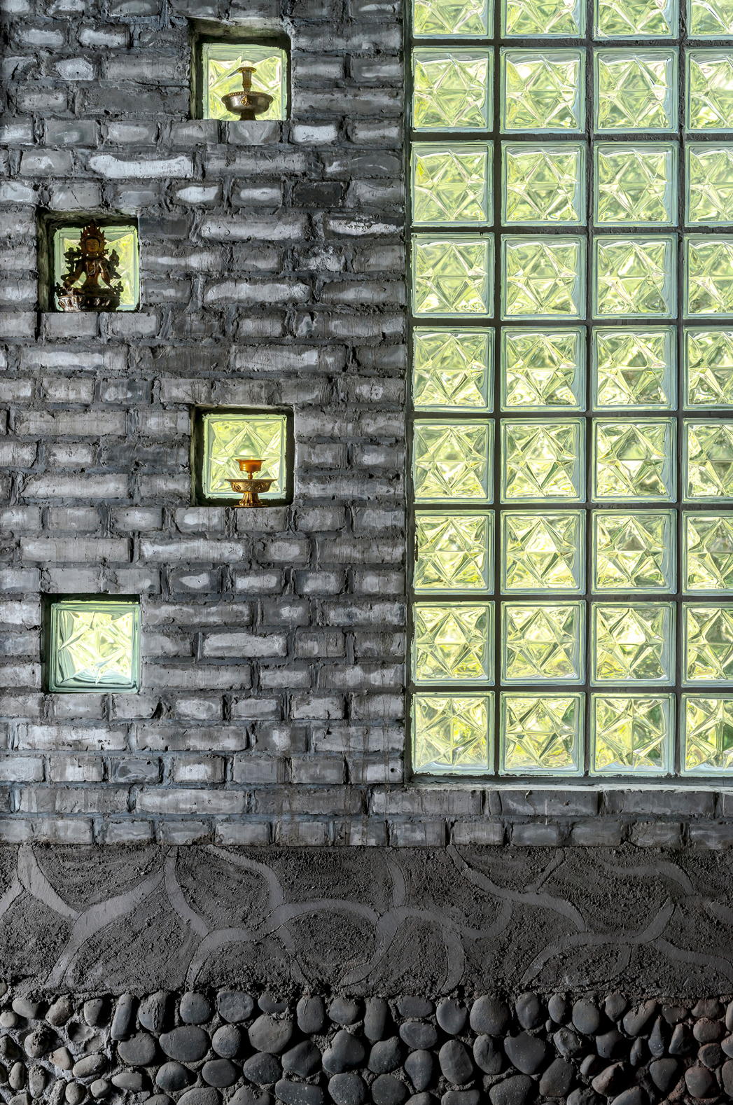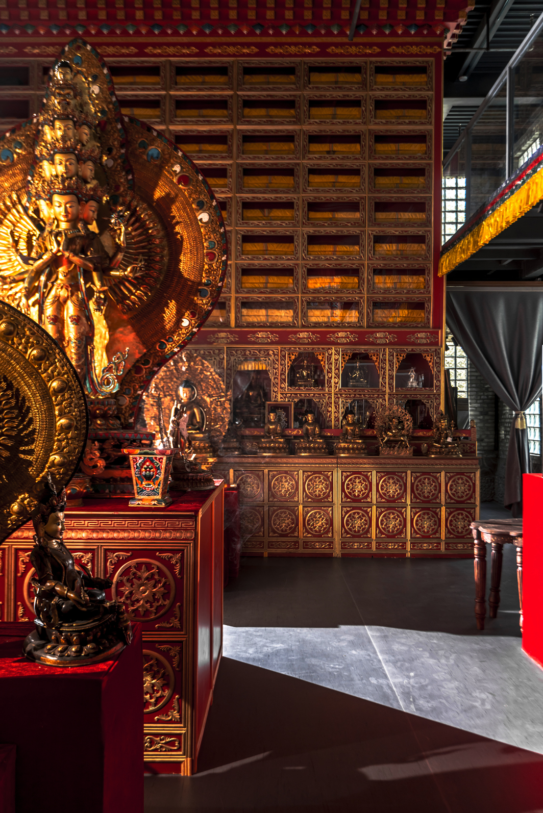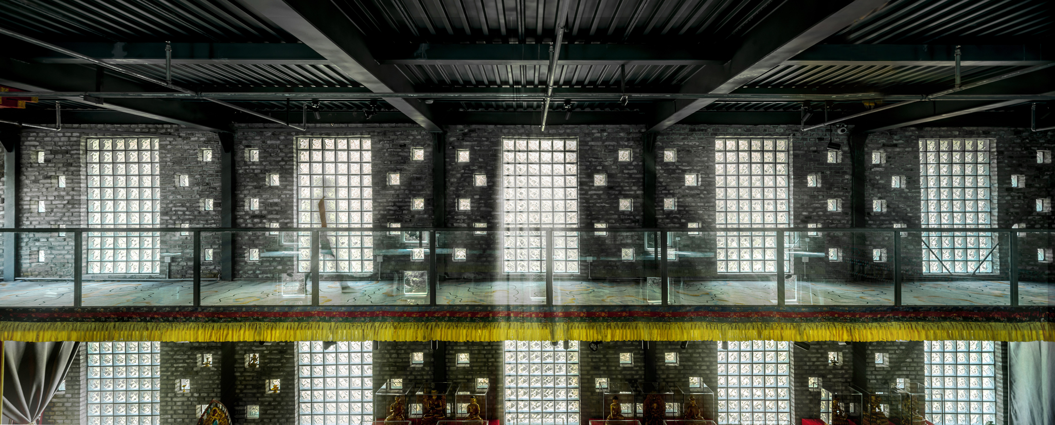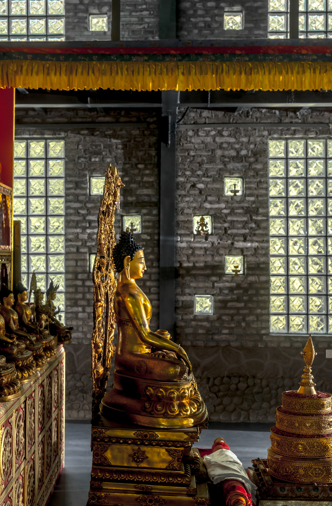 点线面的对比,灰色的墙砖与鎏金的佛像形成视觉的反差,但又不失协调。