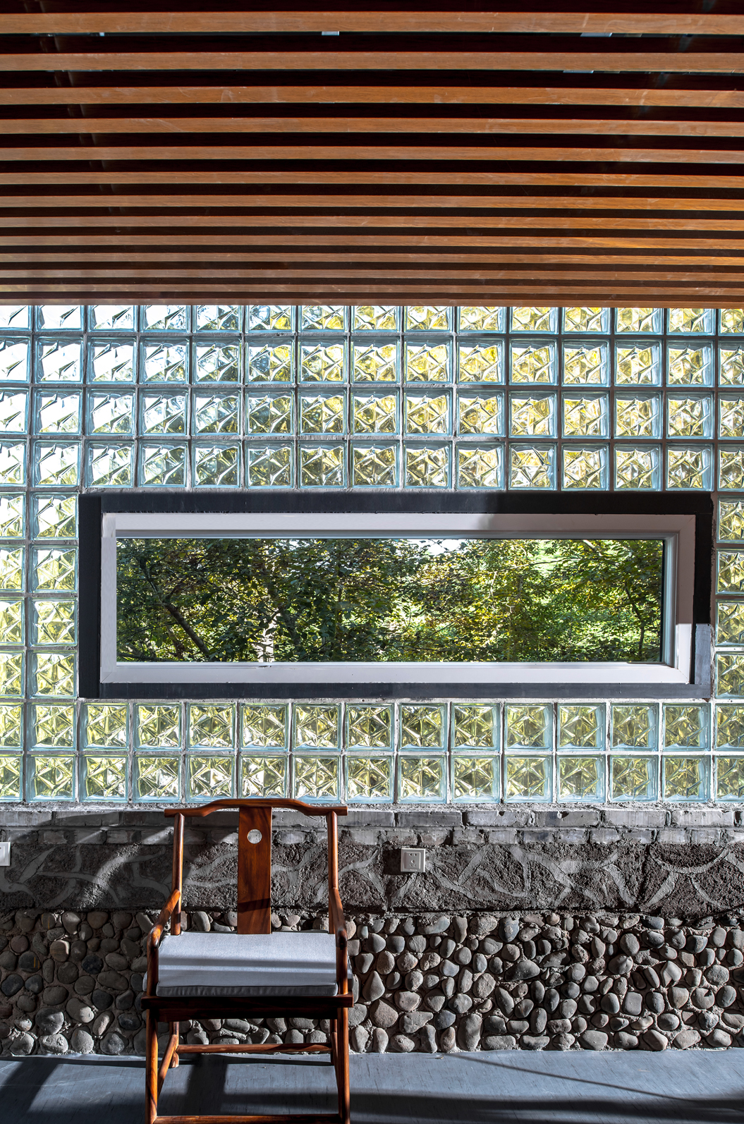 一把禅椅,坐于其上,观修自心,朴素的水泥,无序的鹅卵石,横竖线的交割,无不体现空间的形式美,宁静包容。