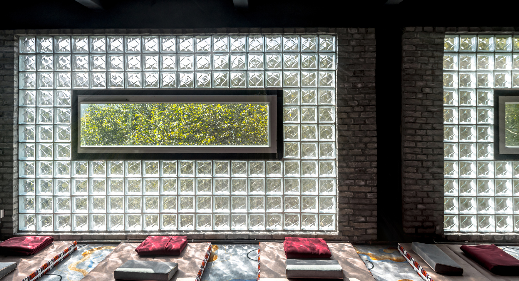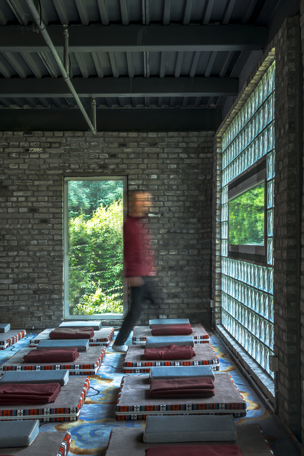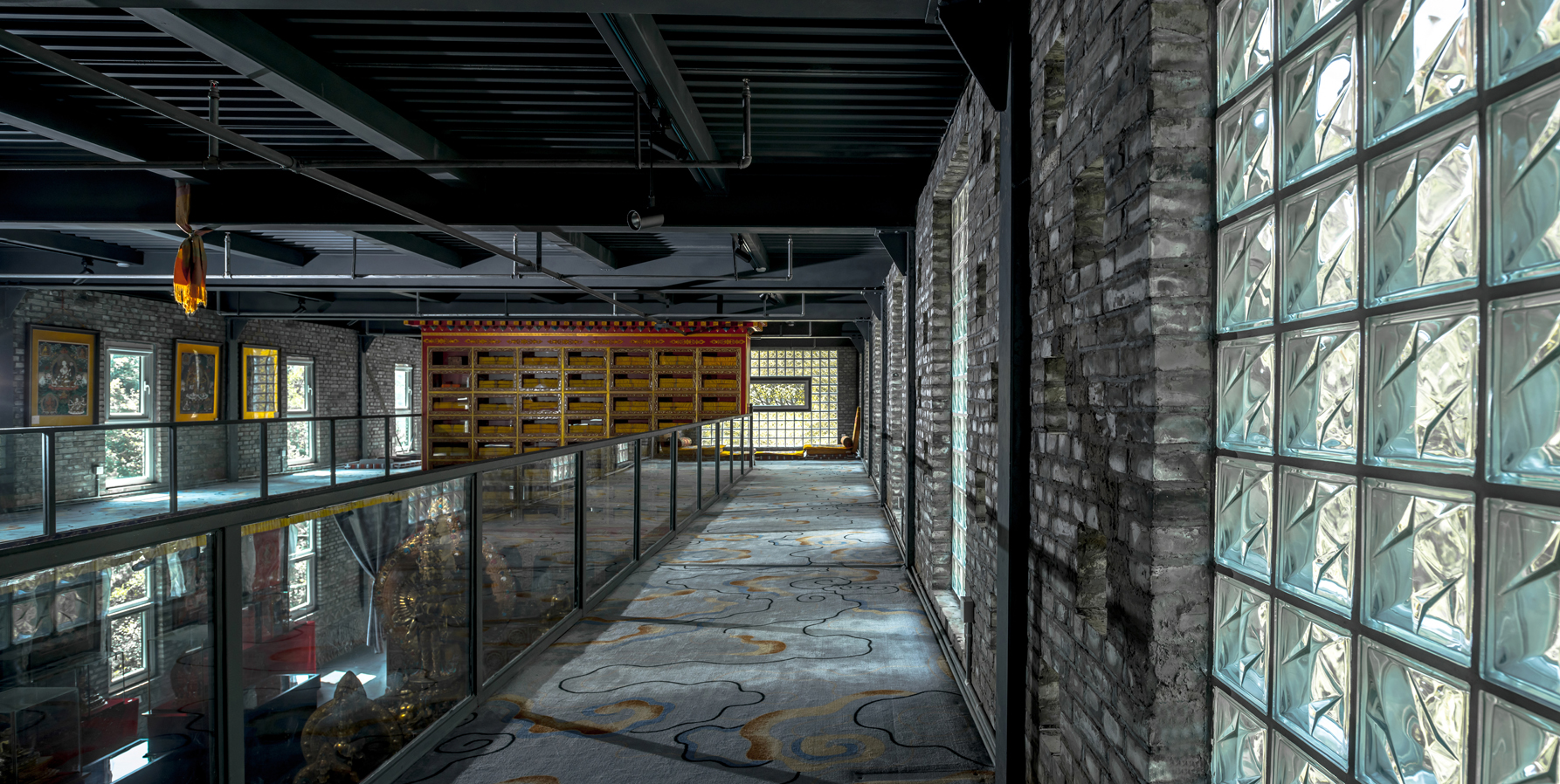 二层走廊右侧,玻璃砖的实用引进光线,斑驳的光影让空间多了一些灵动,配以青砖的古朴,让空间安静,地面地毯的跳色又不至于使得空间单调。