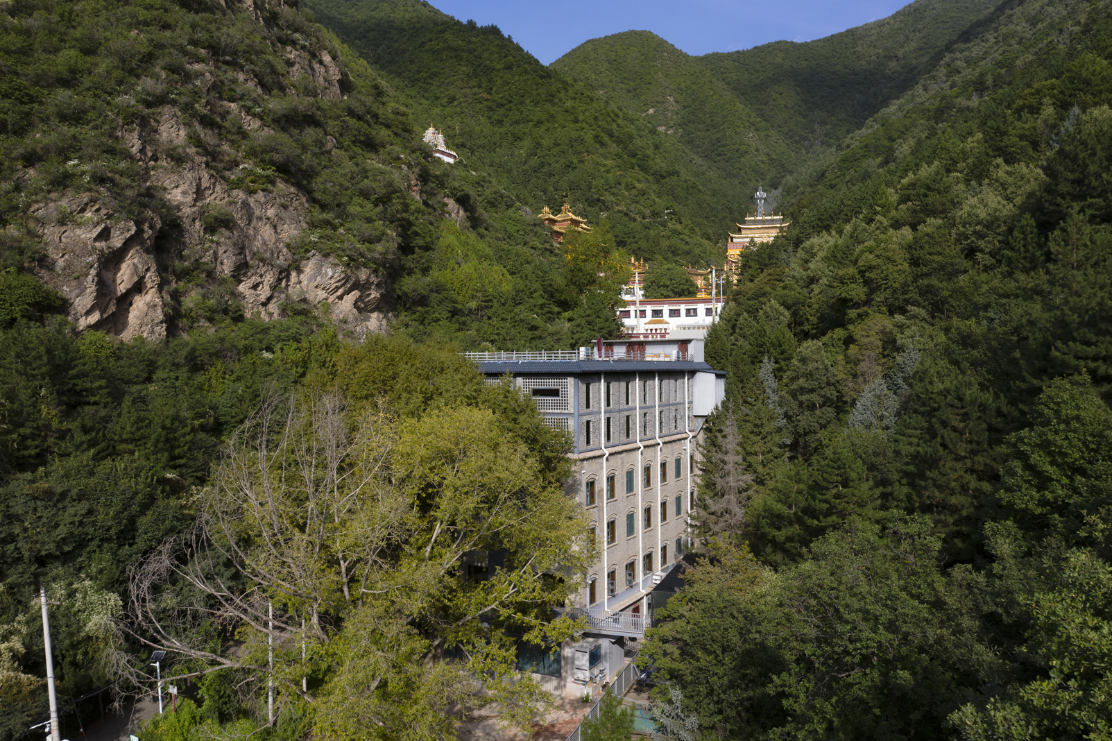 藏于深山怀抱中的心灵之所,远处隐现出一个金碧辉煌的寺院金顶,让这个禅修的空间多了一个让人来的理由,千年古刹旁的禅修之所。