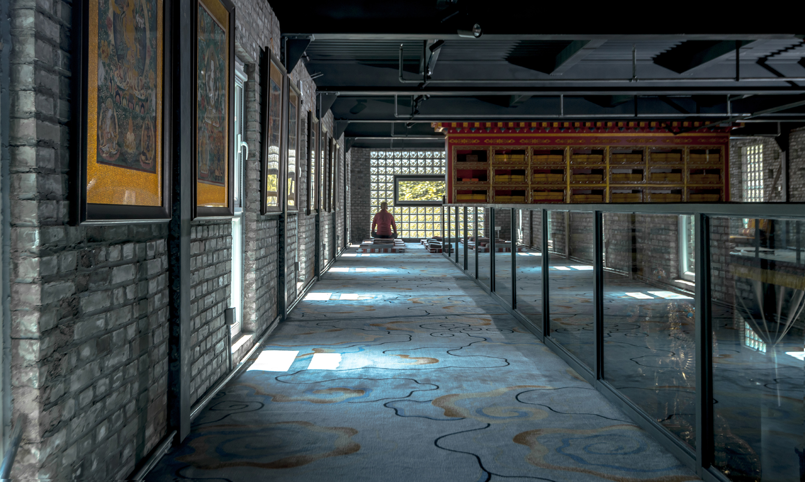 二层走廊左侧,设置窗户,用于空气的流通,墙面挂饰用于禅修的静美唐卡,既美化了空间,又对于有信仰的人来说是一个观想的精神需求,有功能又有空间装饰的作用,实用与功能相结合