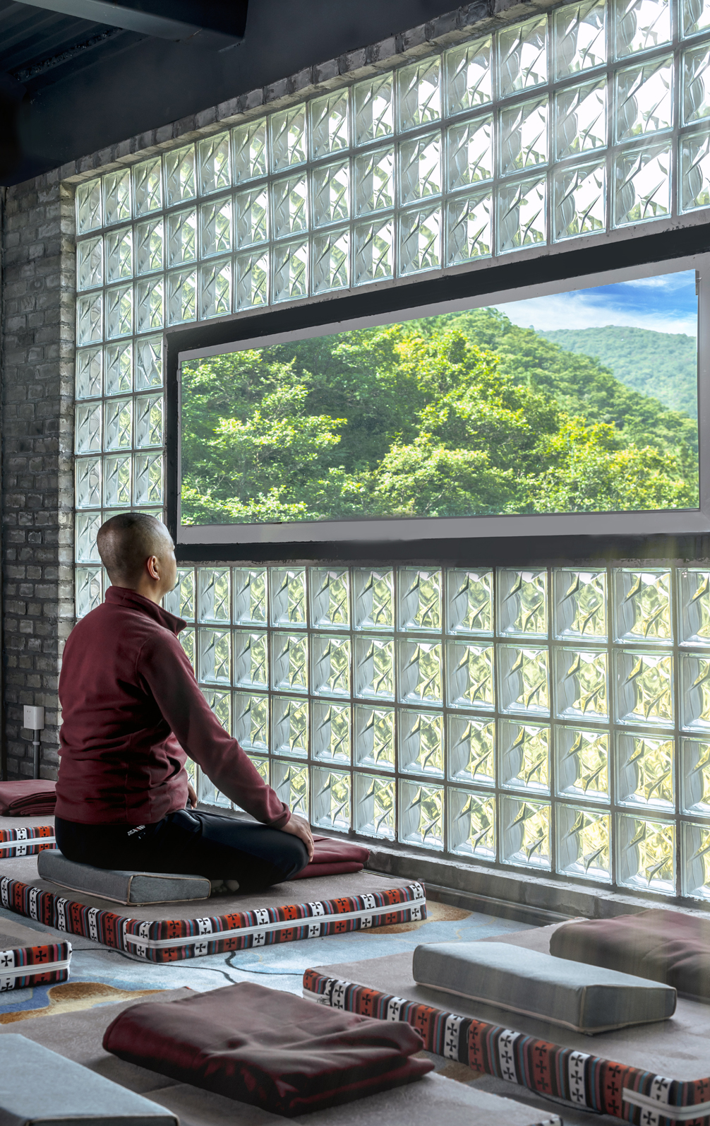 二层禅修空间,大体量的玻璃砖使用,引进室外光线,横向窗户引入室外的景色,阳光洒进空间,安静的享受这纯静的空间。只有光与影,内与外的体悟。