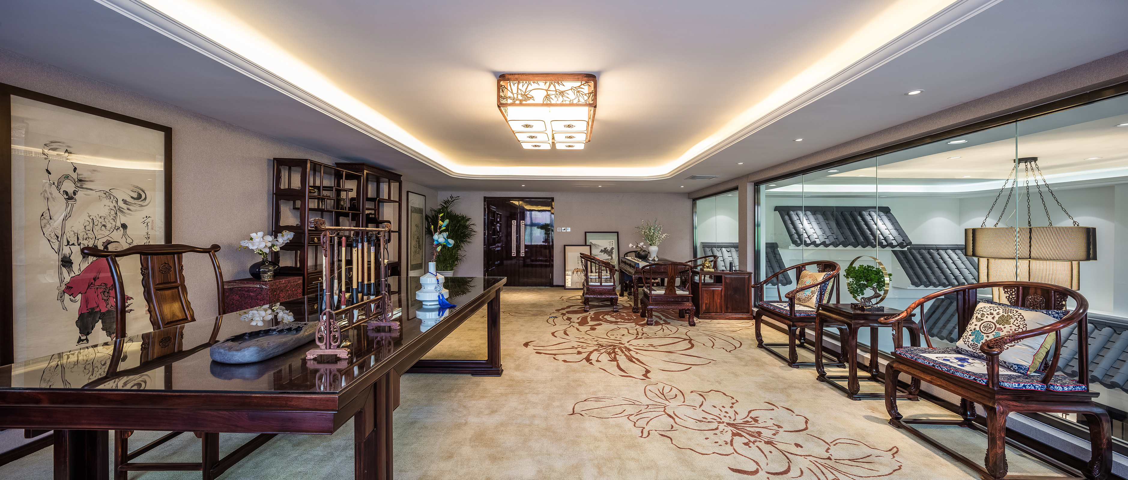 会所书画室靠近共享的的两面墙是玻璃隔断,从里面往外看可以看见高挑的屋脊。书画室更多的采用中式元素。墙面正中央点缀意境深远的水墨画,给此空间增加了文人气质的中式力量,以及搭配质感奢华的摆件、博古架,明清时代的红木座椅,达到静逸微妙的空间。简约台灯、点缀三两花枝的青花瓷、自然意趣玻璃绿植摆件,在空间融合汇聚,自然洒脱。
