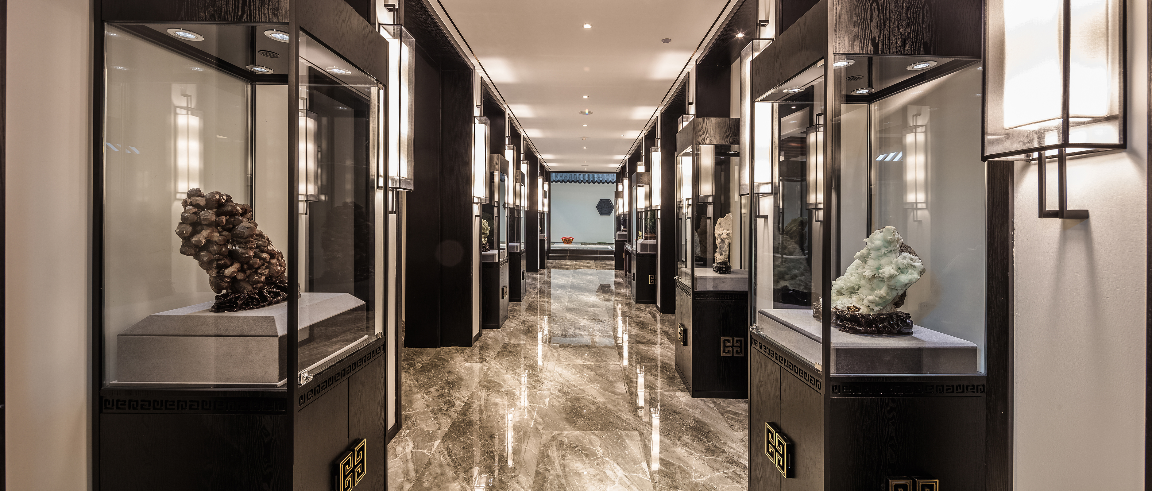 走廊两边做垭口处理,将原有的错综的门口融合在一起显得没有那么突兀。在走廊两侧分别陈列了古代的木雕、玉石等摆设,很大程度上突显了中国文化的底蕴。