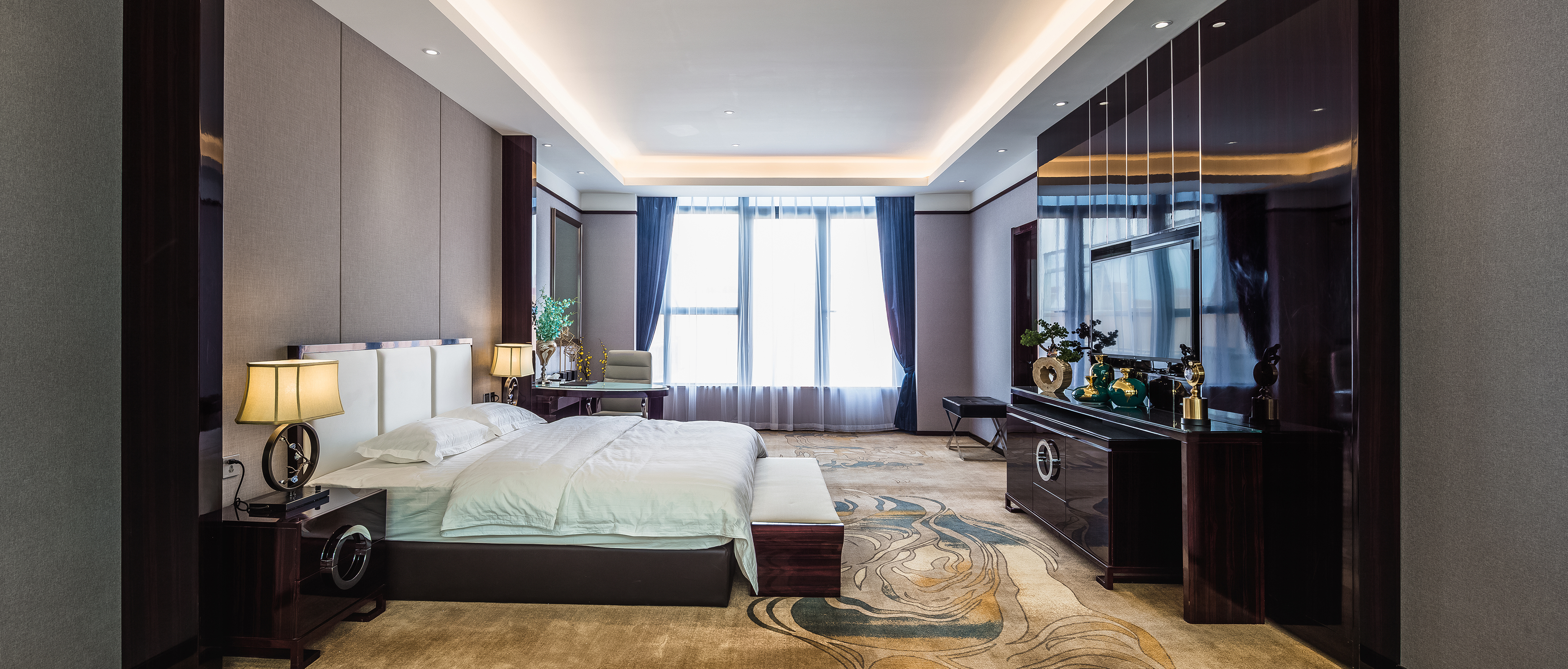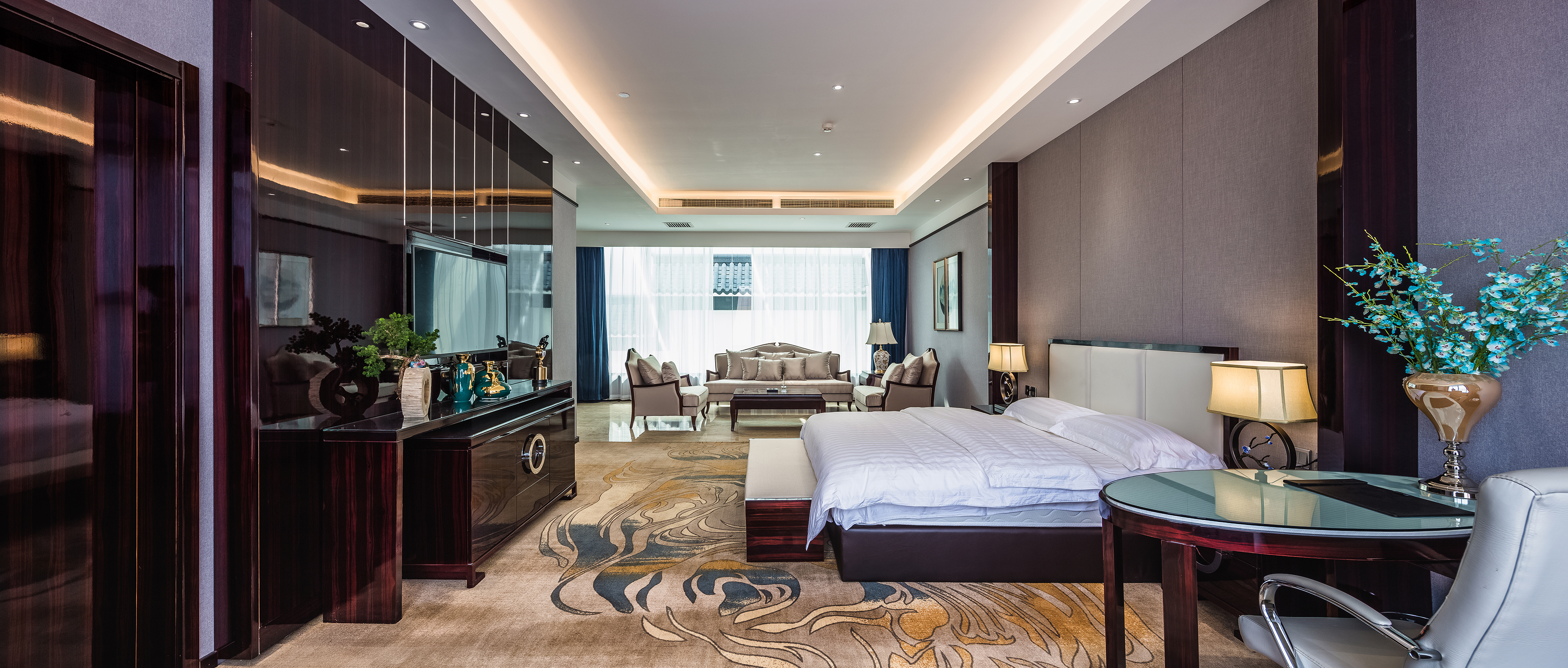 套房设计中,均衡感、色彩、节奏、工艺......均契合设计中共同认知的形式美法则,在调和对比、多样统一中,营造出和谐纯净、怡然清幽的氛围。几何曲线图案的咖色地毯,写意自然的花鸟图,在冲突中体现设计的创见和动态的和谐美。
