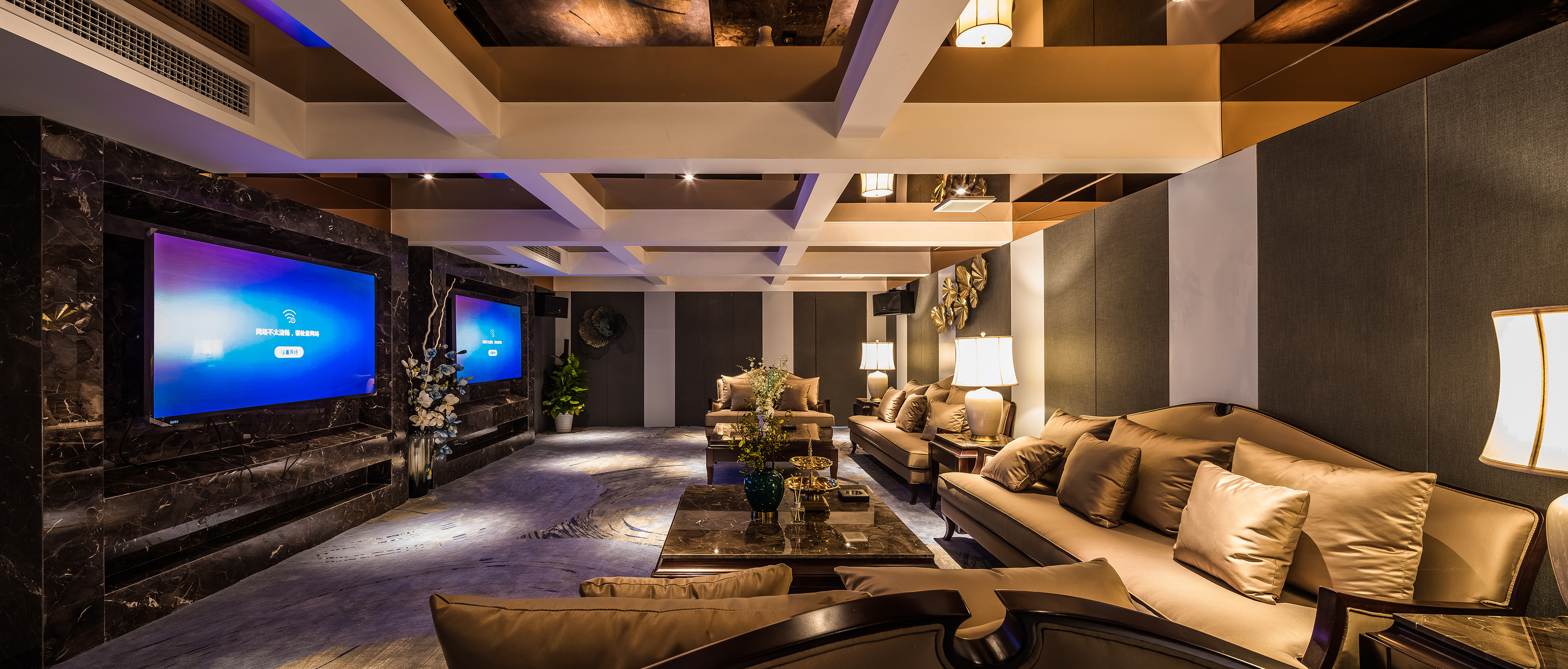 影音室背景墙采用黑金花石材,顶面石膏板假梁搭配茶镜,色彩上,采用统一的灰色调,而放松休闲的自然空间,配上温馨的暖光源。进而体现空间的浪漫与温馨。