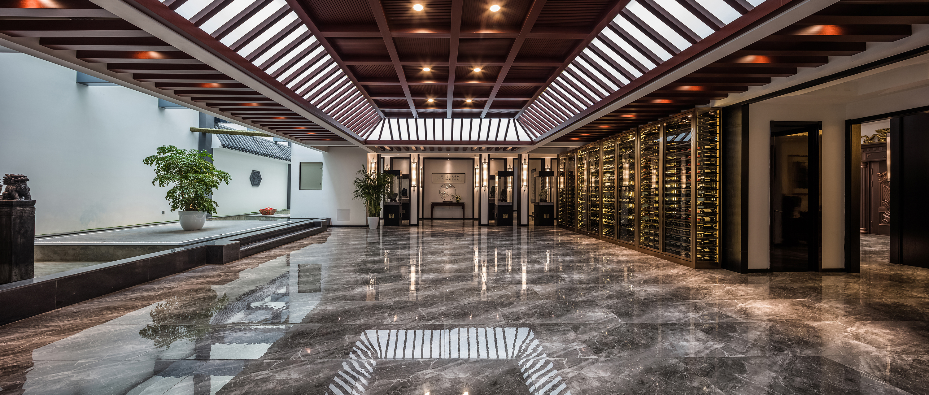 会所的共享区做了水系处理。墙面也做灰色屋脊,墙面点缀灰色砖雕,搭配中式大吊灯。空间整体色调干净、高雅。顶面是全封闭天窗,天窗做电动遮阳蓬,打开之后如同在室外一样。水系中设计了舞台。水系连接了品酒区,走廊和宴会厅。使得各个功能区之间在相对独立的基础上保持相互呼应,有机融合,并为宾客在内场走动路线上形成客观引导作用。借用中国传统手法上的水榭楼阁,窗花月洞,斗拱凿井,流水连廊等各式形态,使整体空间所呈现的气质上成功规避了浮躁,奢华;代之以轻柔、儒雅、别致的大家之气。