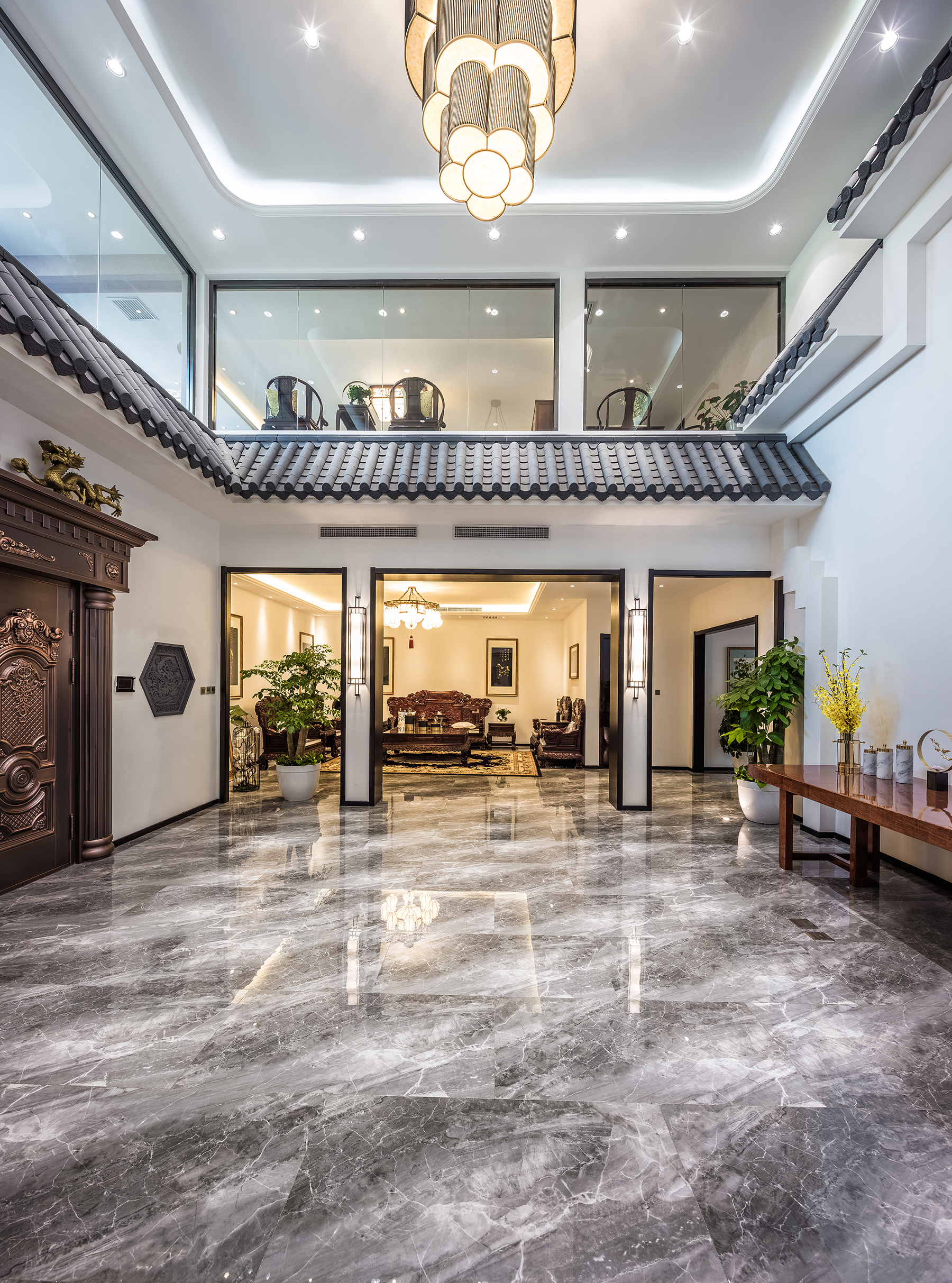 项目设计与建筑的中式风格相呼应,以新中式的折中手法,将具有徽派建筑特色的马头墙、小青瓦运用在设计中,在建筑雕刻艺术融石雕、砖雕为一体,显得富丽堂皇。