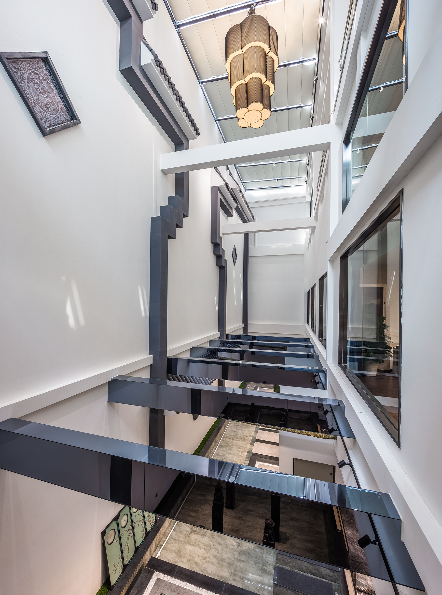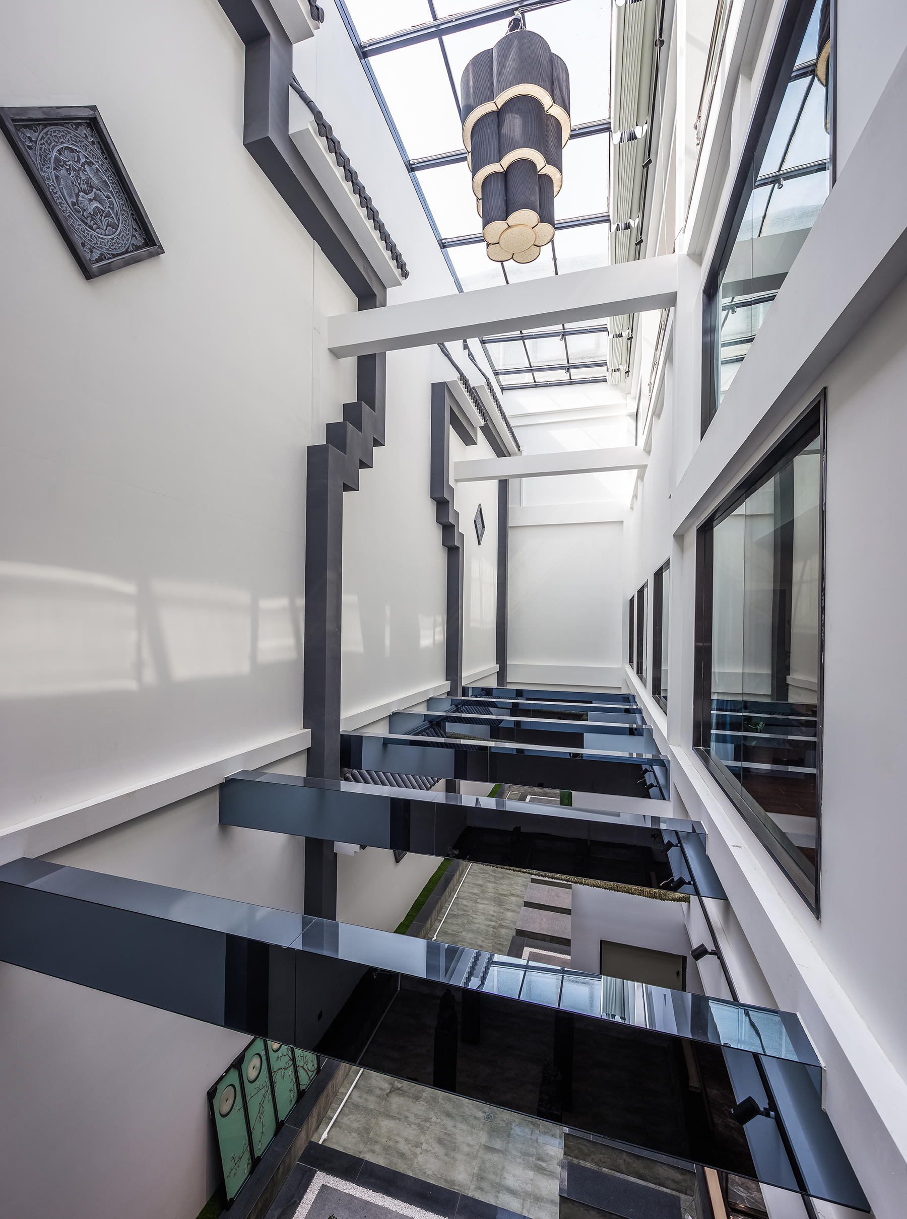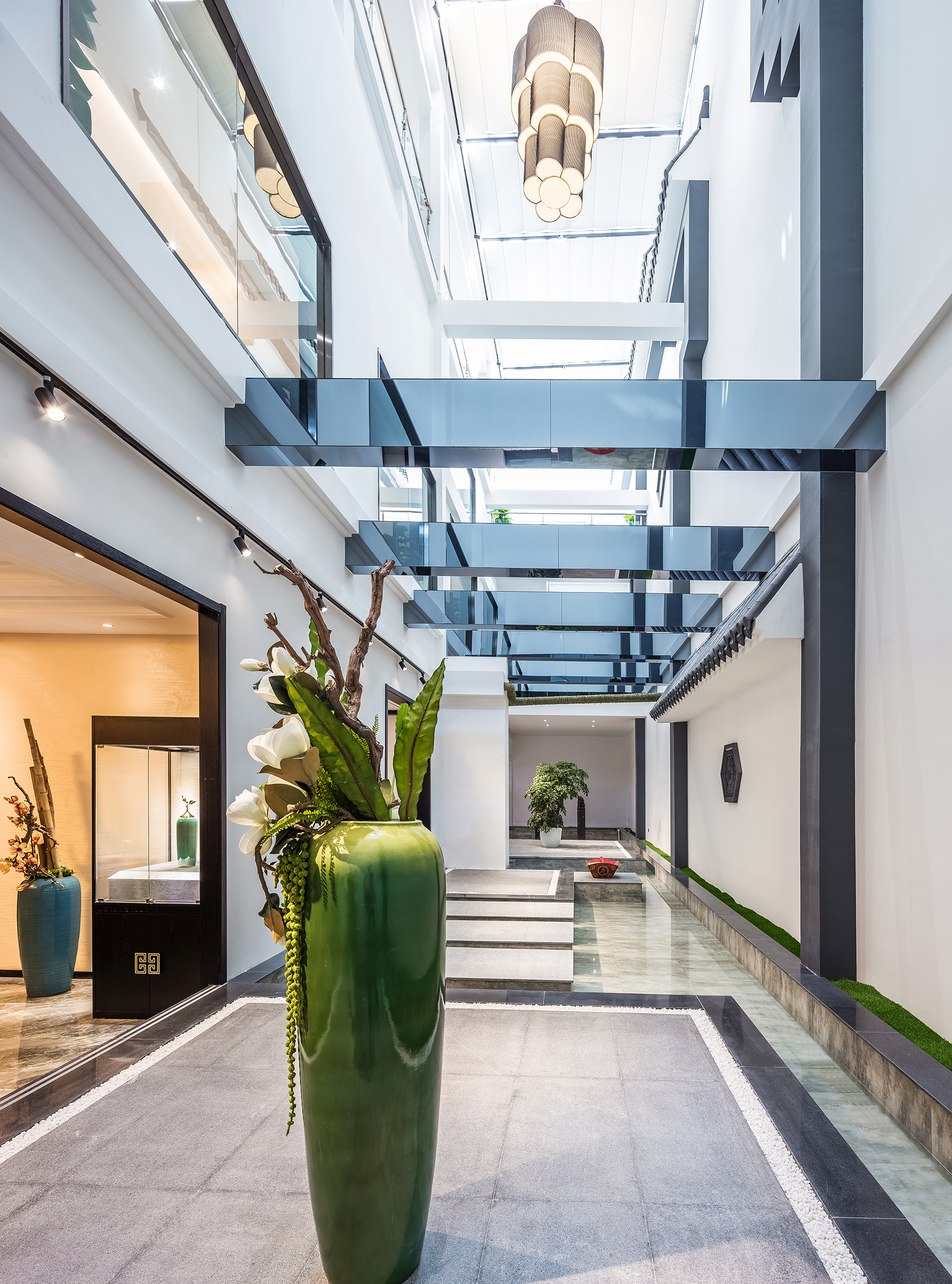 会所分为休闲洽谈、餐饮接待、休闲娱乐、住宿等多个区域。设计师从中国传统艺术文化中提取相关元素,在会所内步入大堂,中轴的端景在灰白基底的映衬下,显得惊艳而内敛,高墙封闭,马头翘角,墙线错落有致,灰瓦白墙,色彩典雅大方。
