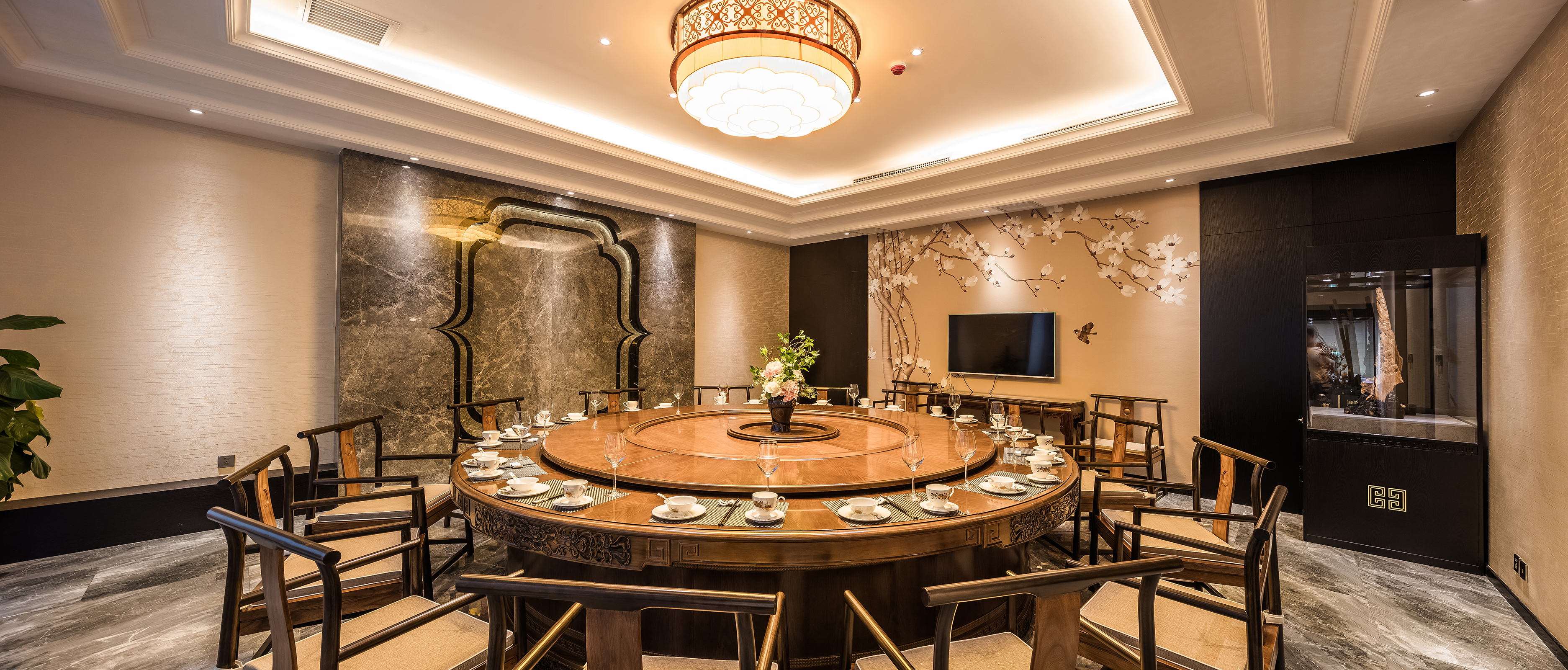 会所宴会厅采用古堡灰石材勾勒出的莲花型背景,搭配中式的壁画,点缀耀眼的中式灯,营造高雅贵气的就餐空间,提升整体品质。