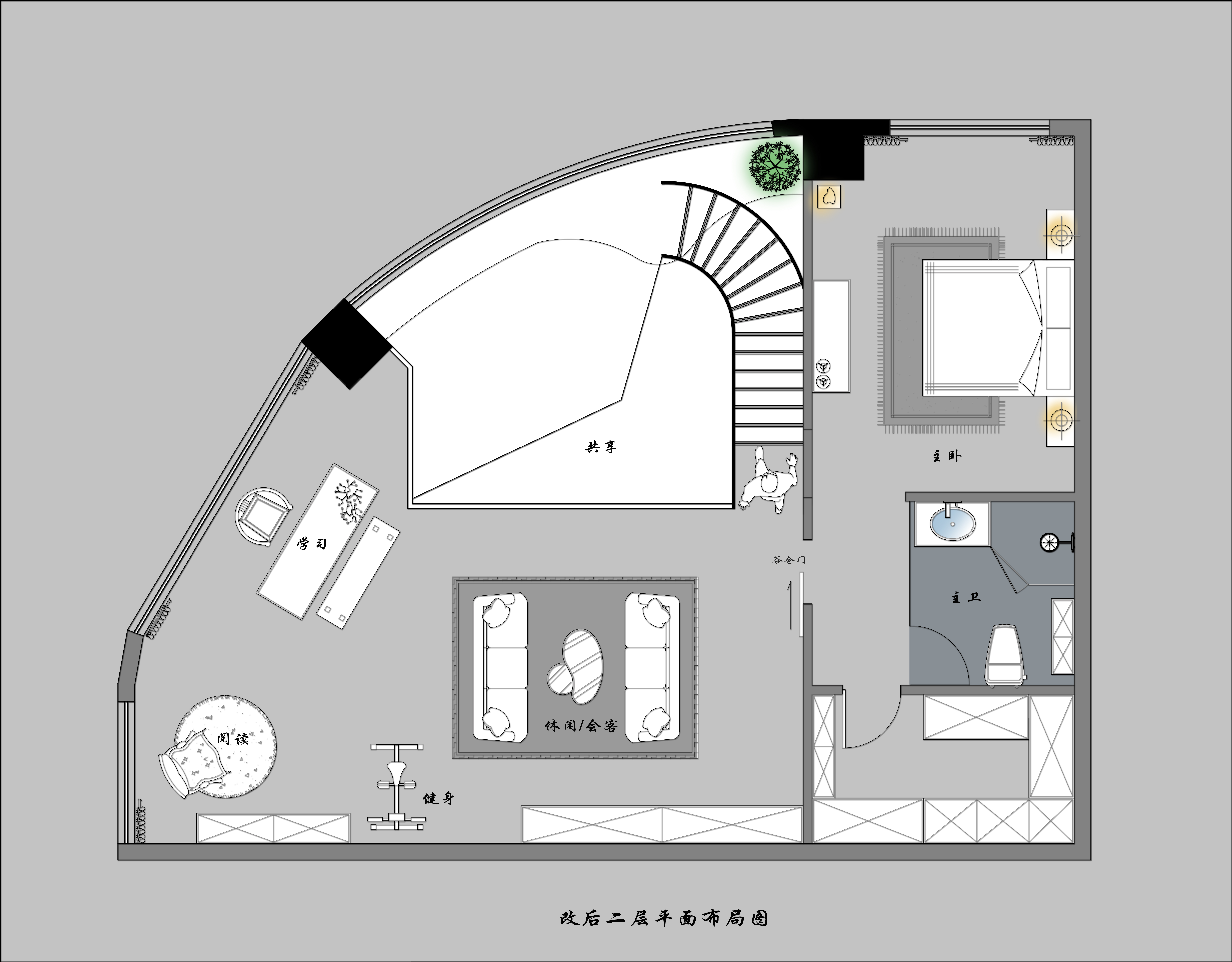 空间布局:因为业主对于卧室的需求并没有那么多,所以我们将弧形这片区域的二层卧室拆除,改成了一层与二层的共享区域。改动之后首先是无论一层还是二层的采光都有了非常大的改善,弧形墙面也有了更多的表现,能够突出这个公寓的特点。一层与二层无论站在那个角落视觉上都会因共享空间受益,视觉也非常的开阔。将这套公寓的视觉特点也是成倍的增长。