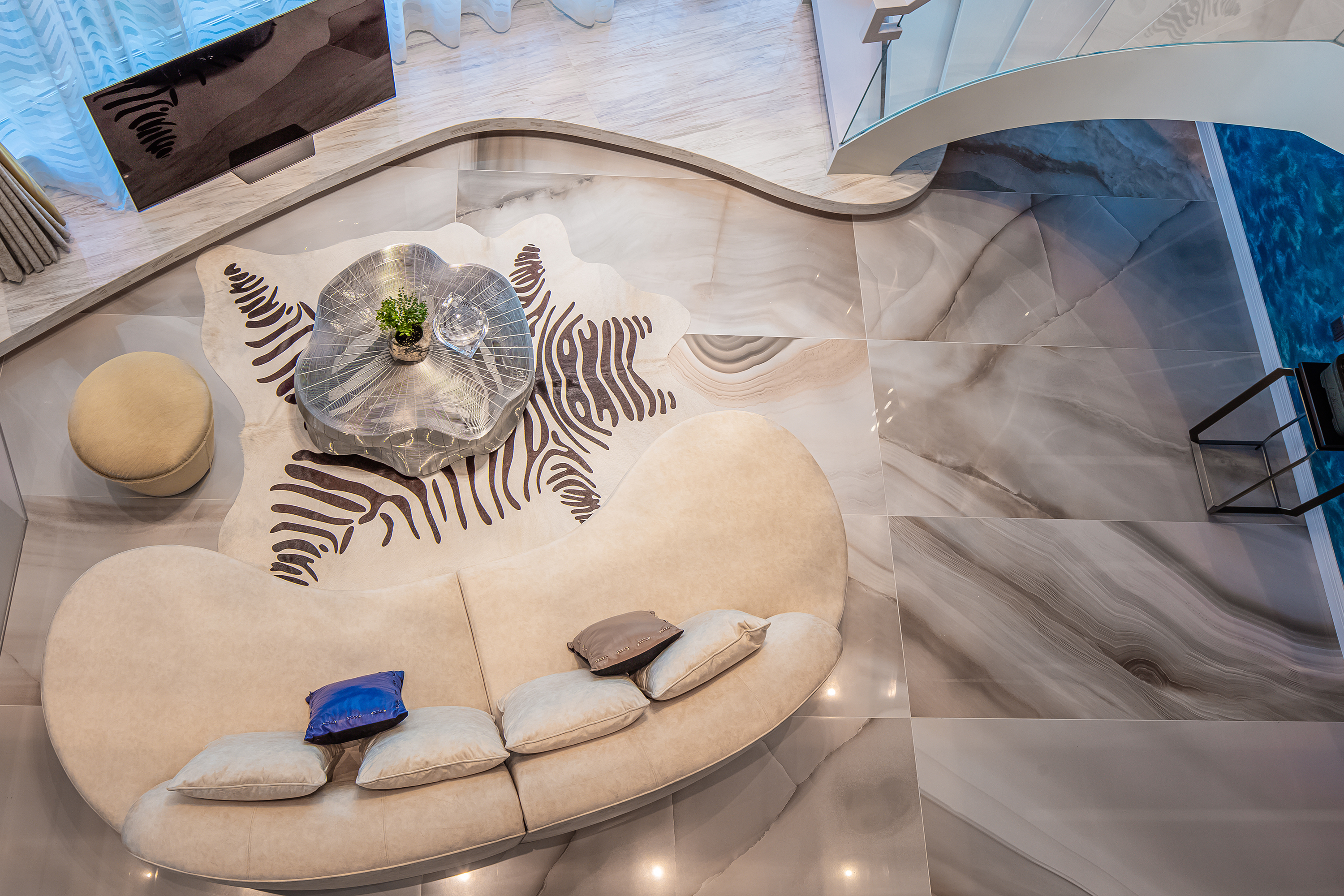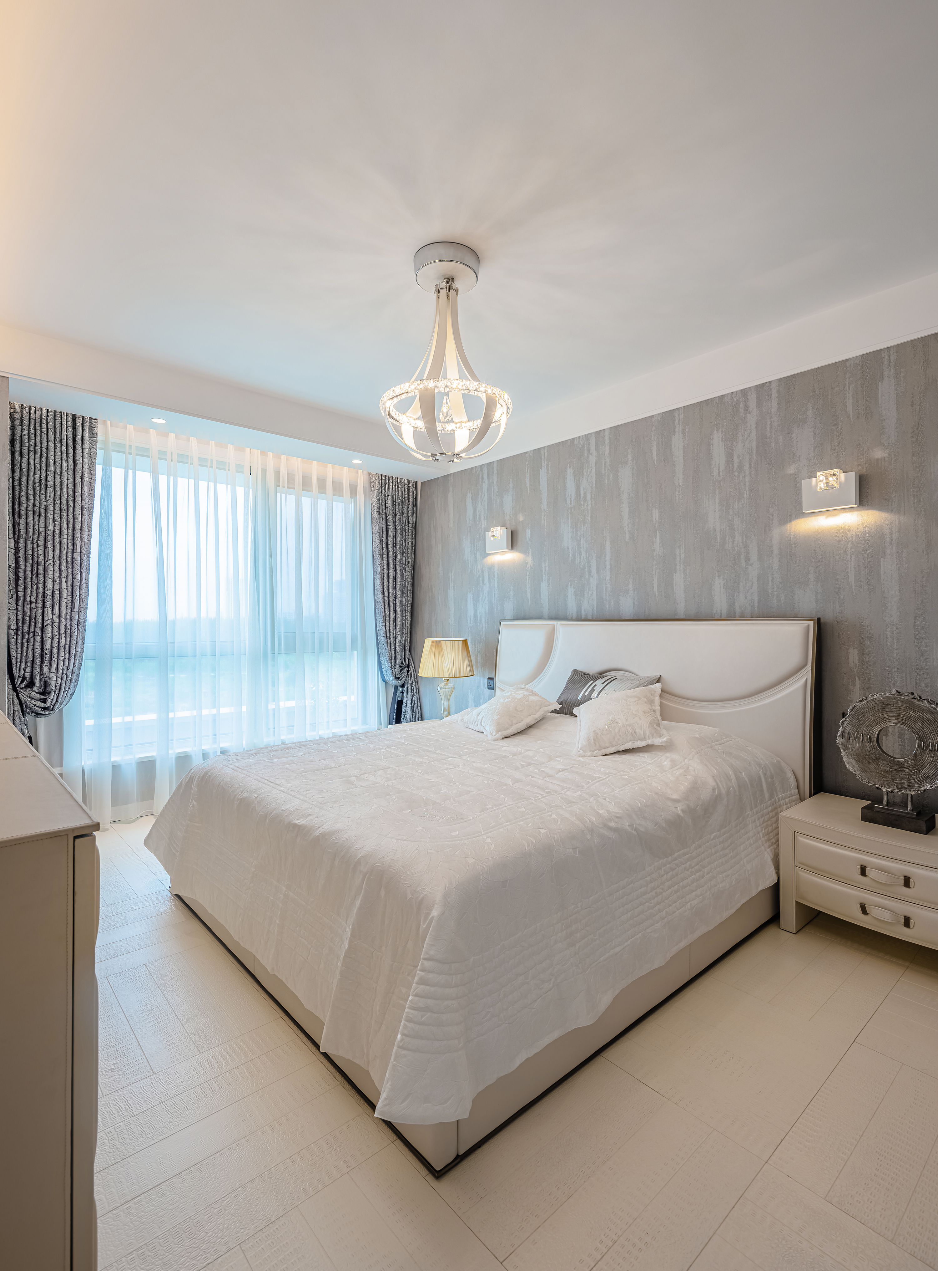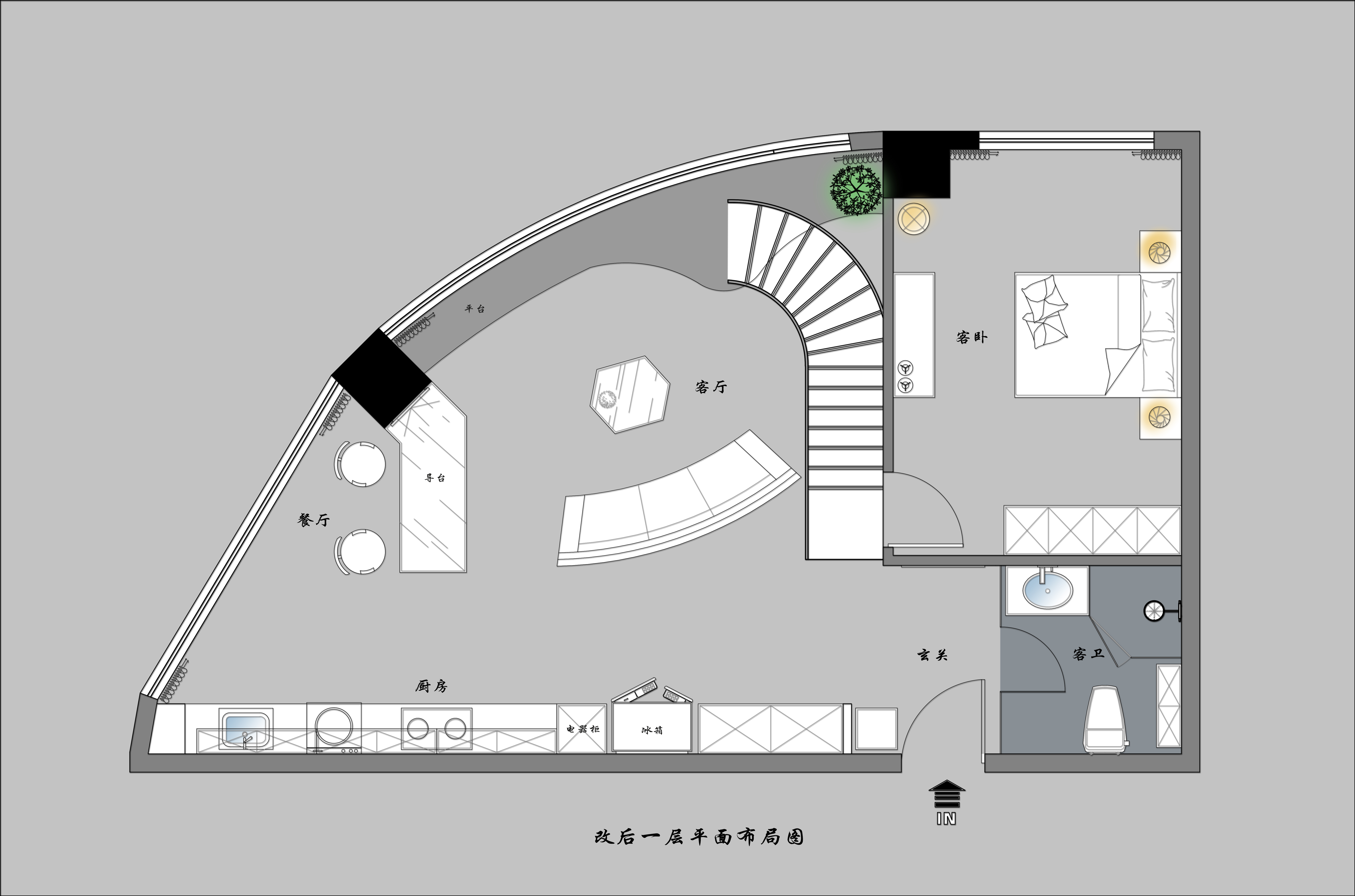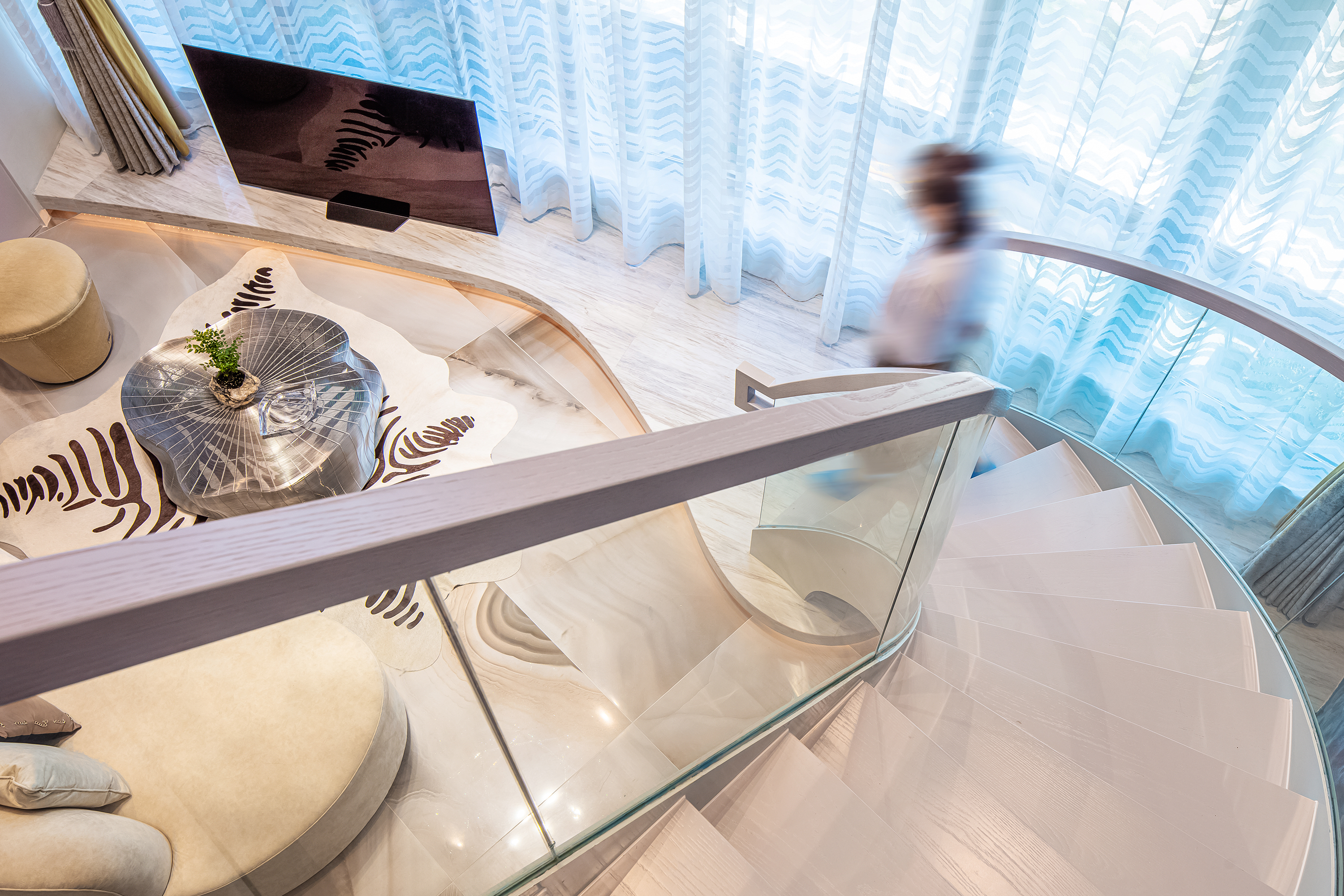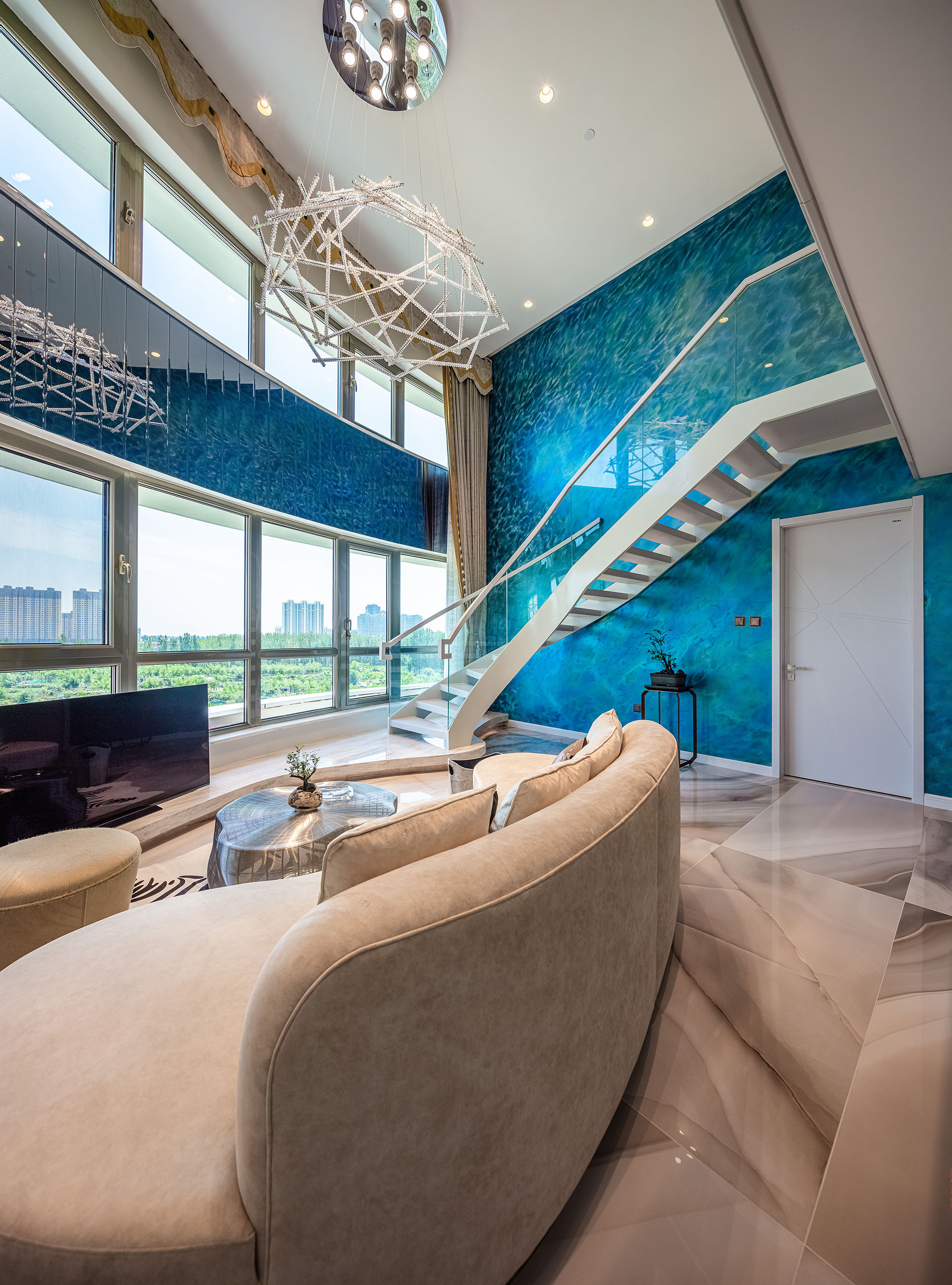 空间意境:在结构改造完之后呢,整个公寓的特点应该说更加凸显了,弧形的落地窗,以及通透的空间、良好的视野。我们在设计整个在装修也是围绕这两点来做,一是将这个写特点能工最大化的凸显,另外是更多的希望做到“融合”不去破坏整体房屋的感觉。