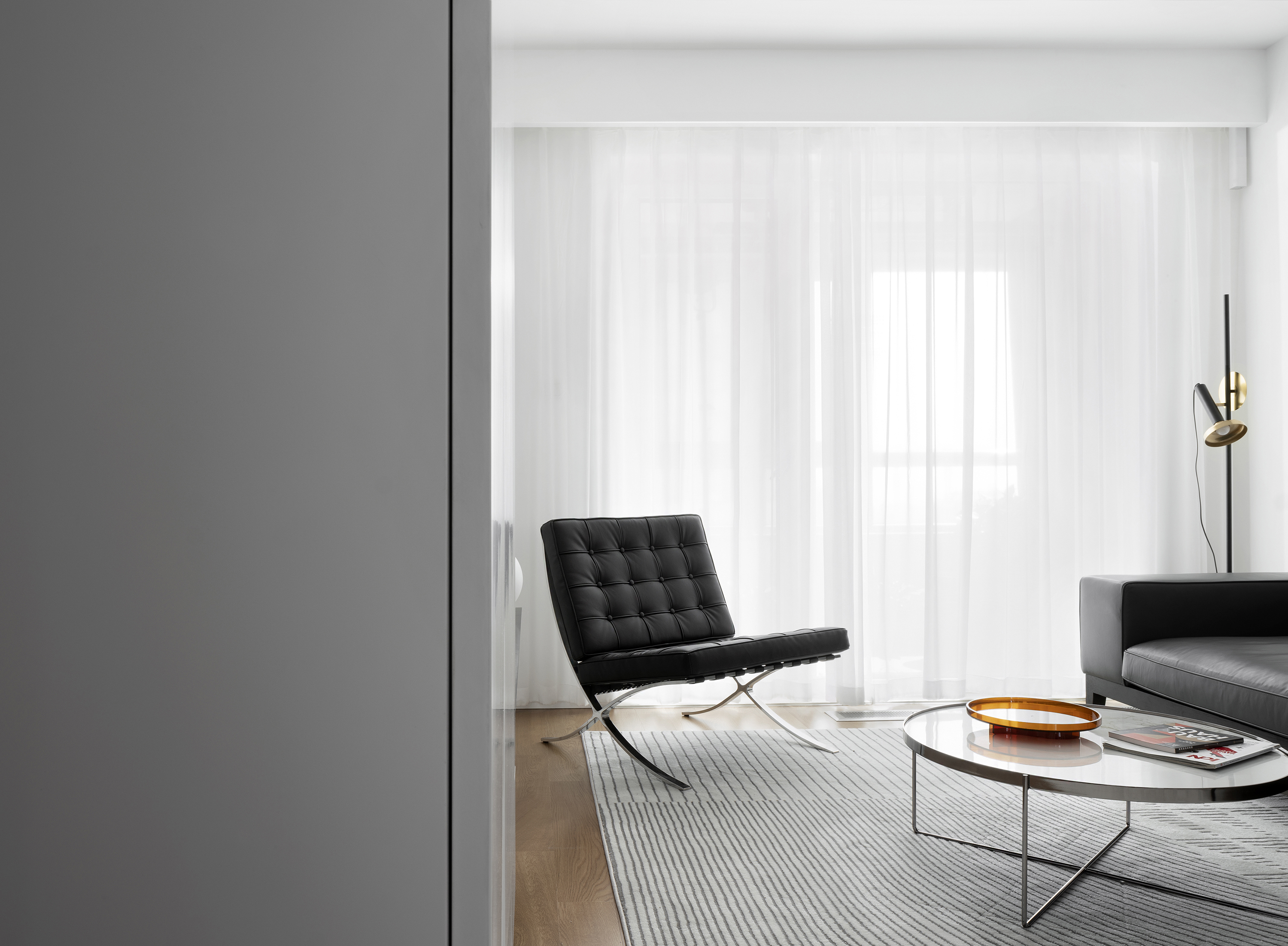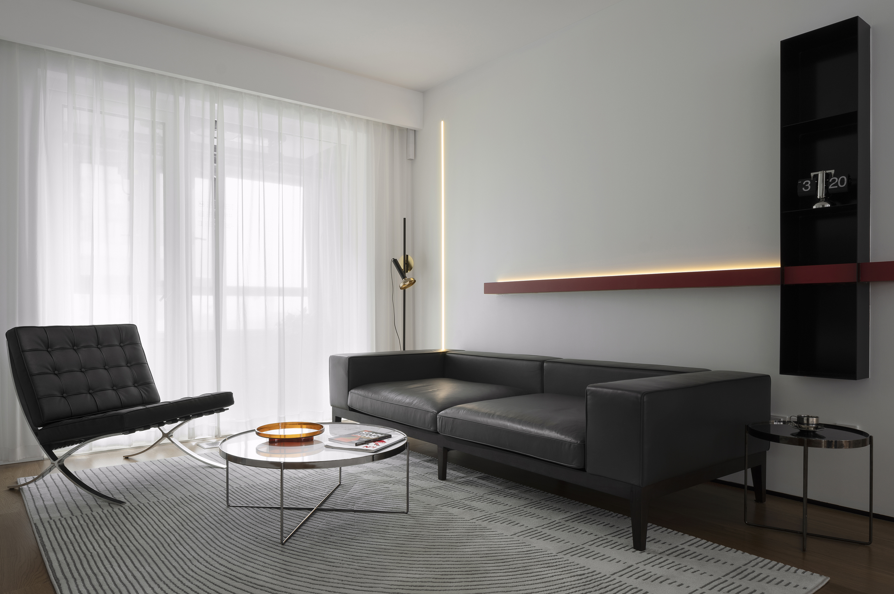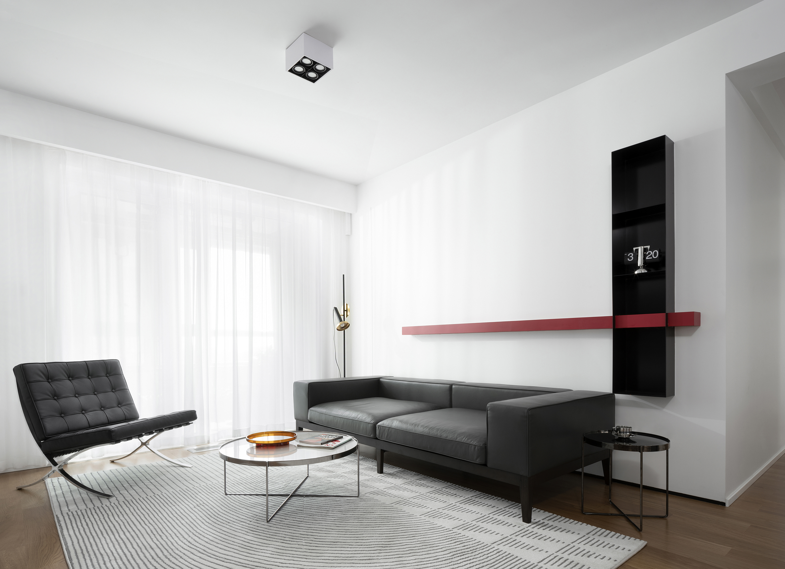 本案例是我们到目前为止,改动受限最大的精装改造项目。 由于原房屋精装交付采用了三恒(恒温恒湿恒氧)系统,从顶面到墙面再到地面都不可以随意改动,甚至顶面多加一盏灯都不可以。 两位业主也是设计专业,大学期间就对包豪斯(BAUHAUS)有所了解。方案设计于2019年,正好也是包豪斯(BAUHAUS)诞生100周年,于是决定将这一主题带入这次的方案设计。 改造后客厅全景。电视背景墙面定制柜体,增加了储物空间。客厅东西面开间尺寸只有3.3米,所以没有选择放置成品电视柜,而是定制6mm厚的黑色钢板代替它。墙面原始插座移位至电视机背后,避免后期使用不便。原开发商交付的普通款明装筒灯都更换为智能筒灯,可以用手机APP控制照明的开关及明暗亮度。