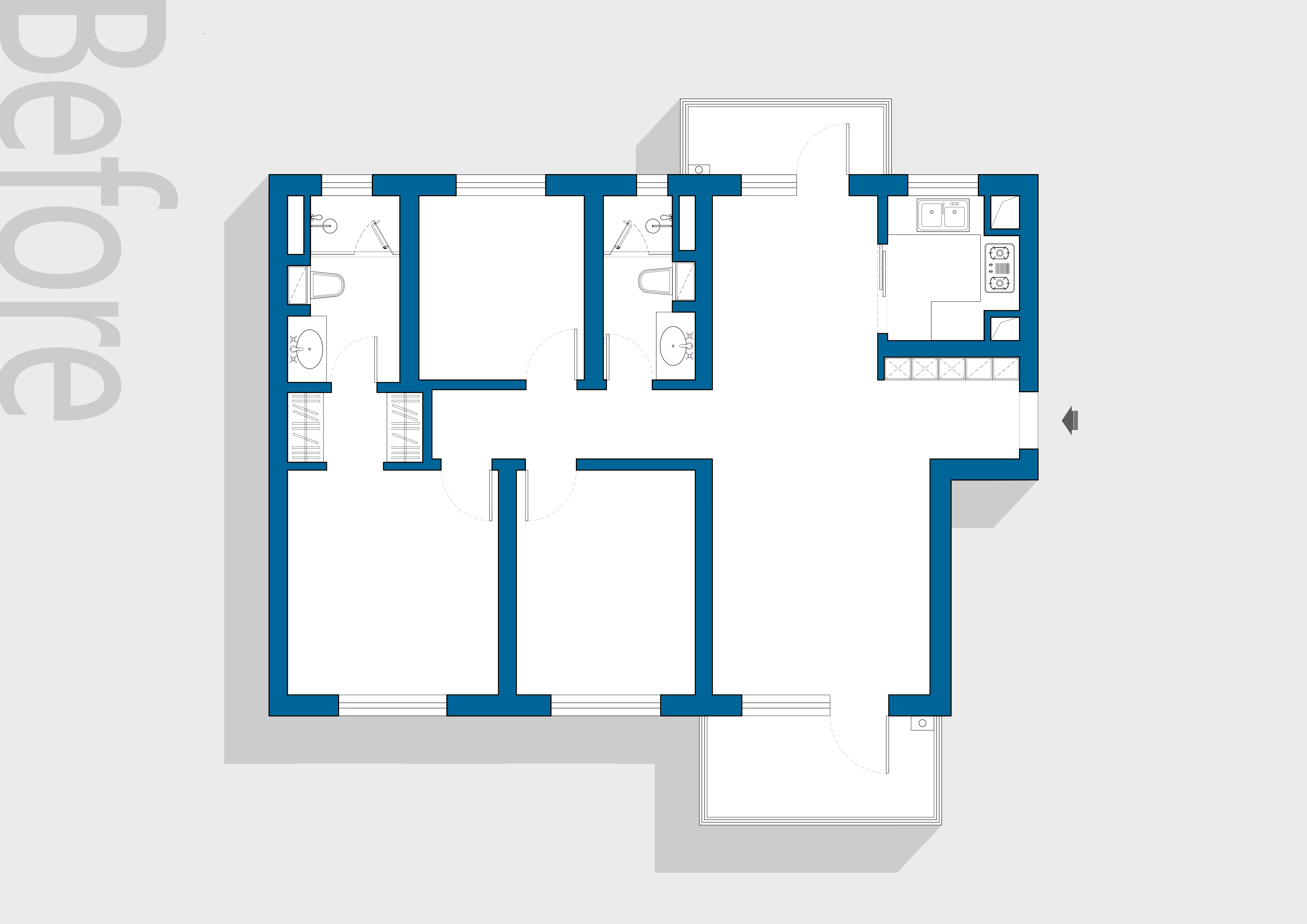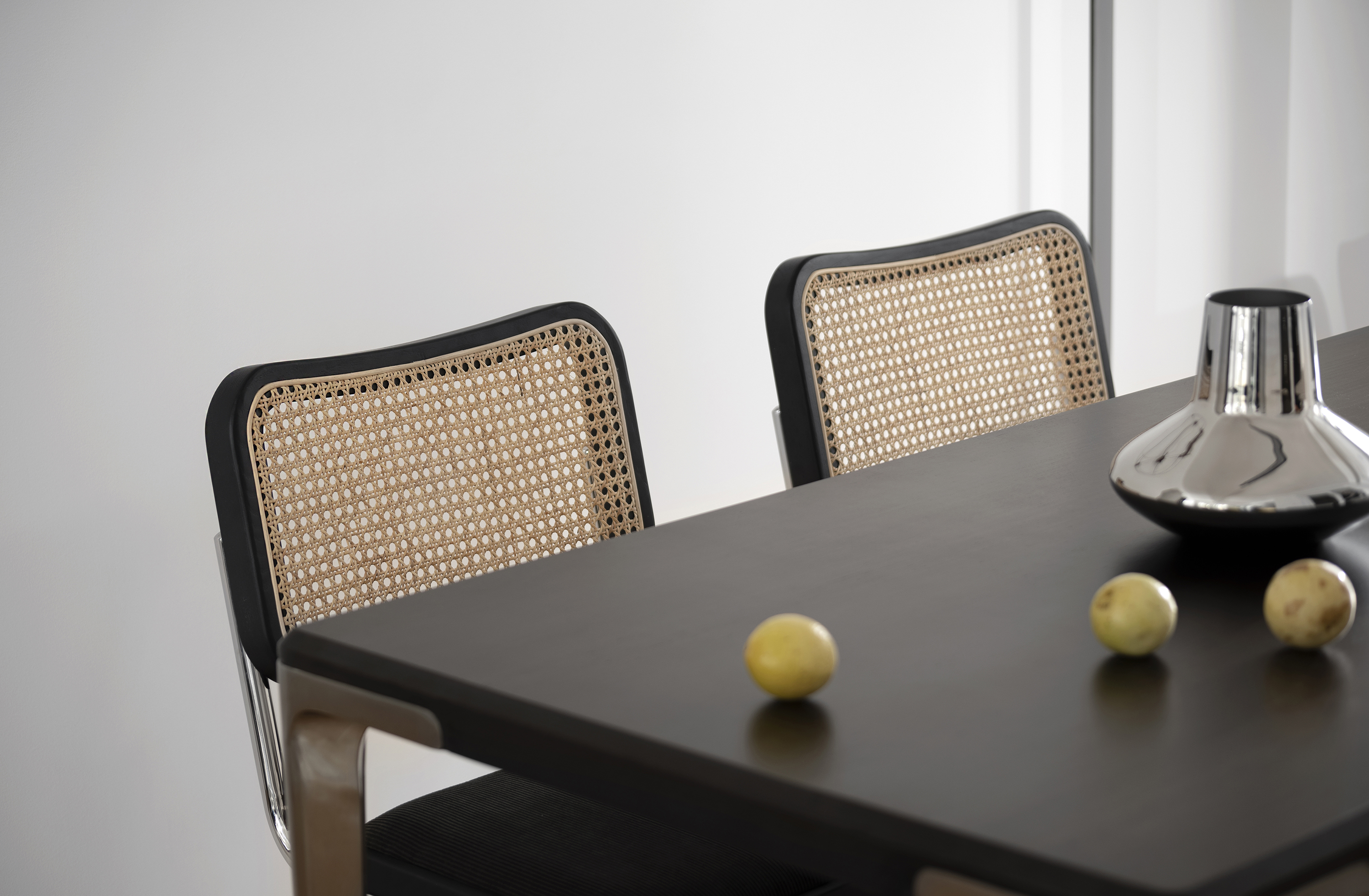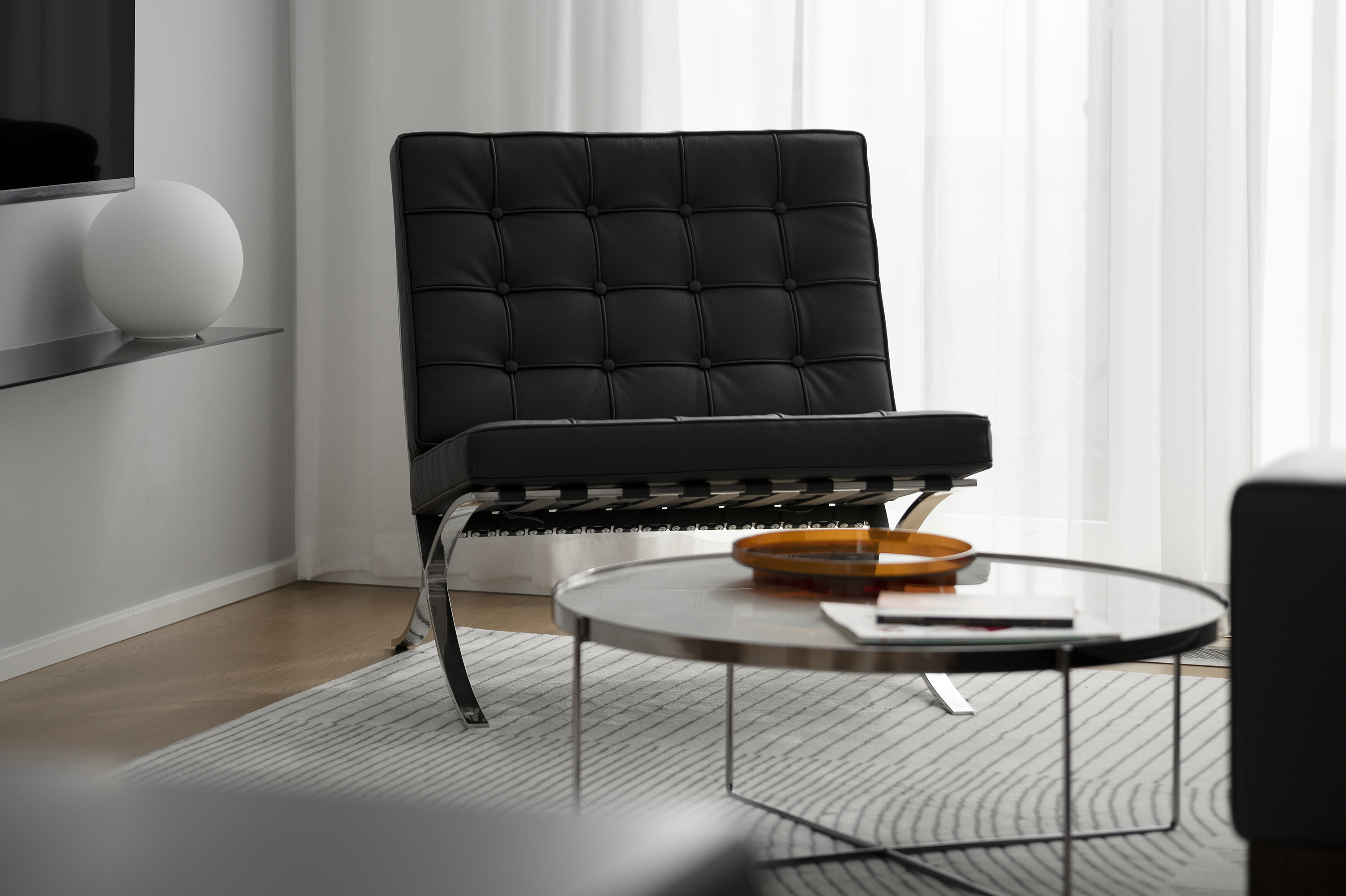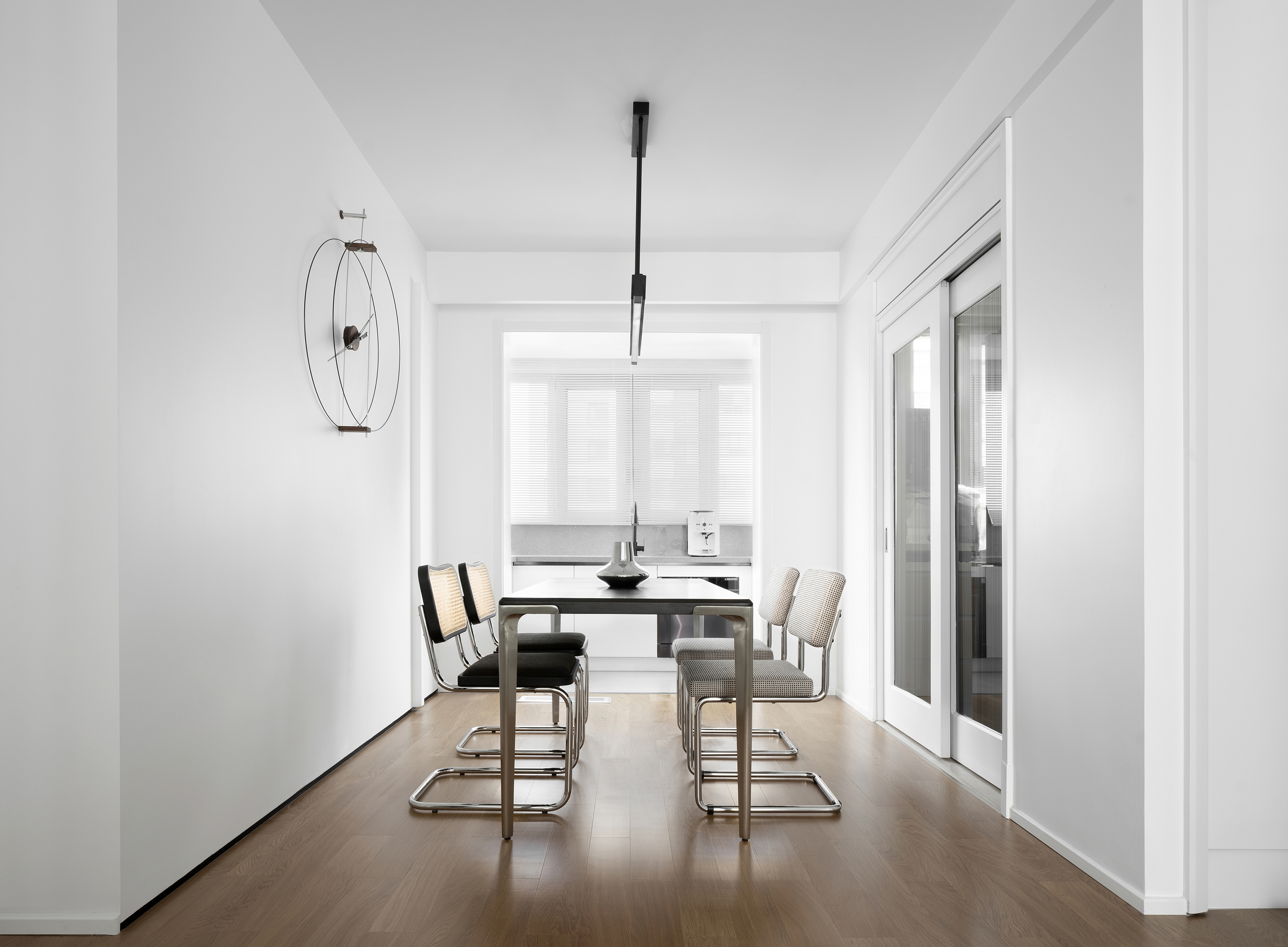 本案例是我们到目前为止,改动受限最大的精装改造项目。 由于原房屋精装交付采用了三恒(恒温恒湿恒氧)系统,从顶面到墙面再到地面都不可以随意改动,甚至顶面多加一盏灯都不可以。 两位业主也是设计专业,大学期间就对包豪斯(BAUHAUS)有所了解。方案设计于2019年,正好也是包豪斯(BAUHAUS)诞生100周年,于是决定将这一主题带入这次的方案设计。 改造后客厅全景。电视背景墙面定制柜体,增加了储物空间。客厅东西面开间尺寸只有3.3米,所以没有选择放置成品电视柜,而是定制6mm厚的黑色钢板代替它。墙面原始插座移位至电视机背后,避免后期使用不便。原开发商交付的普通款明装筒灯都更换为智能筒灯,可以用手机APP控制照明的开关及明暗亮度。