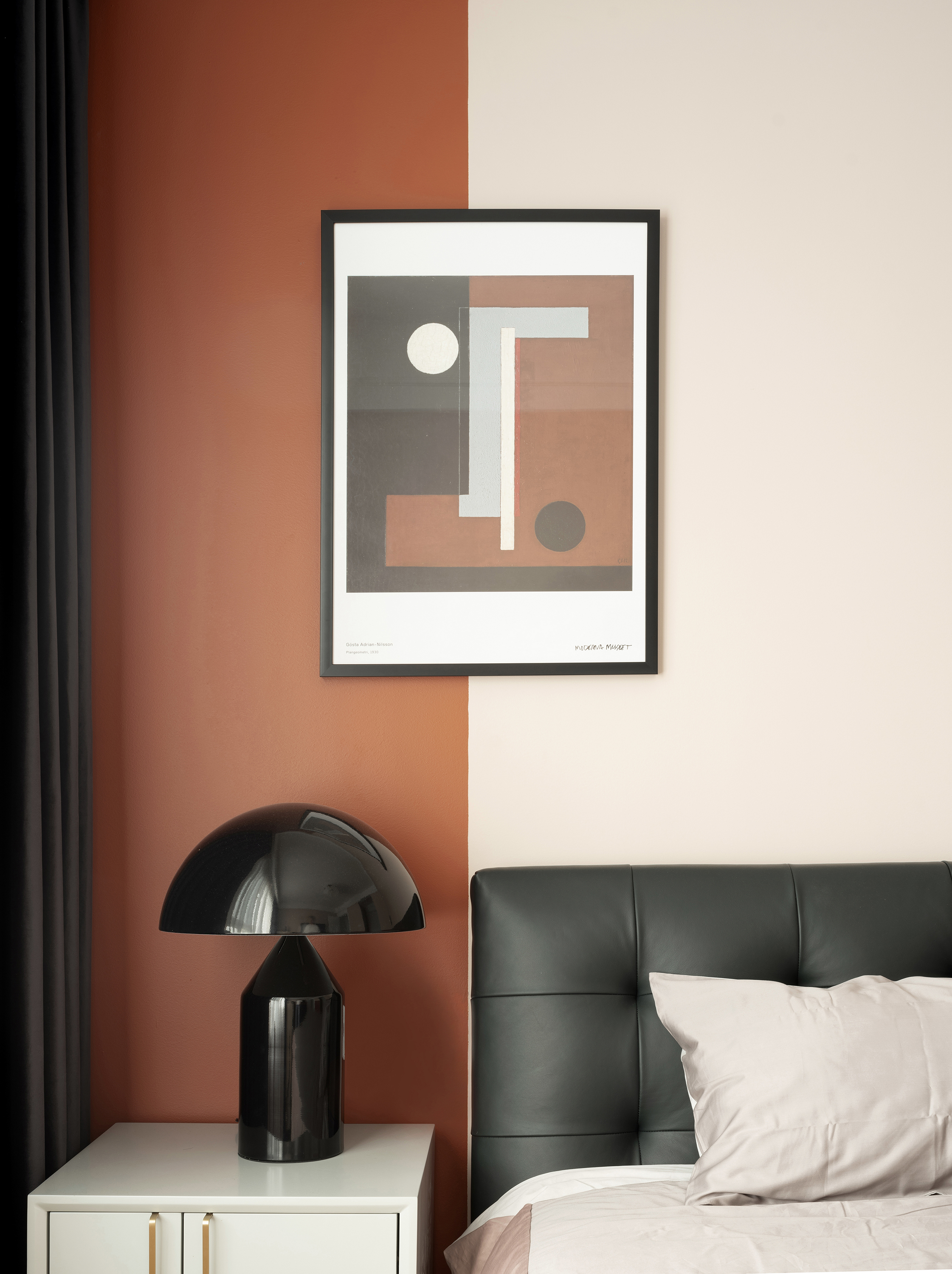 过道装饰画是至上主义的创始人马列维奇(俄)的画作。红色和黑色色块与客厅沙发背景造型色调形成呼应。