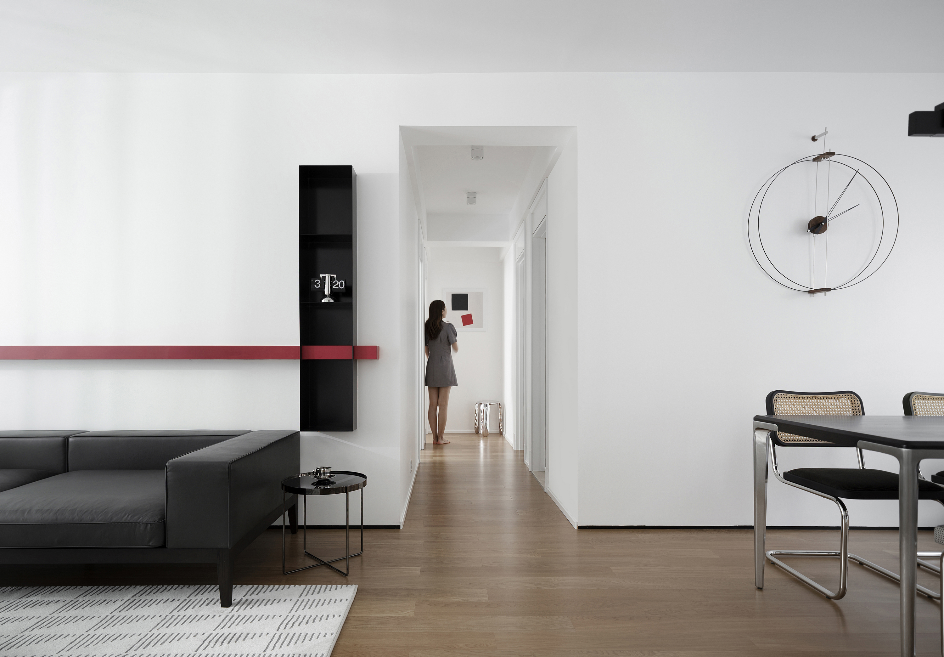 改造后的过道。房间原先的木纹色门都涂刷了遮盖力超强的百色熊白色艺术涂料。原先的8cm木纹色踢脚线也替换为4cm高的白色平板踢脚线。客厅及餐厅墙面整体凸出墙面50mm,方便预埋定制的黑色钢板柜和红色层板隔架。墙面下口预埋隐形踢脚线。