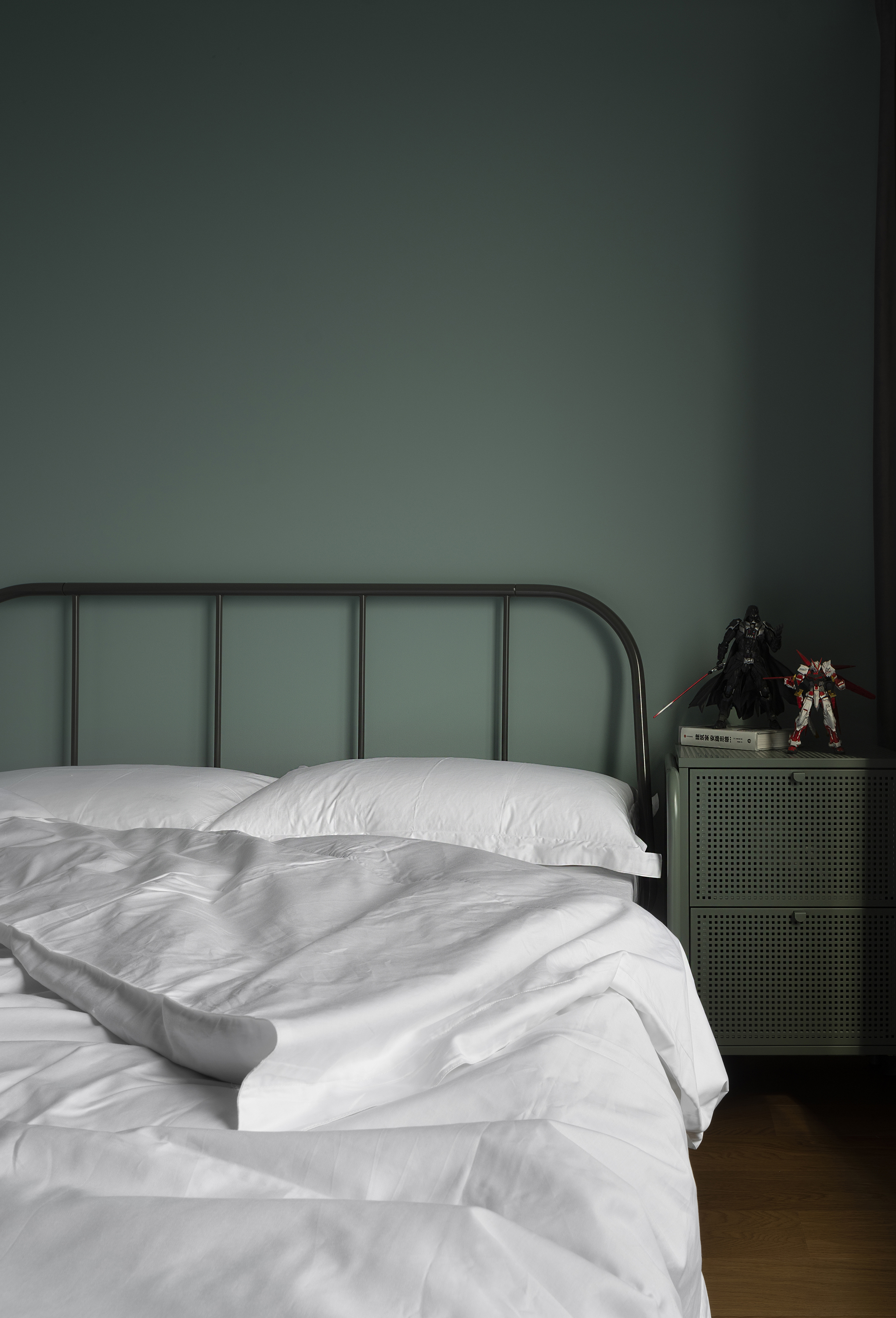 改造后的主卧室背景墙面。原卧室的墙布整体撕除,墙面重新批腻子粉平,涂刷百色熊的艺术涂料。