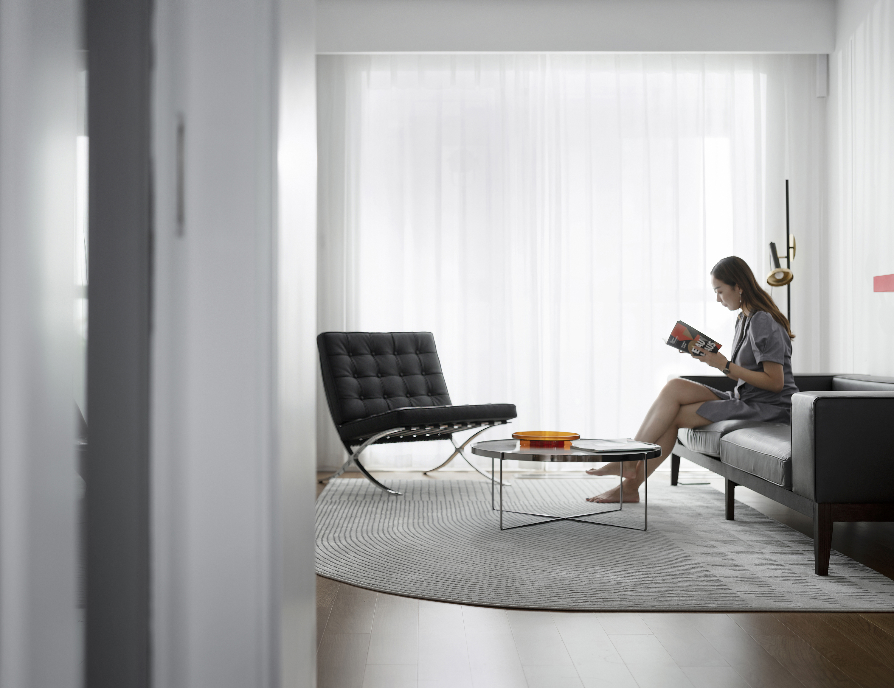 设计选材:原先精装交付的房间门和部分固定木制家具都是浅木纹的木饰面,我们选择遮盖力超强的白色进口涂料进行改色,让整个空间色彩和风格统一。另外在整屋的灯光设计选择上都使用智能照明,可以通过手机APP控制照明的色温及明亮度。