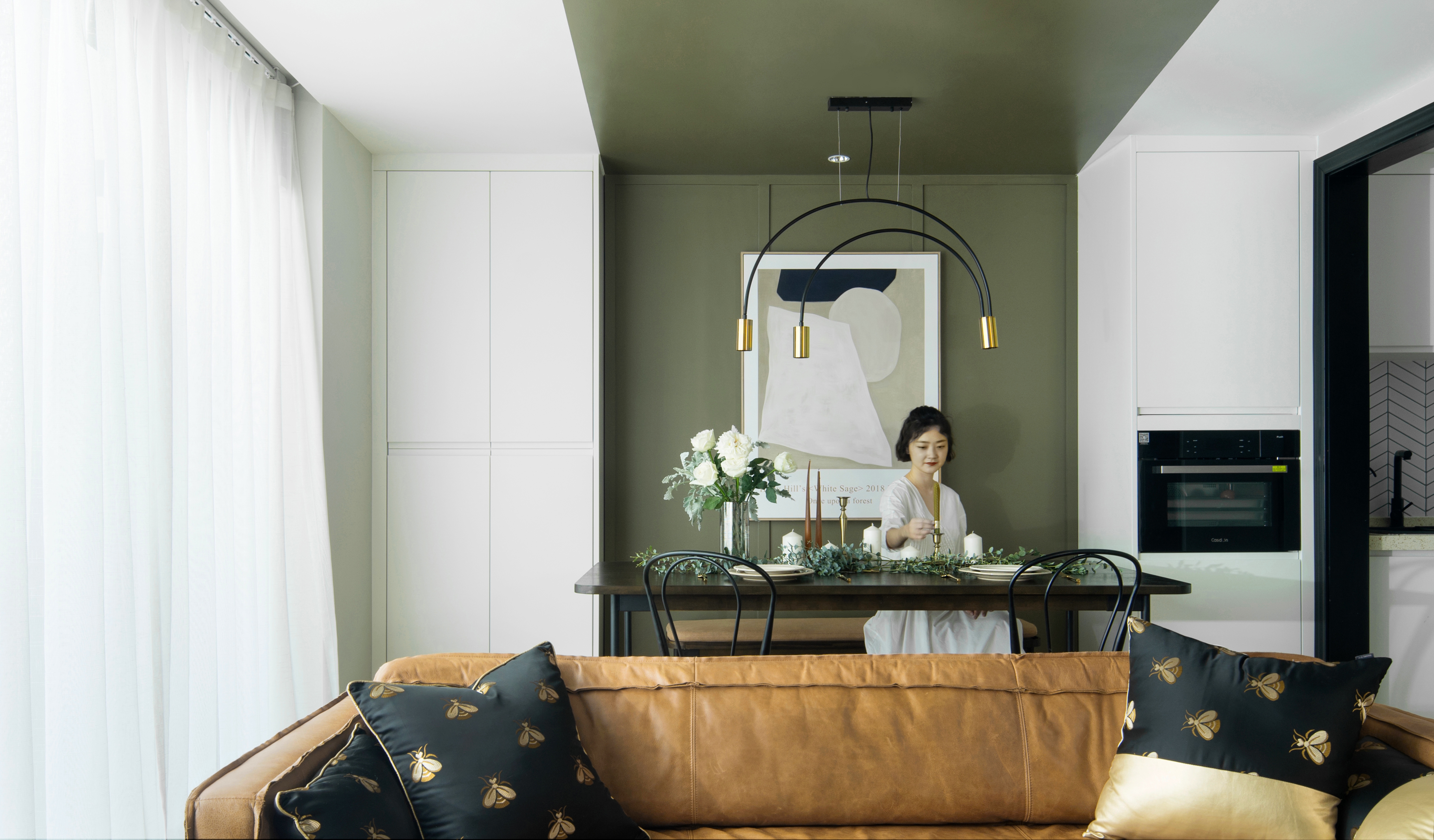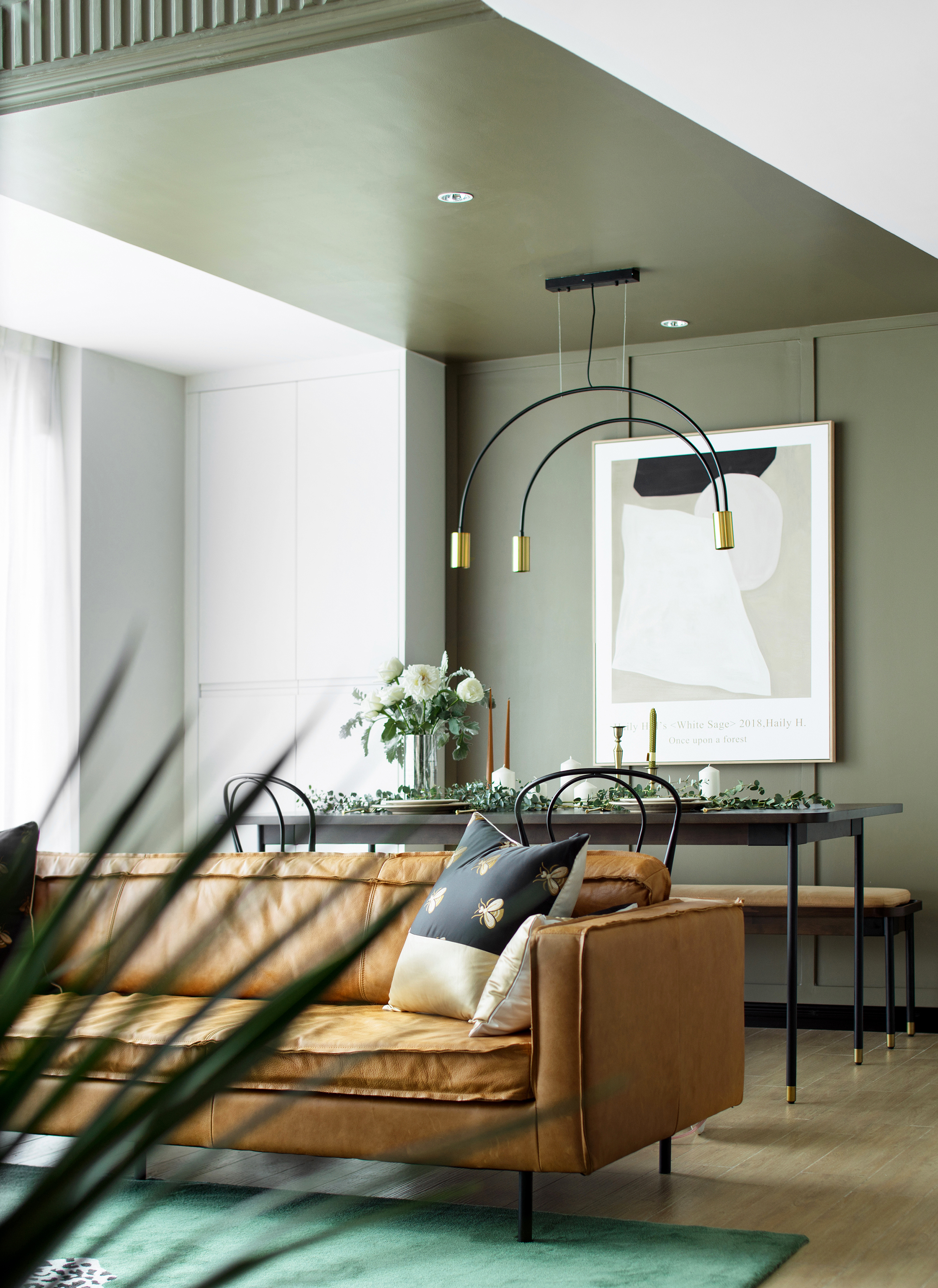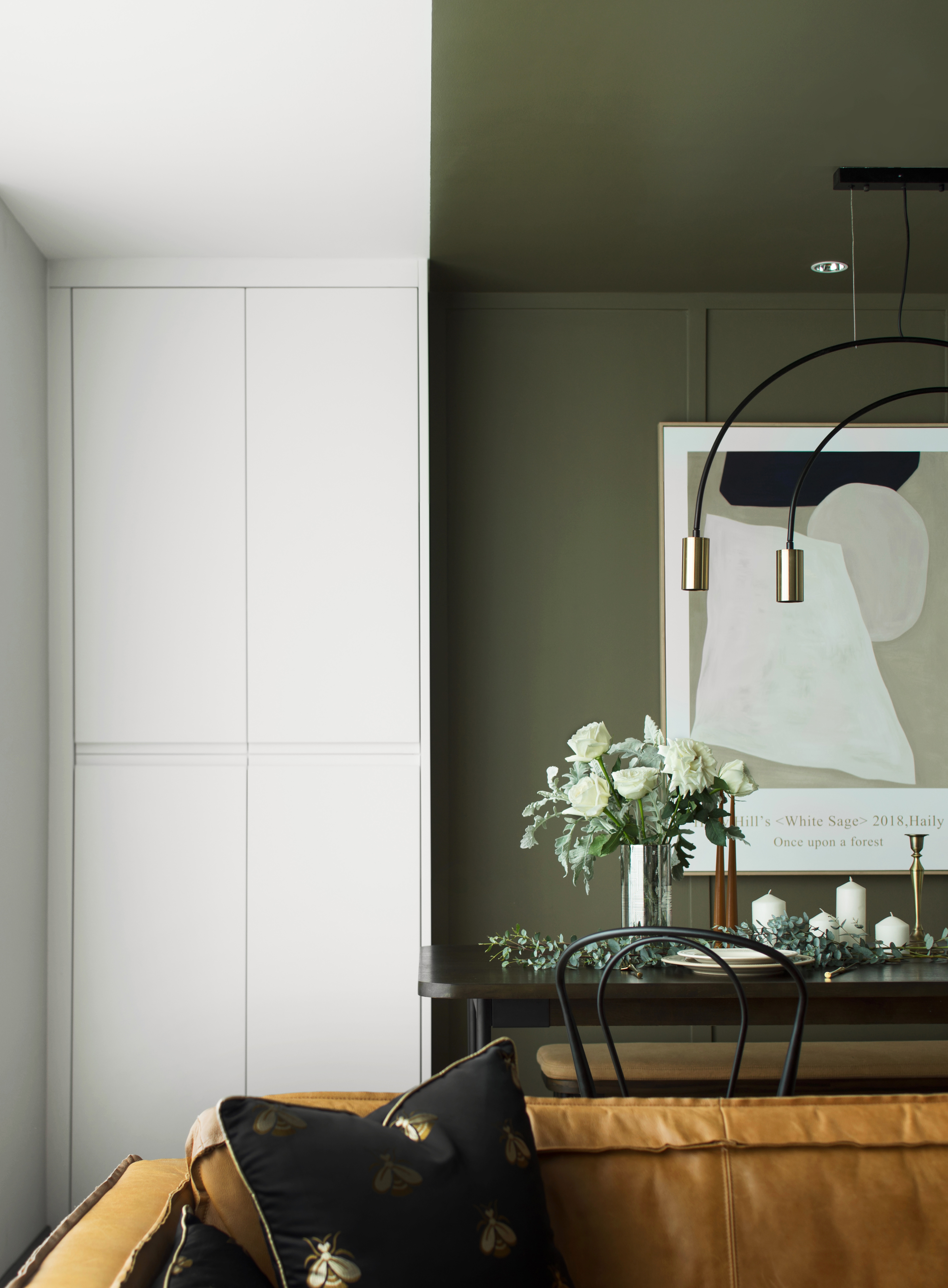 餐厅的处理为半卡座,去除刻板印象中固定卡座思路,选用配套胡桃木长凳,使之灵活。细腿家具的摆放让空间更加通透。“卡座”区对称储藏柜运用定制平板门,从色彩和款式造成空间对比,增加戏剧化。客餐厅整体色块的连续蔓延有一定的仪式感,在不增加预算的前提下,突破常规形成纽带。