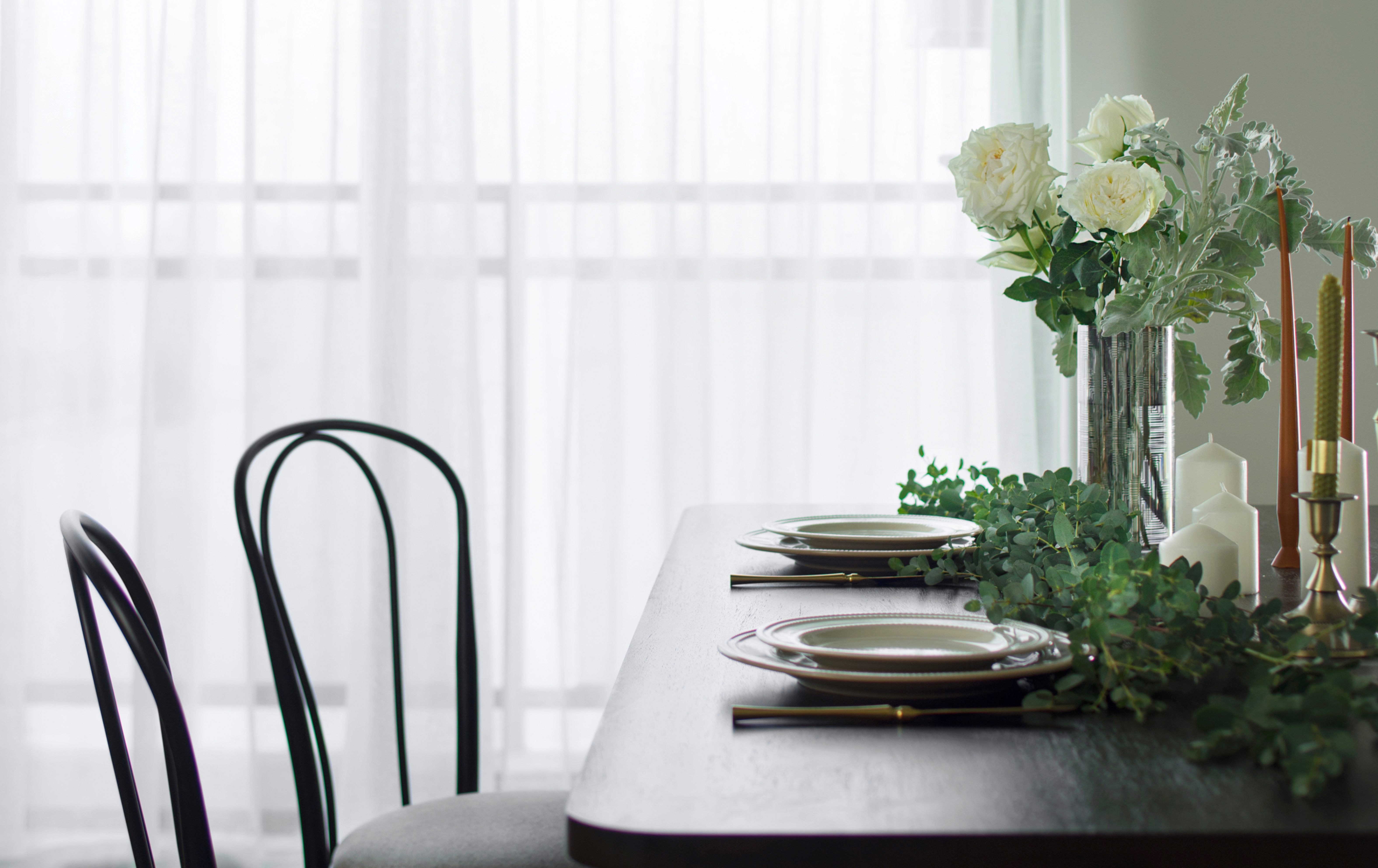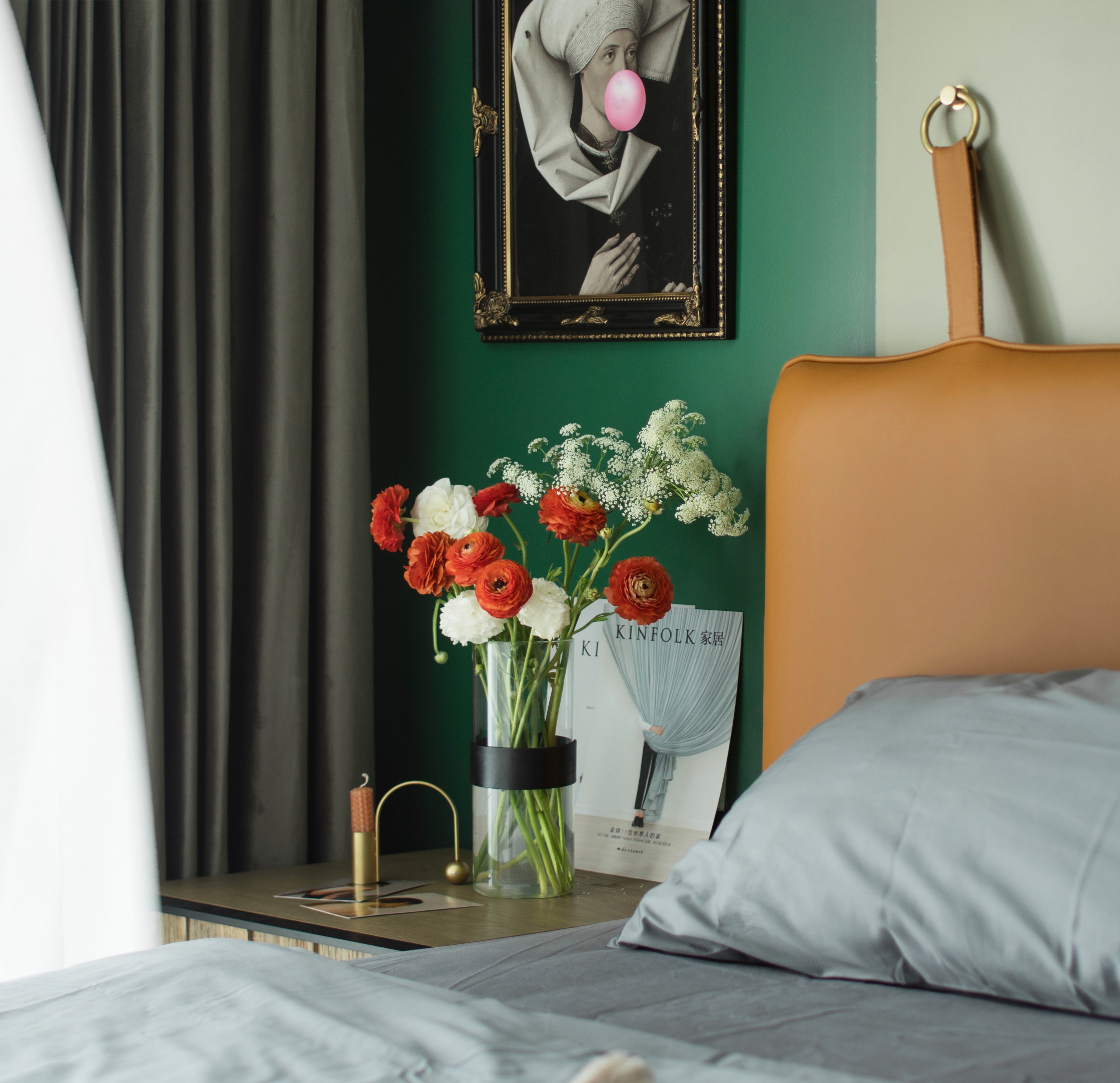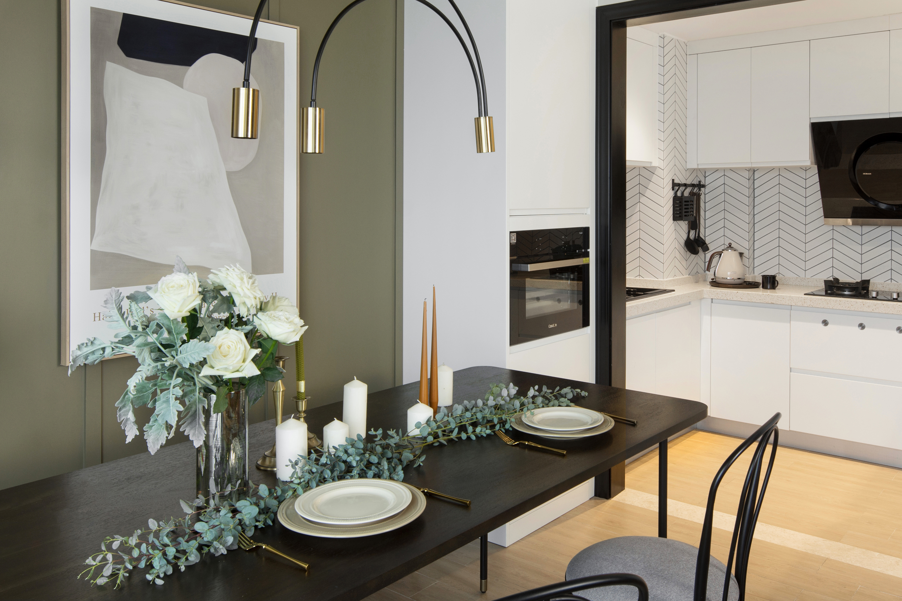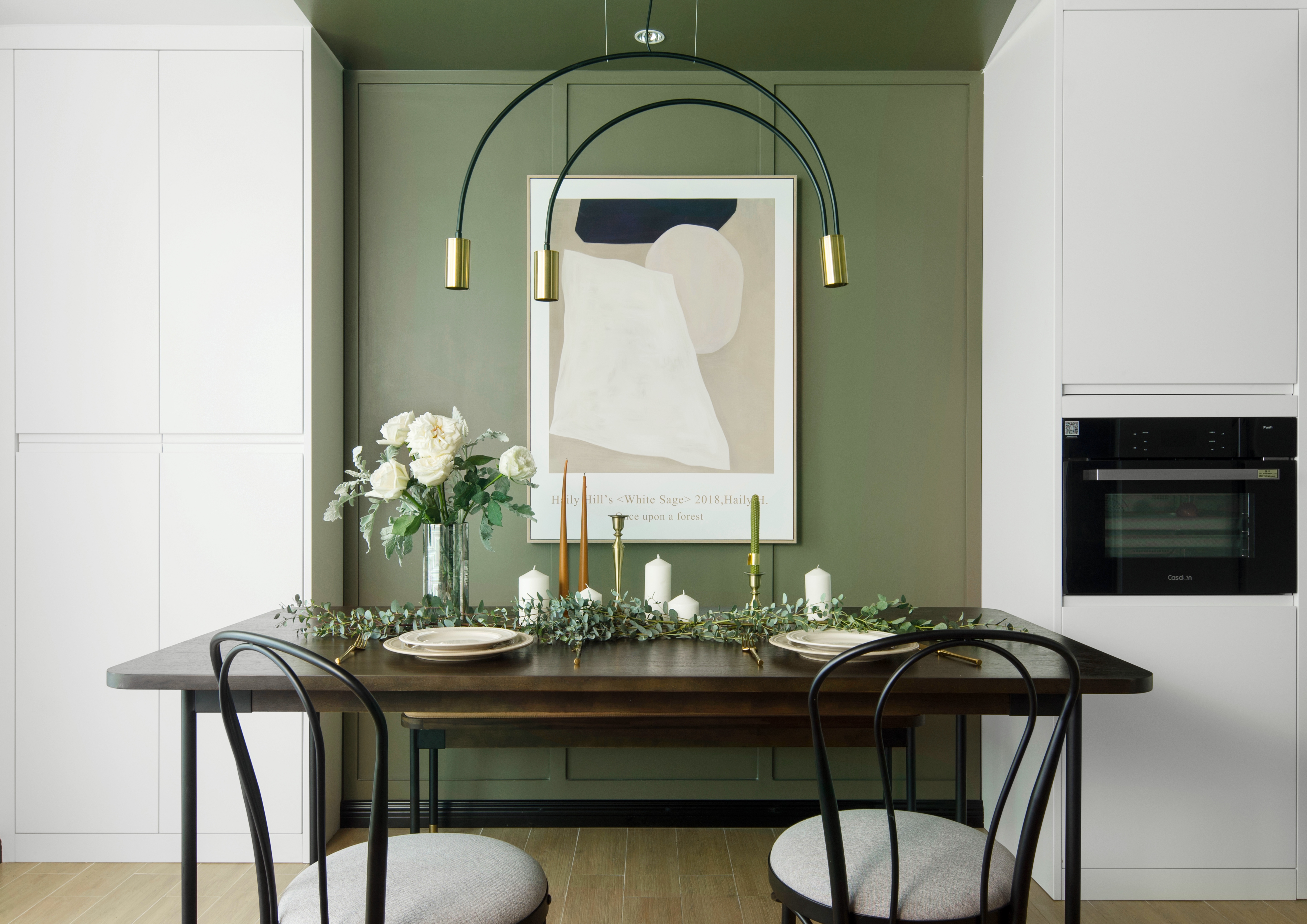 餐厅的处理为半卡座,去除刻板印象中固定卡座思路,选用配套胡桃木长凳,使之灵活。细腿家具的摆放让空间更加通透。“卡座”区对称储藏柜运用定制平板门,从色彩和款式造成空间对比,增加戏剧化。客餐厅整体色块的连续蔓延有一定的仪式感,在不增加预算的前提下,突破常规形成纽带。