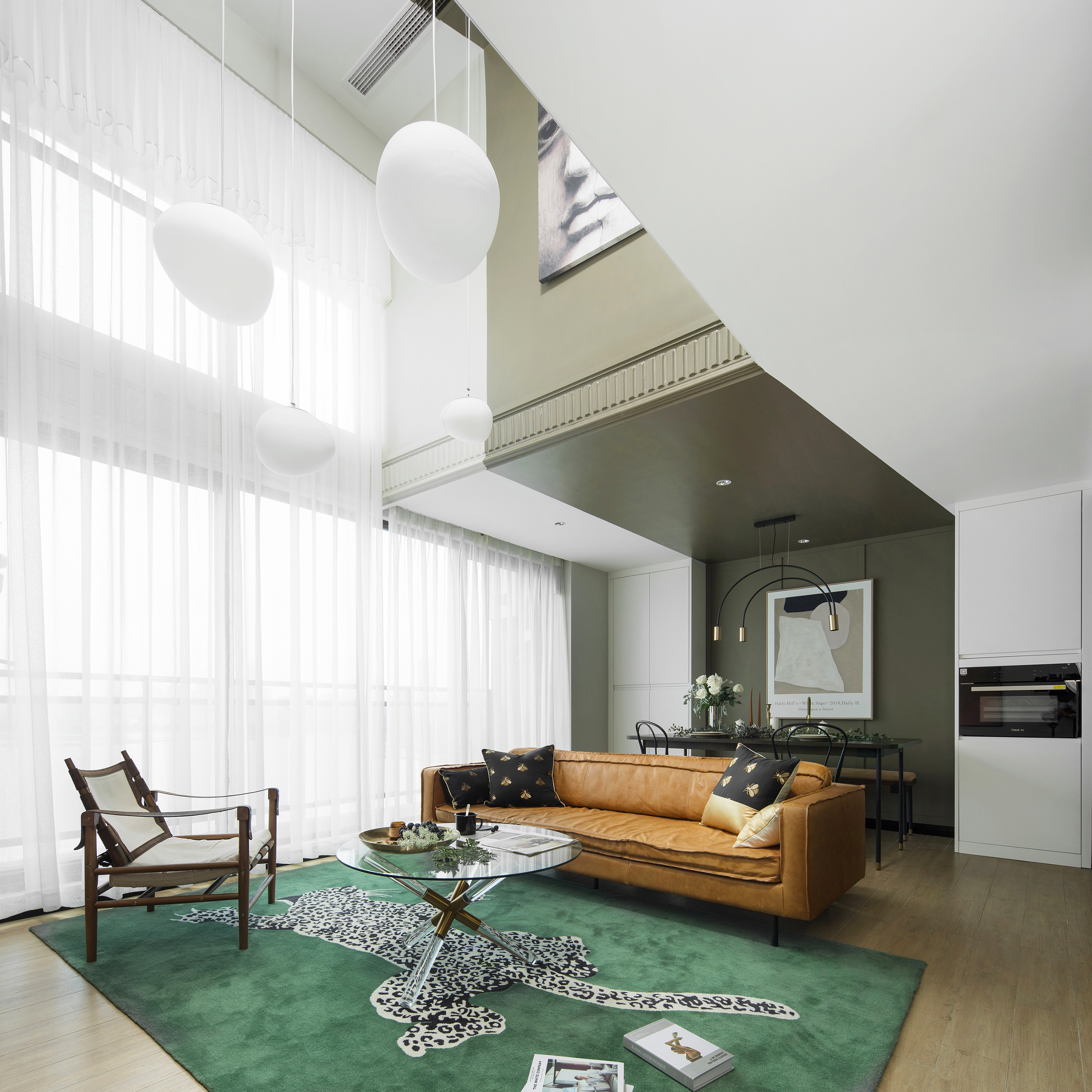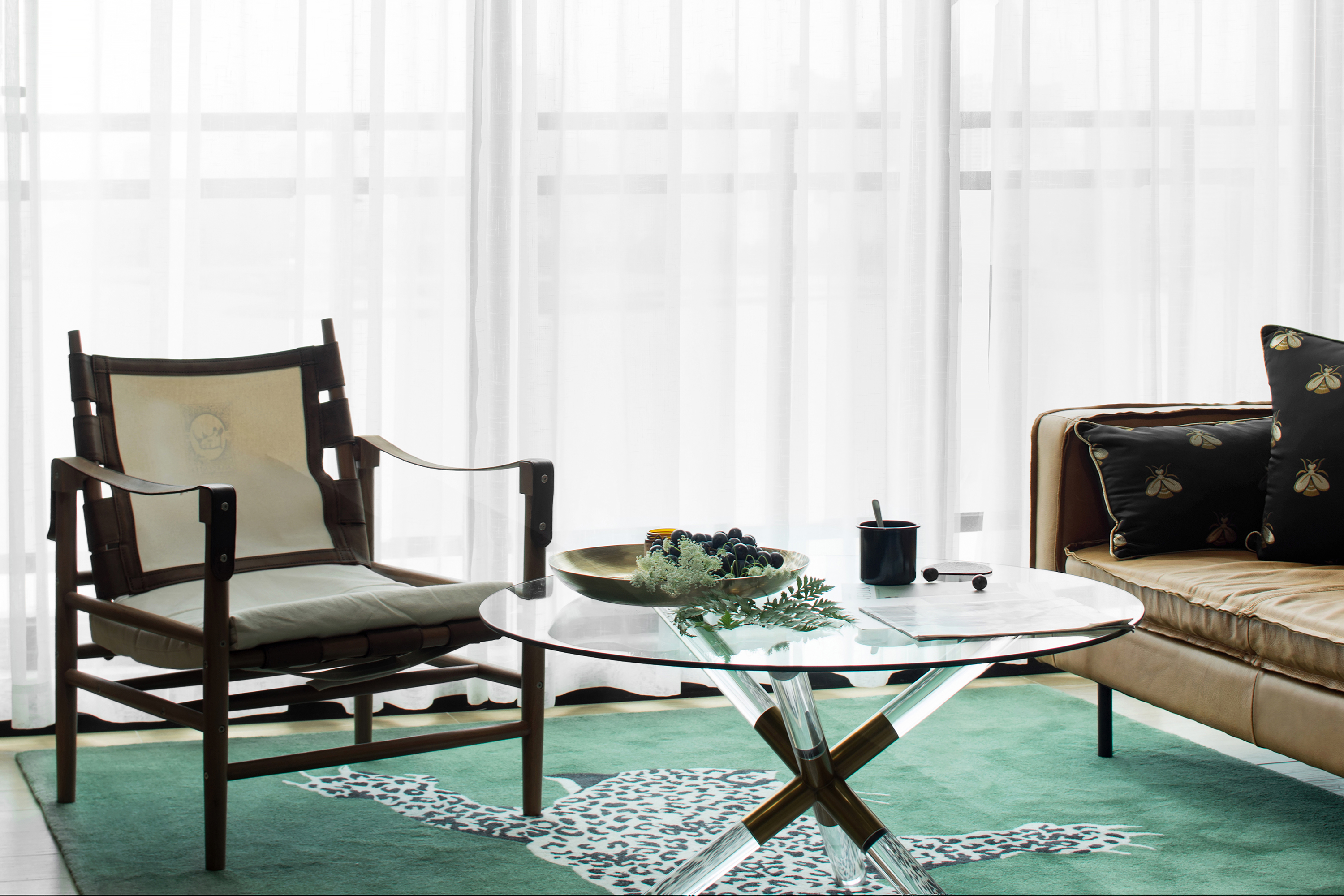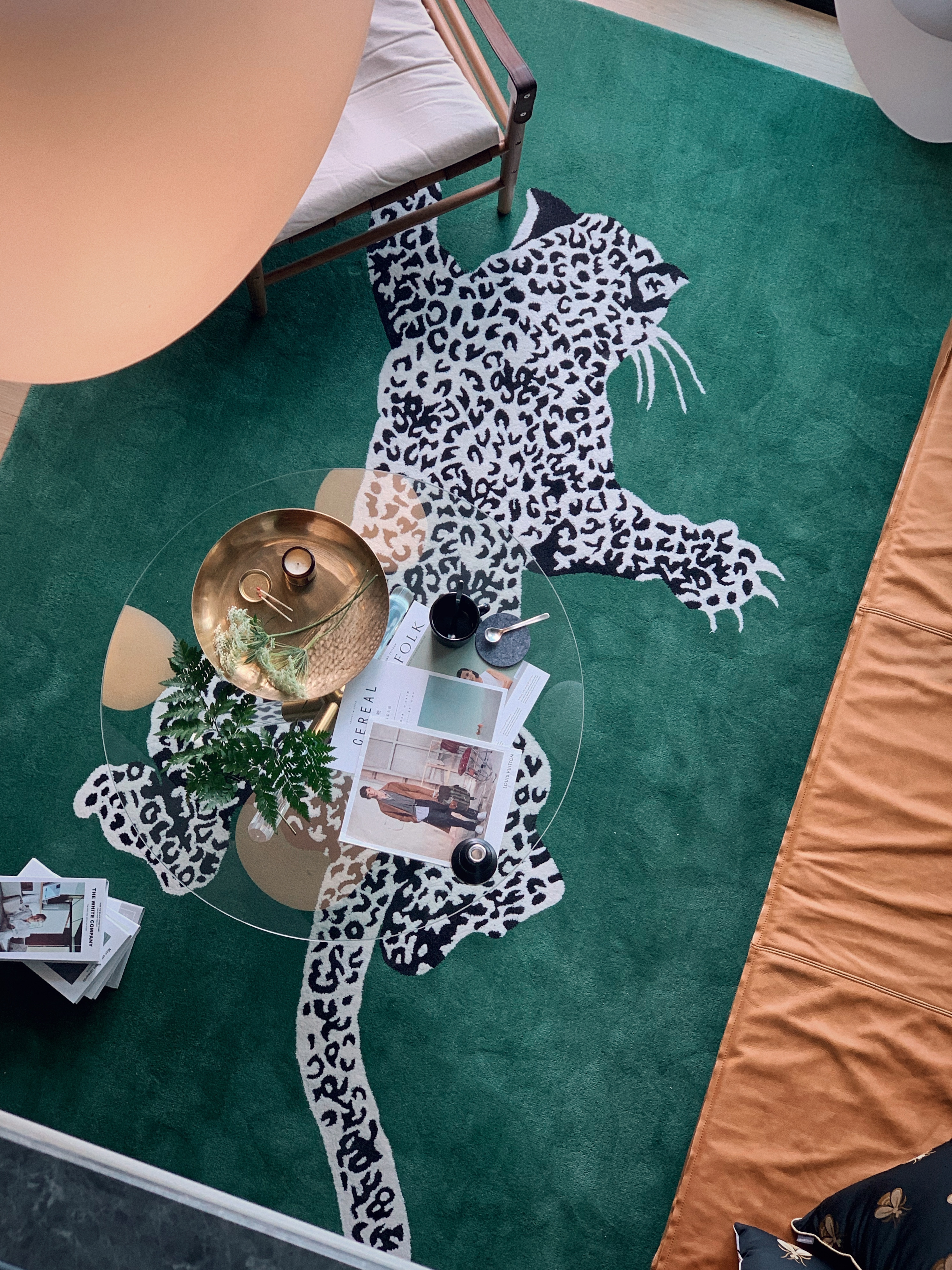 客厅地毯的选择放弃几何或抽象色块图形,具象为金钱豹,在二层过道空间俯视时,给人视觉感受的冲击。