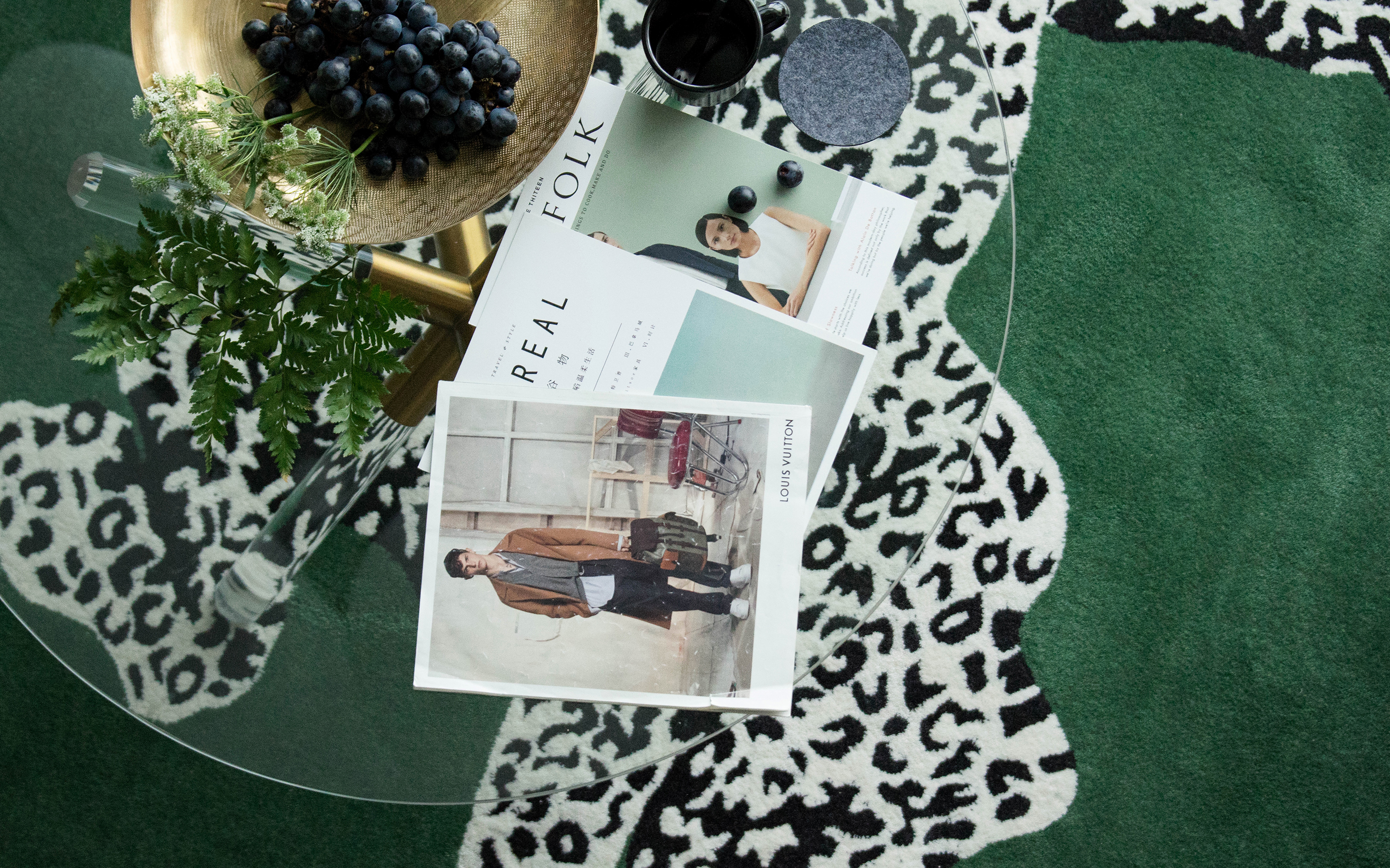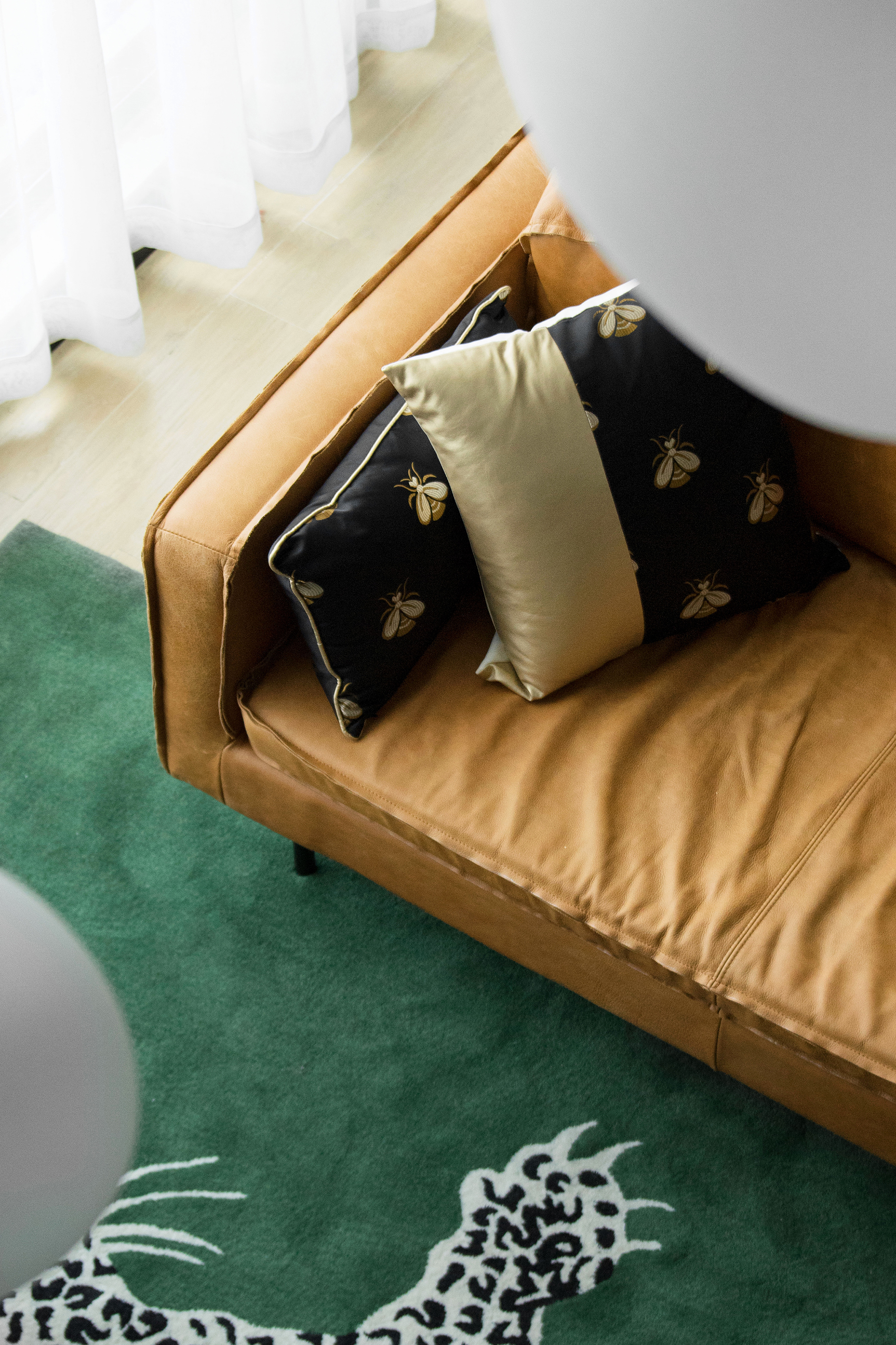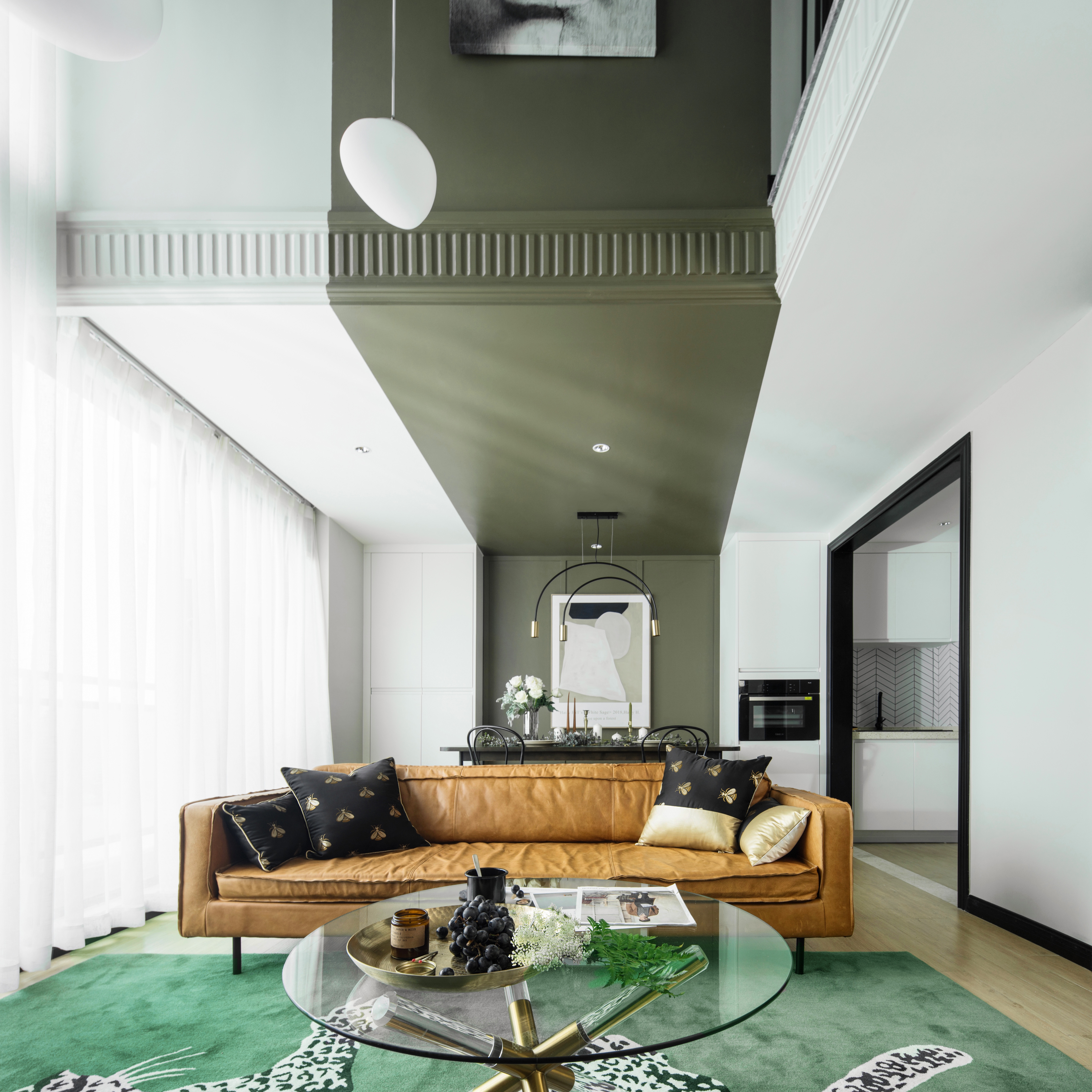 客厅地毯的选择放弃几何或抽象色块图形,具象为金钱豹,在二层过道空间俯视时,给人视觉感受的冲击。