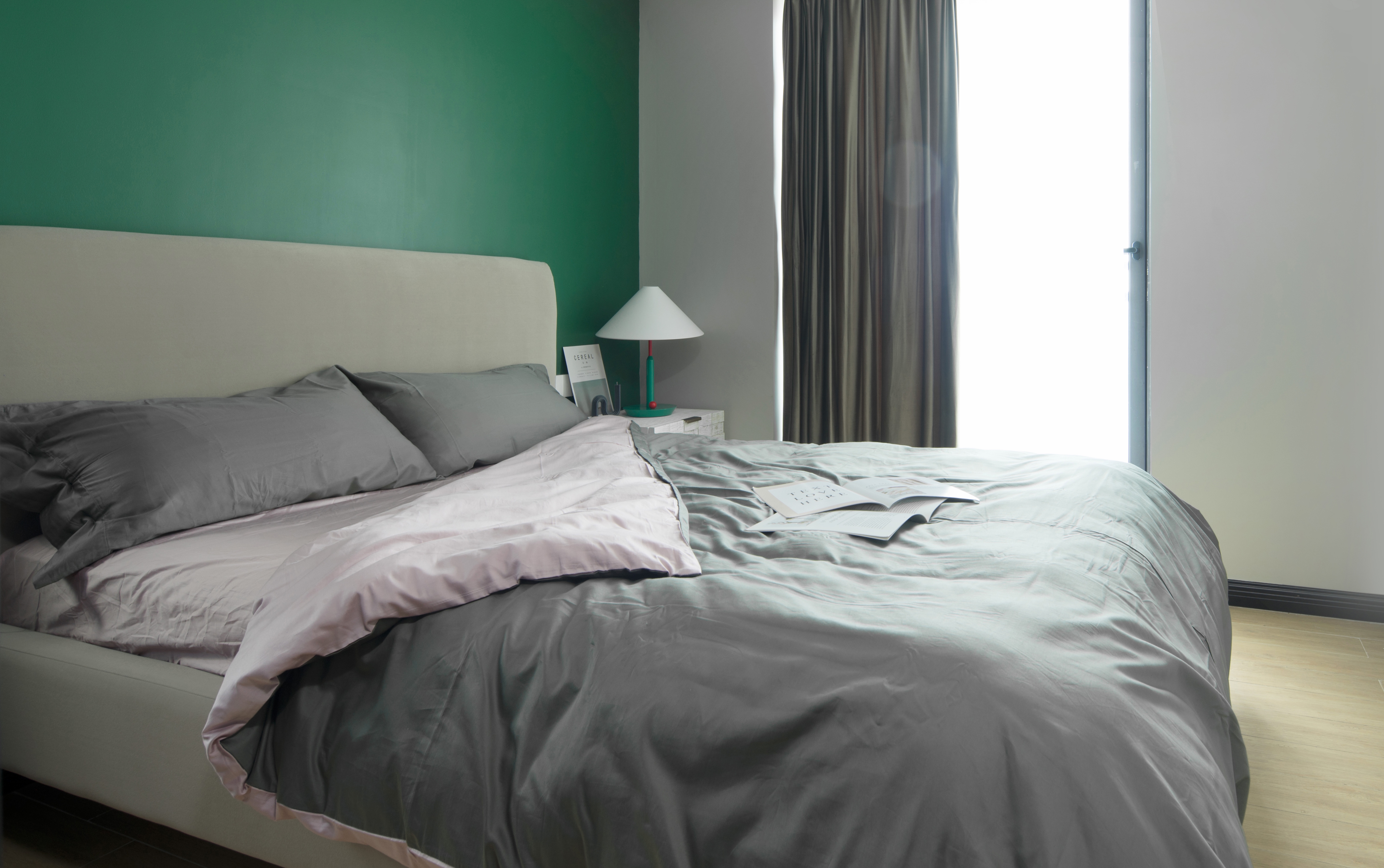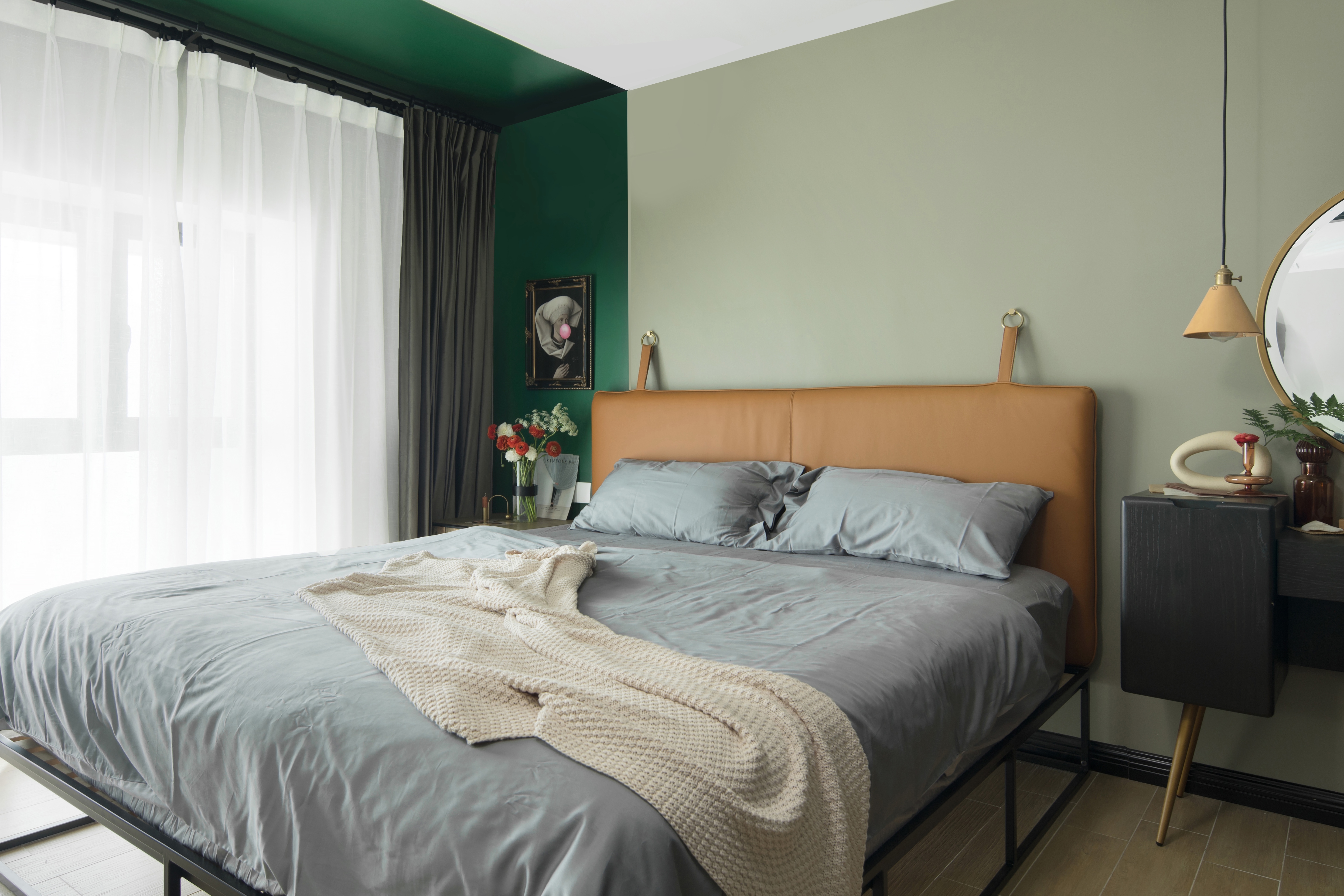 二层主卧主题呼应,条状色块配真皮床具,点缀棉麻床品,提升空间逼格。结合睡眠、美妆、储藏,也可机动排放婴儿床,亲子时刻不可少。