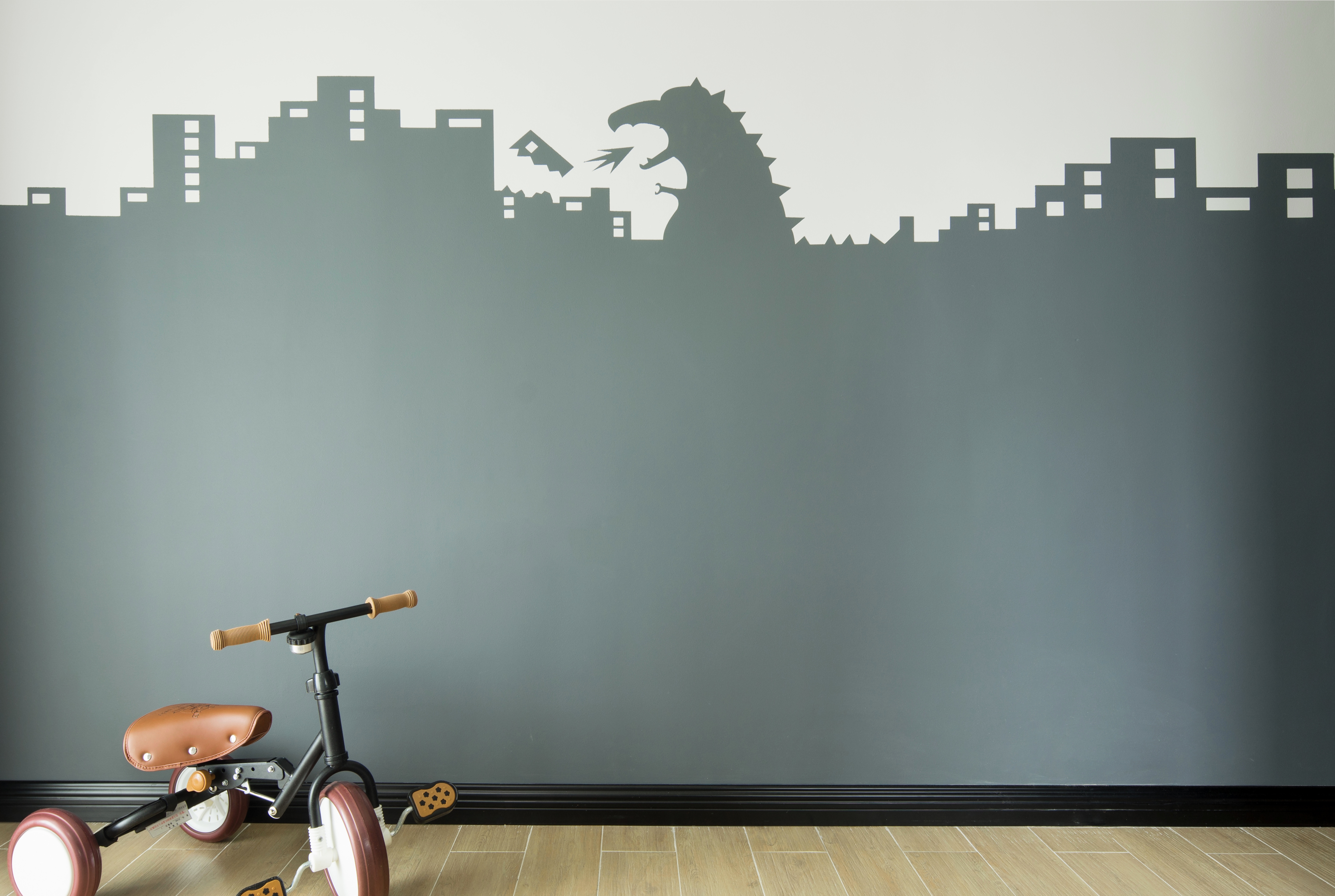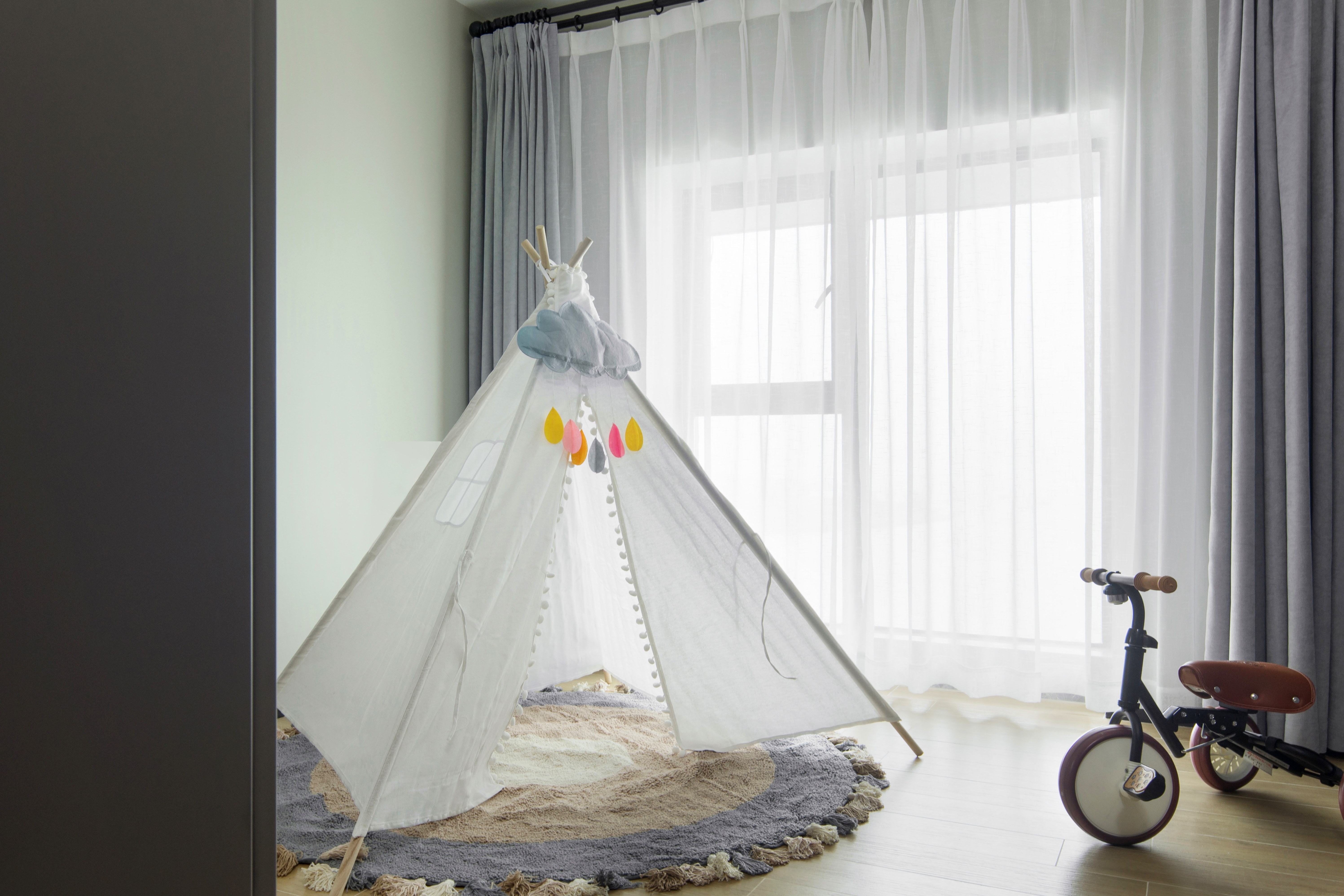 宝宝房根据今后实际布置预留好开关插座,目前放置玩具柜、趣味帐篷和爬爬垫即可。要做好墙面插座的防护盖处理,让空间变得有趣。