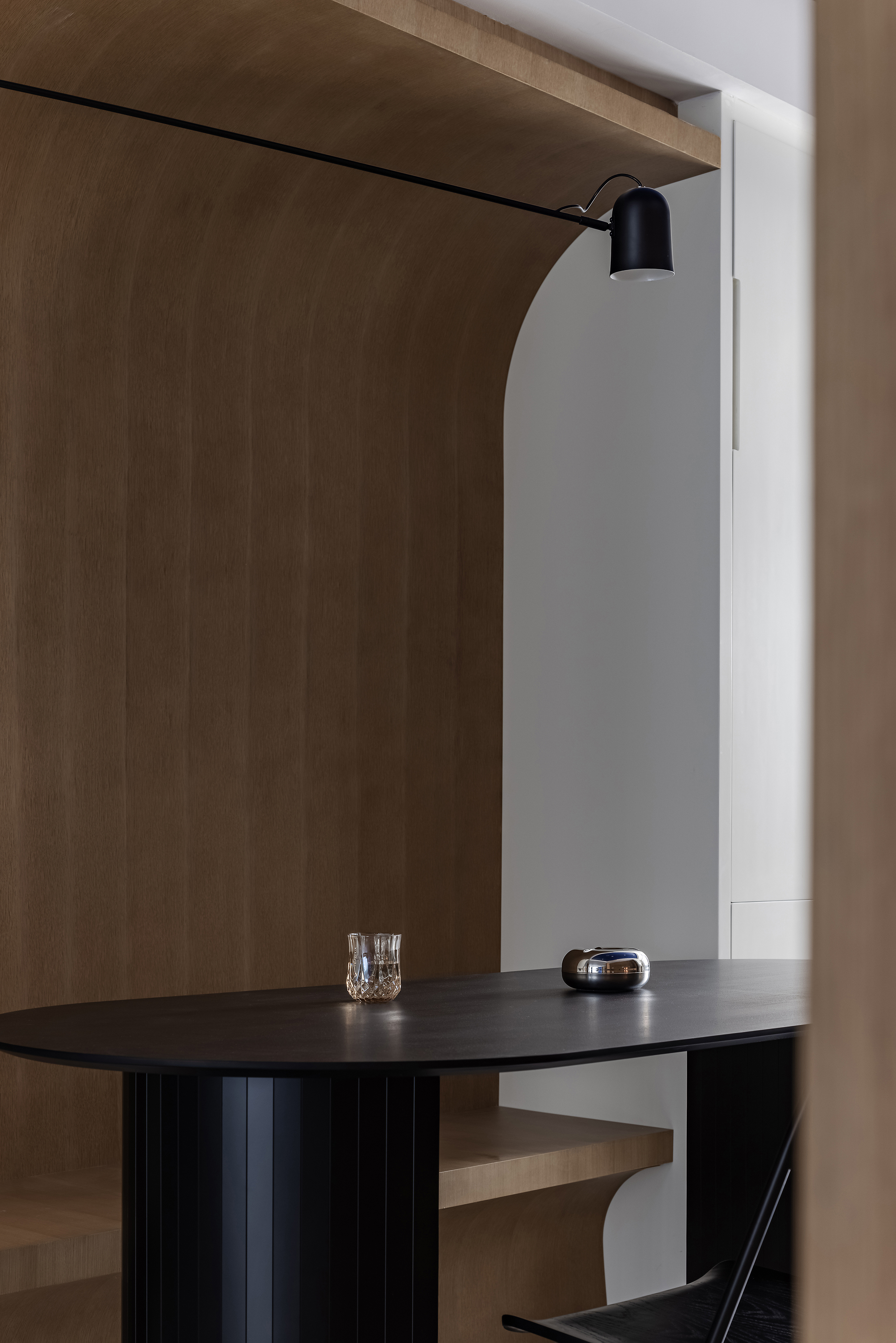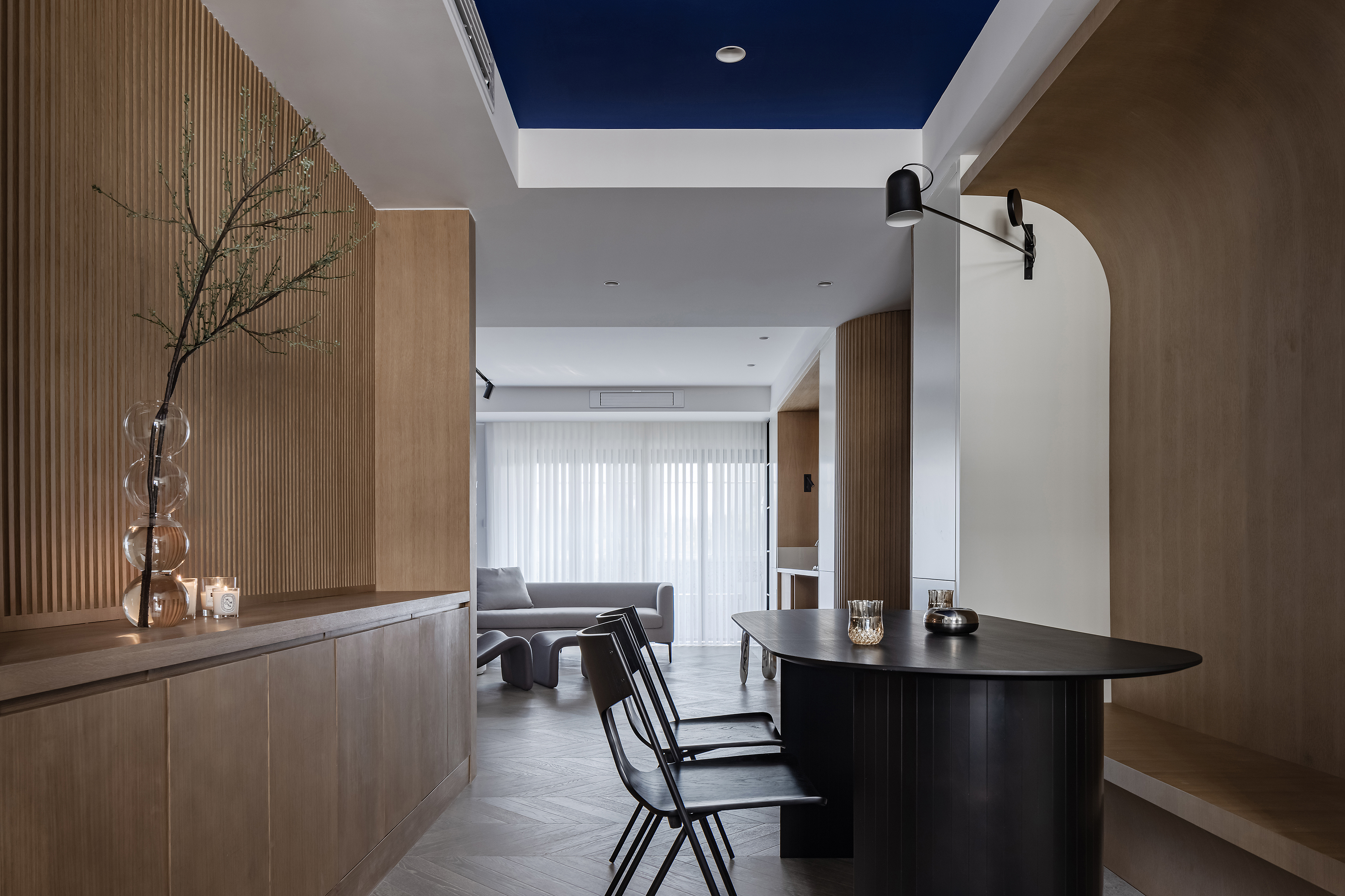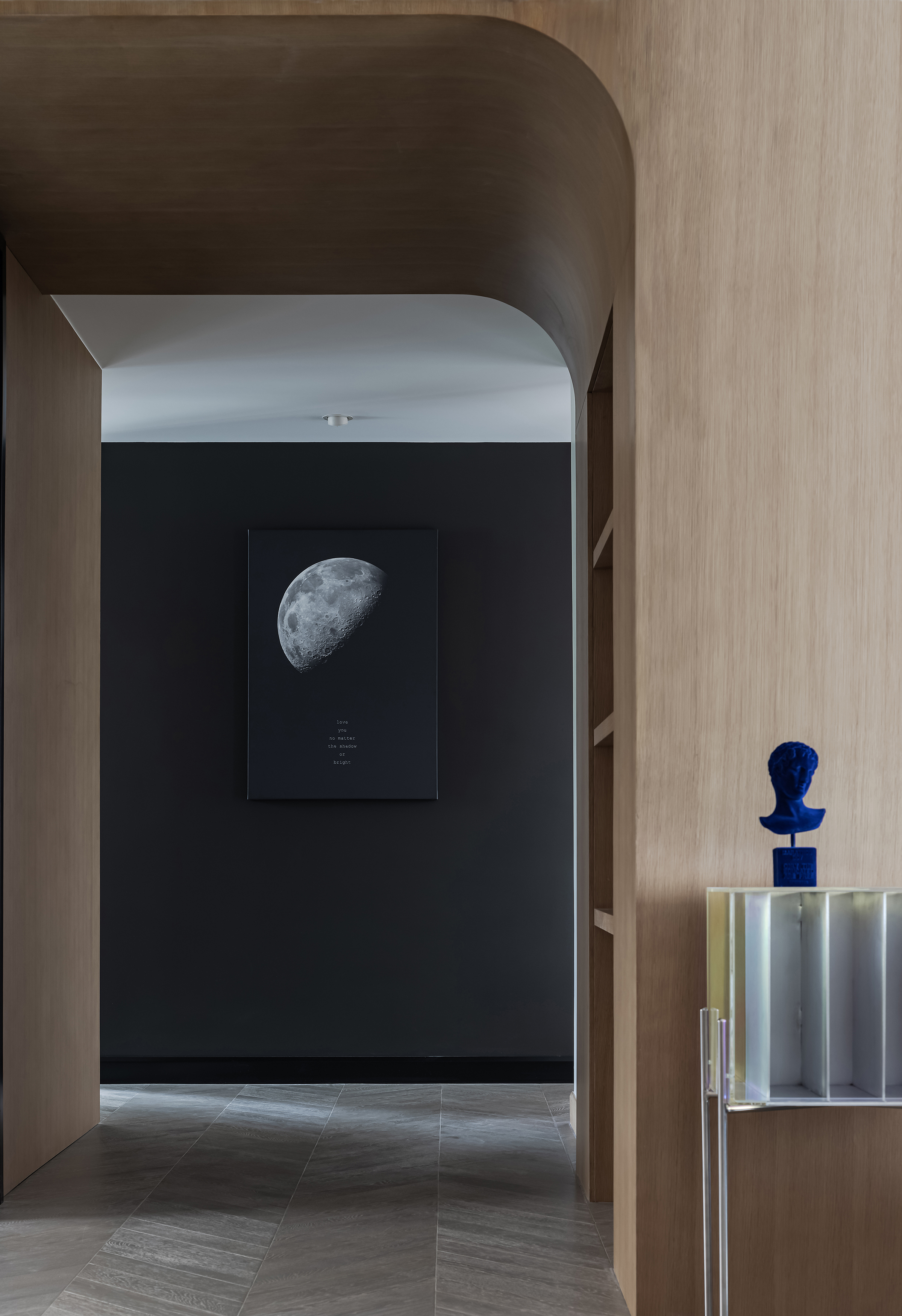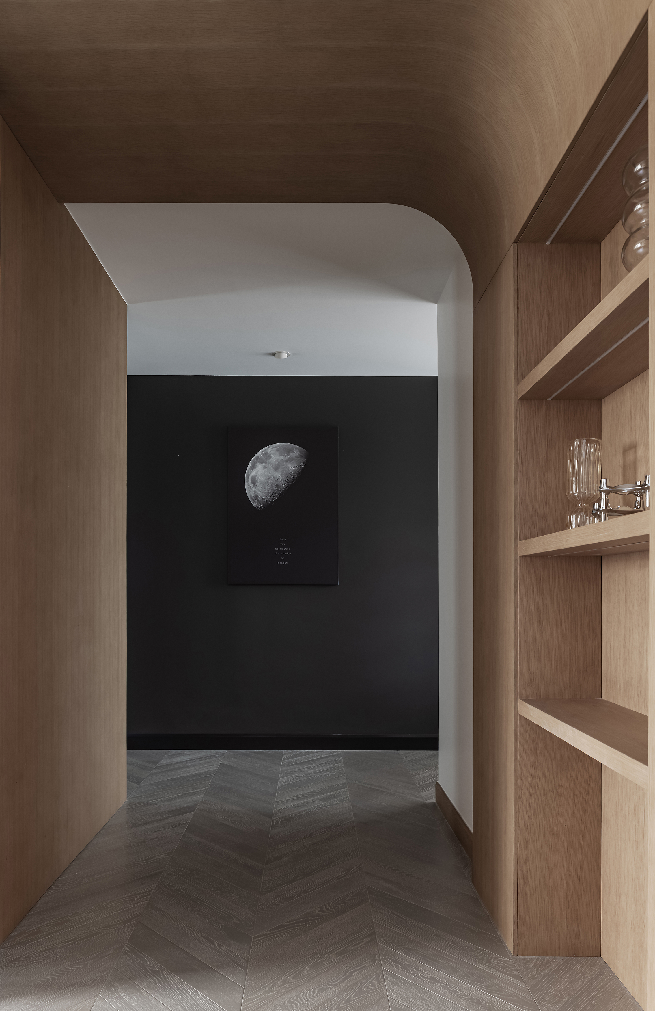 过道吊顶连贯餐厅及客厅的木饰面弱化过道,黑色墙面的运用给能平静的感受。