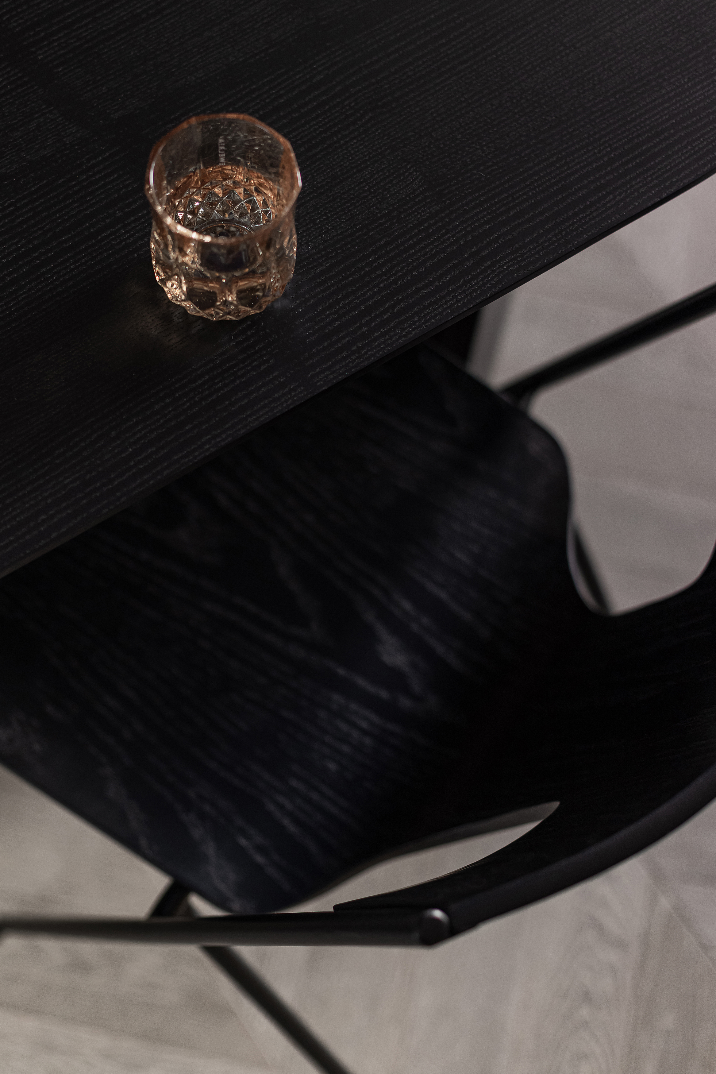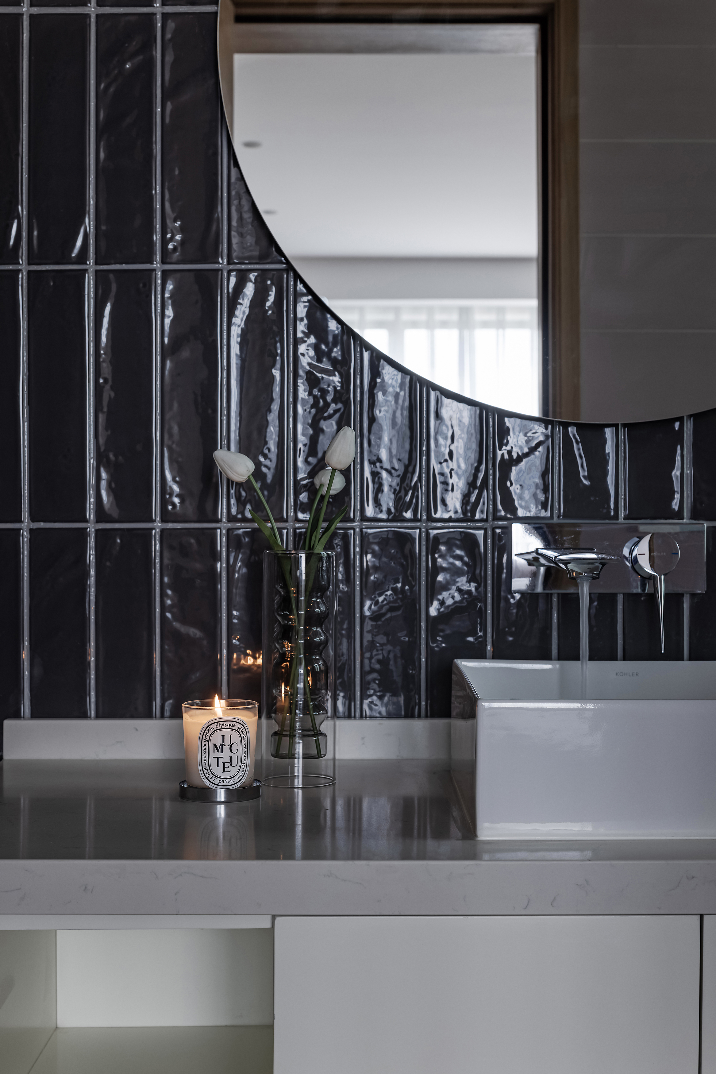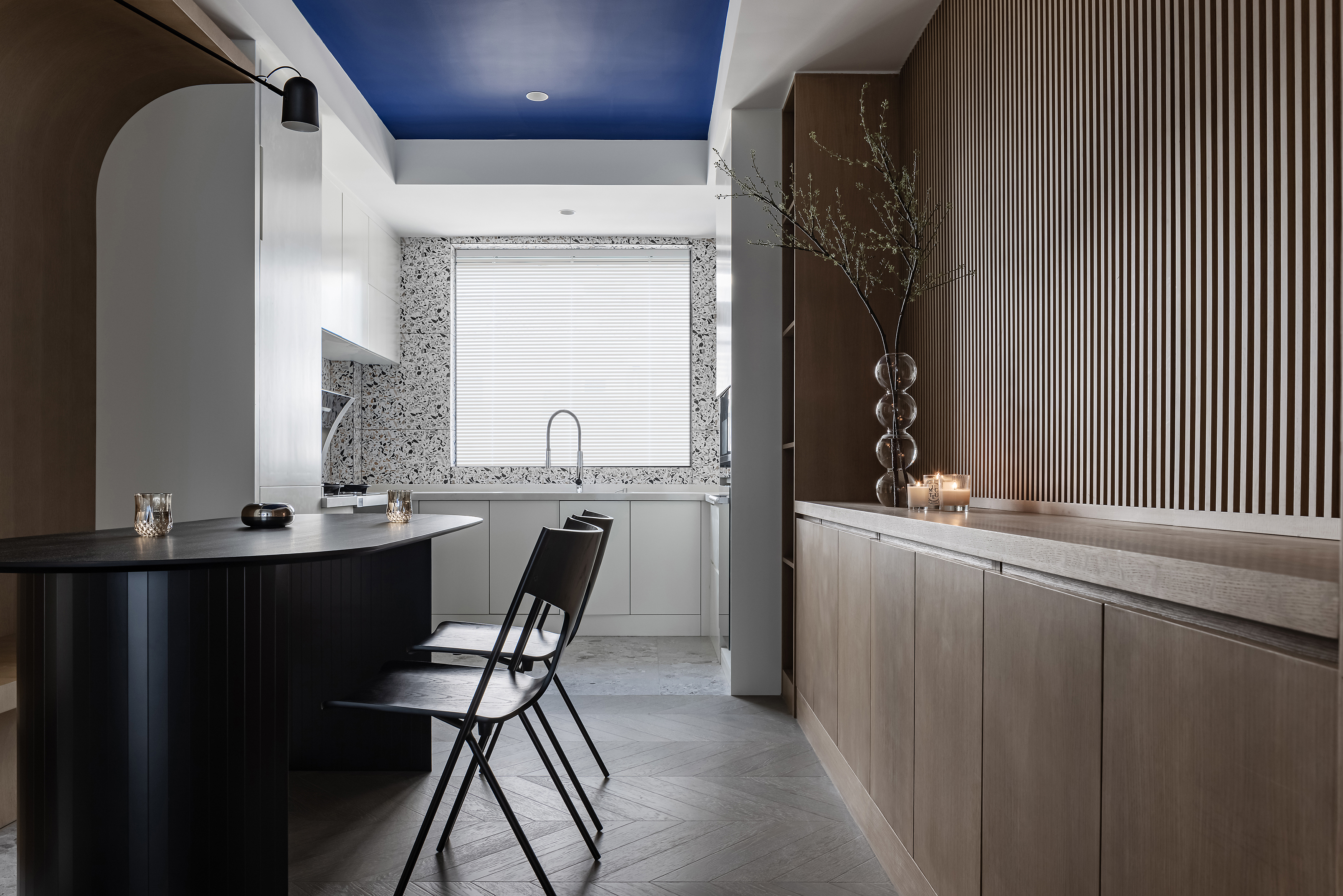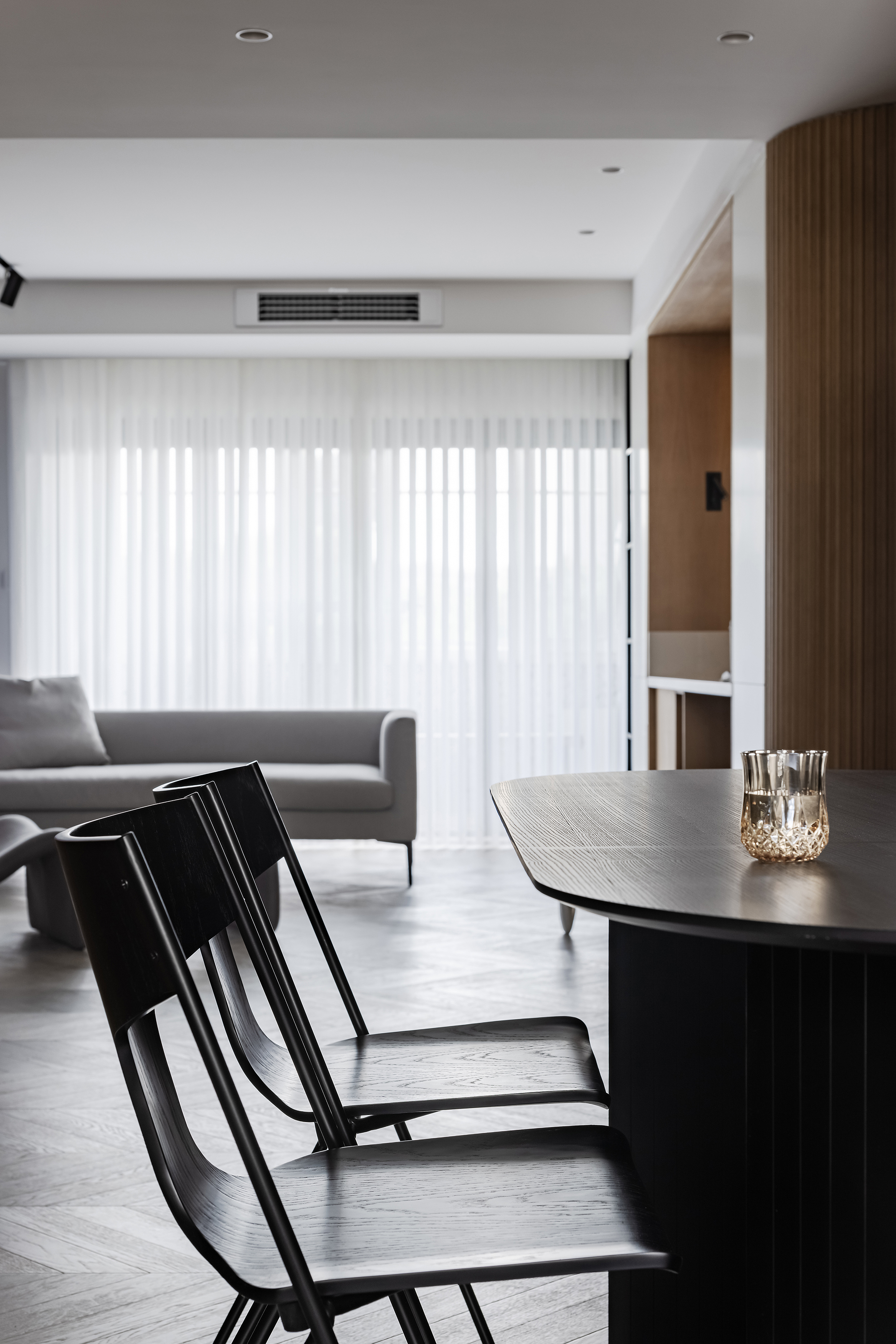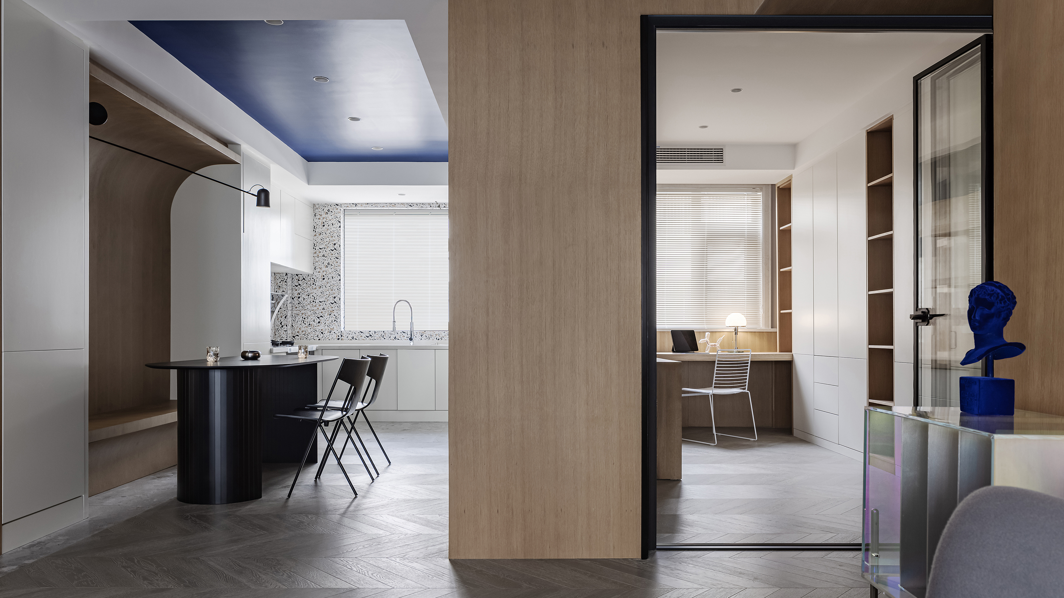 过道吊顶连贯餐厅及客厅的木饰面弱化过道,黑色墙面的运用给能平静的感受。