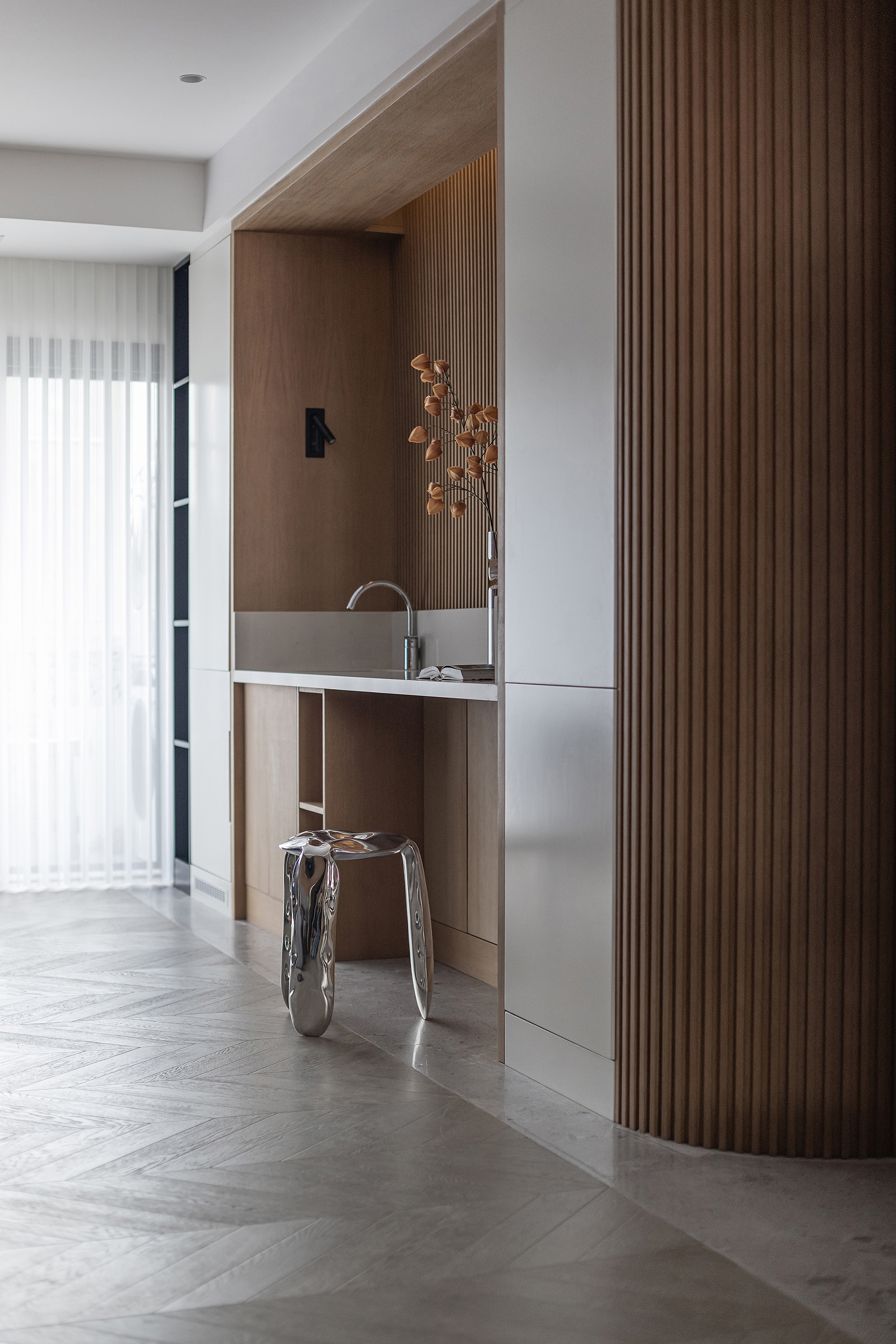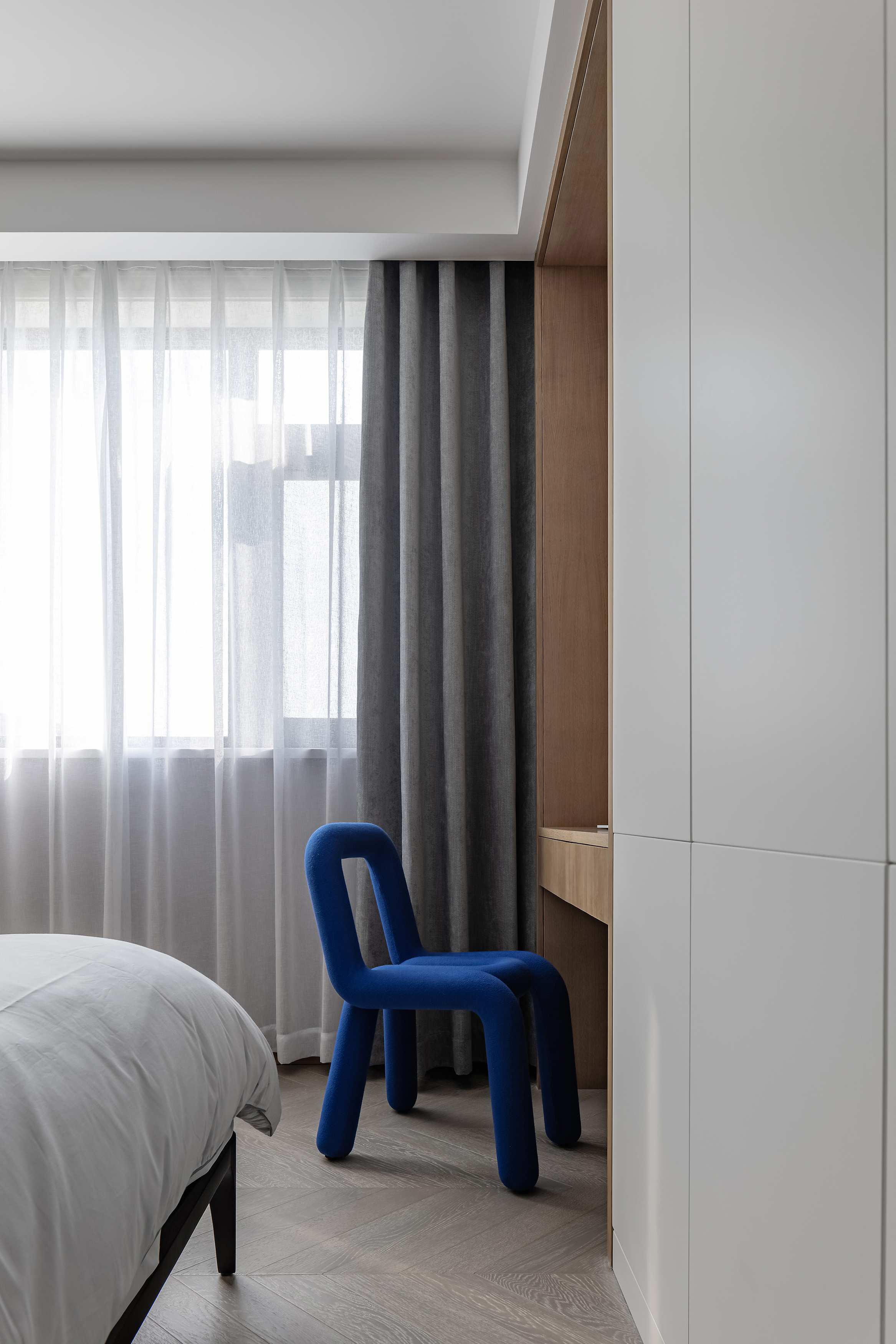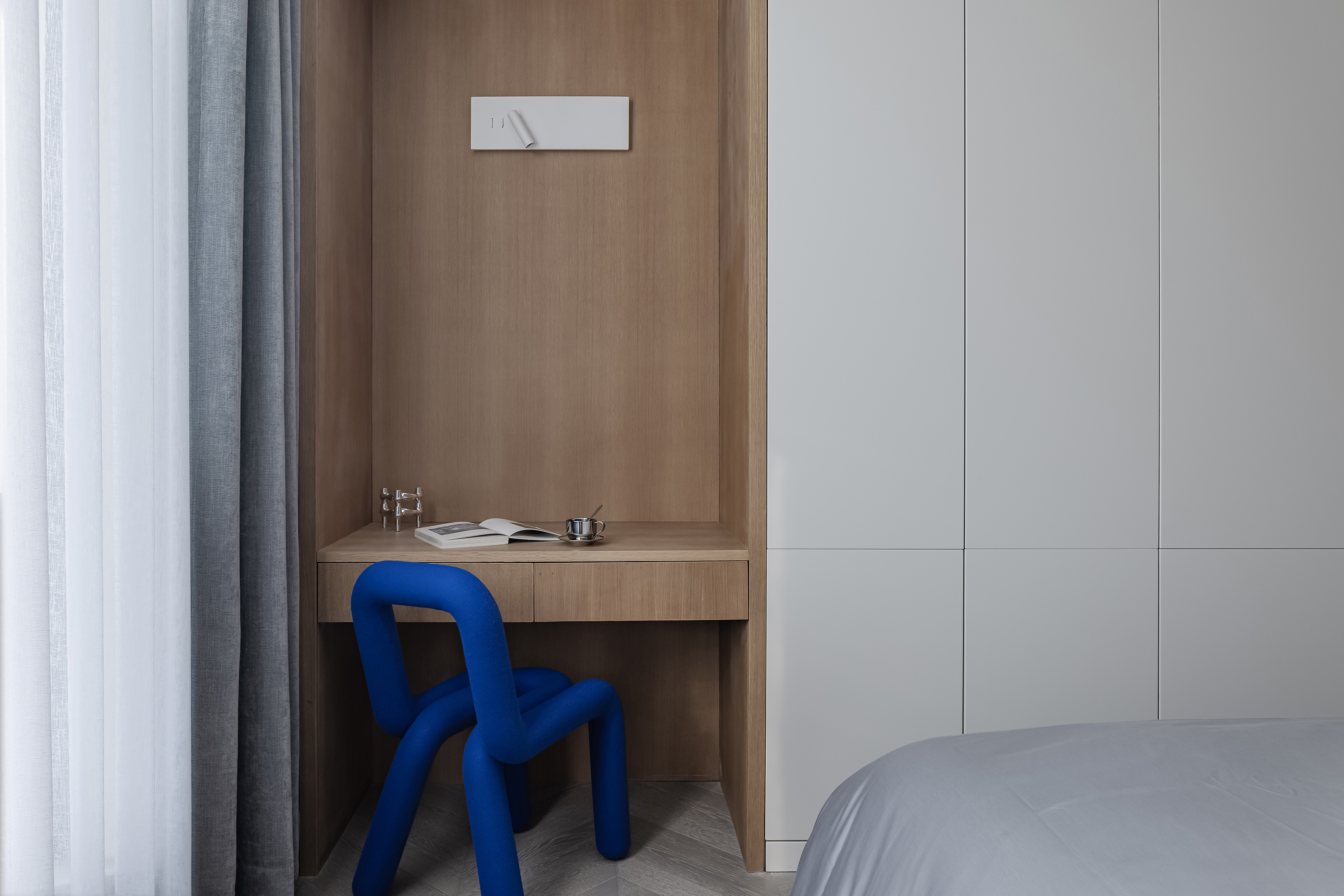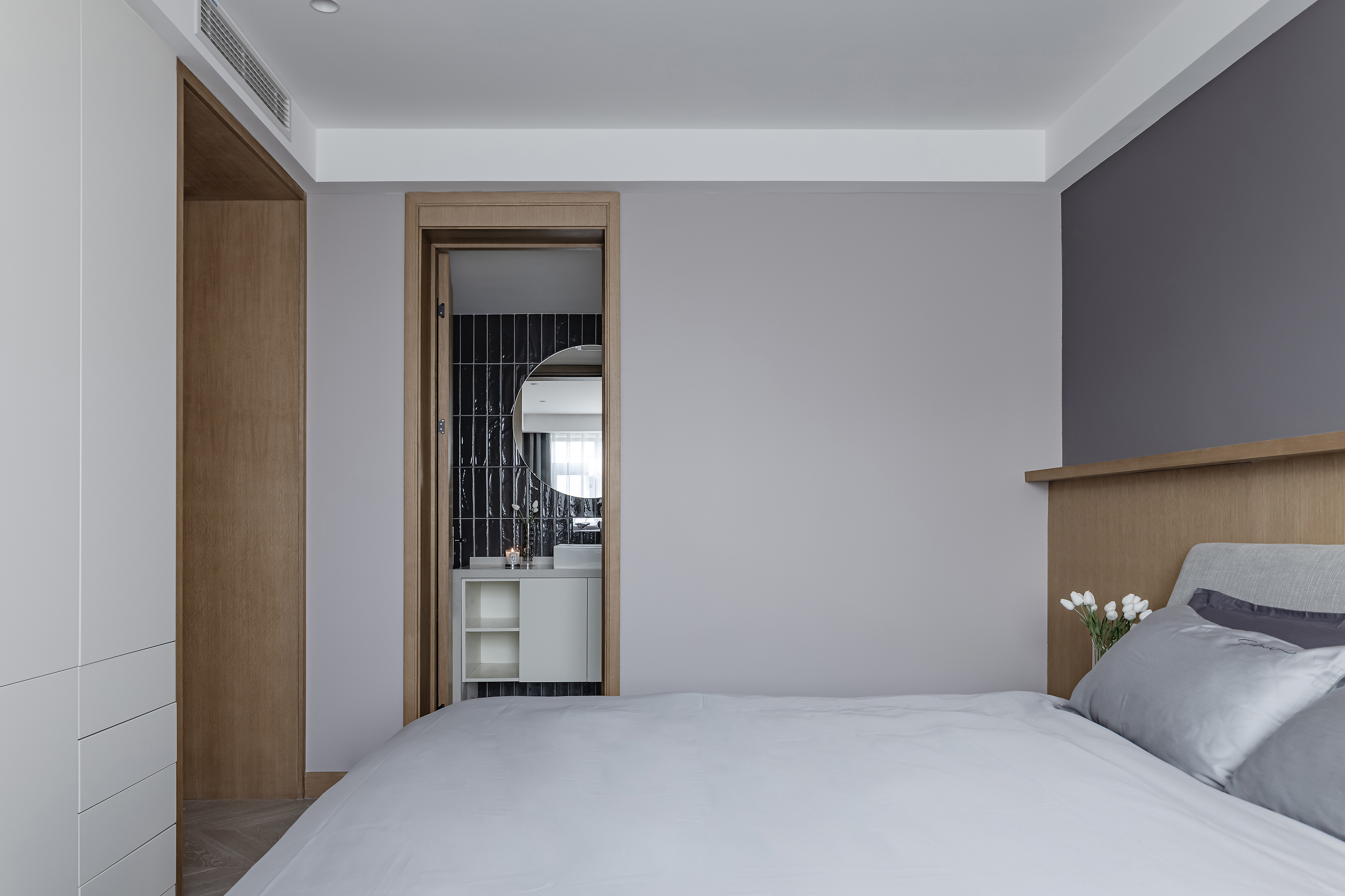 主卧在材质以及色彩上呼应整体,大量柜体解决日常所需储物功能。