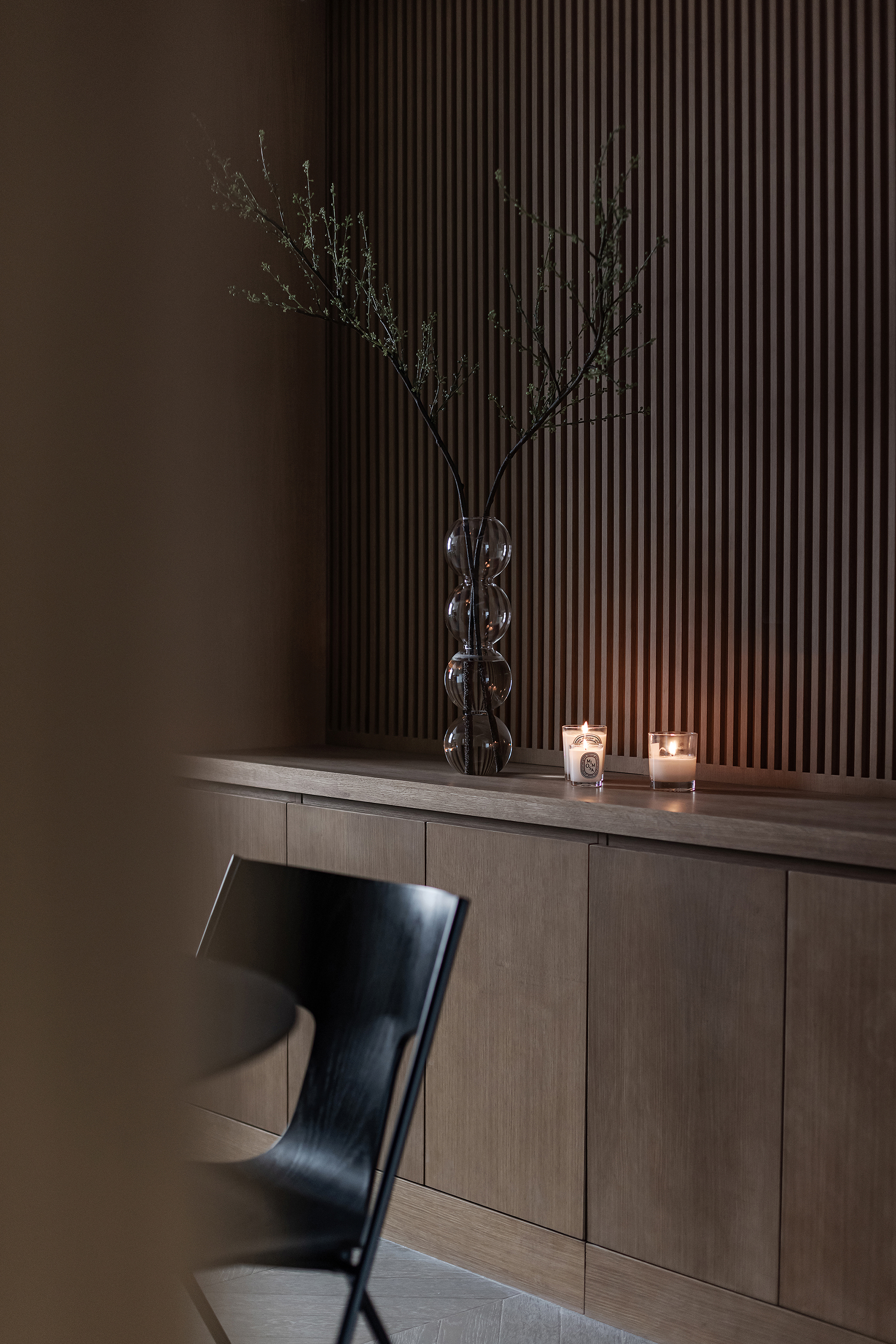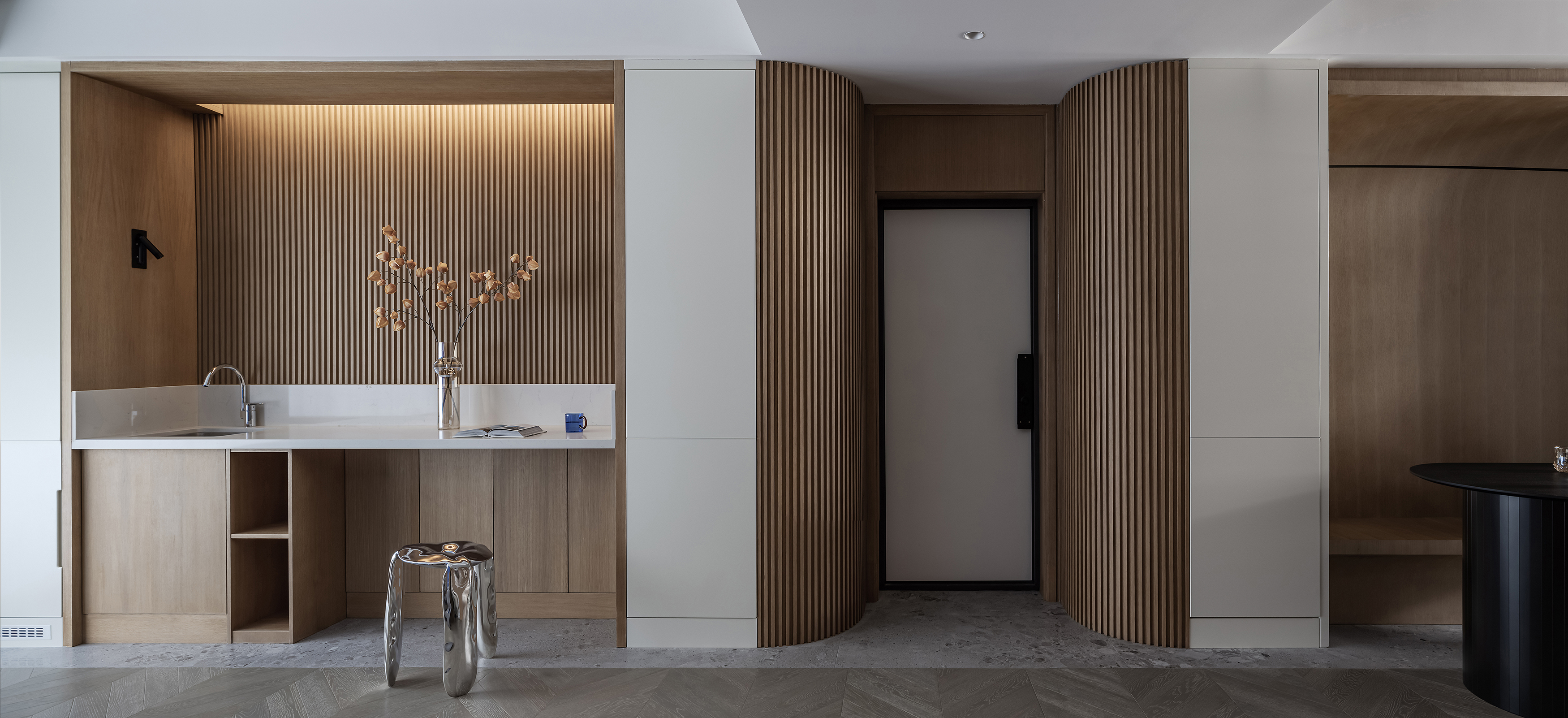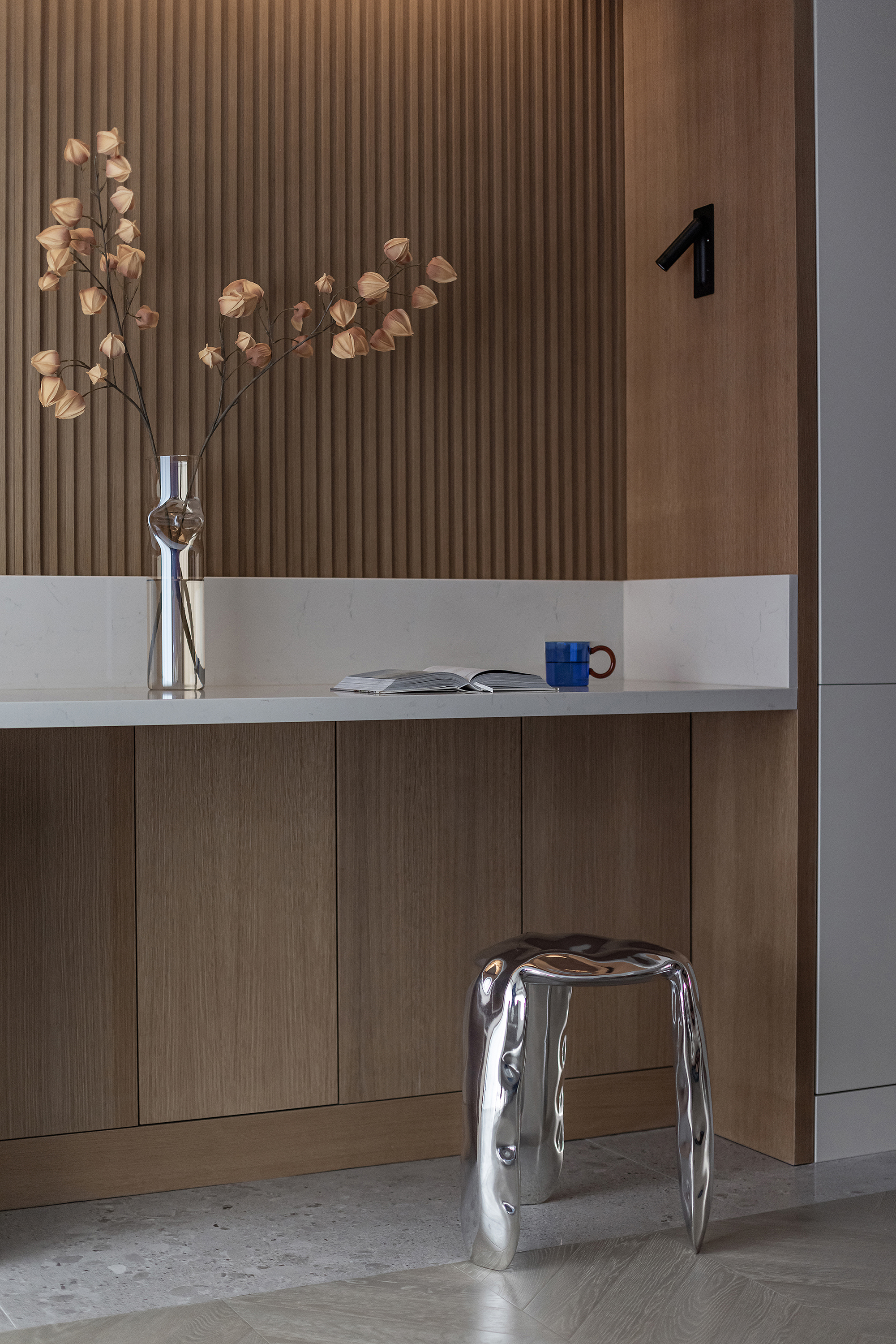 餐边柜的木饰面造型和入户门处及水吧台处的木饰面形成呼应,材质上和餐厅卡座形成一个融合。