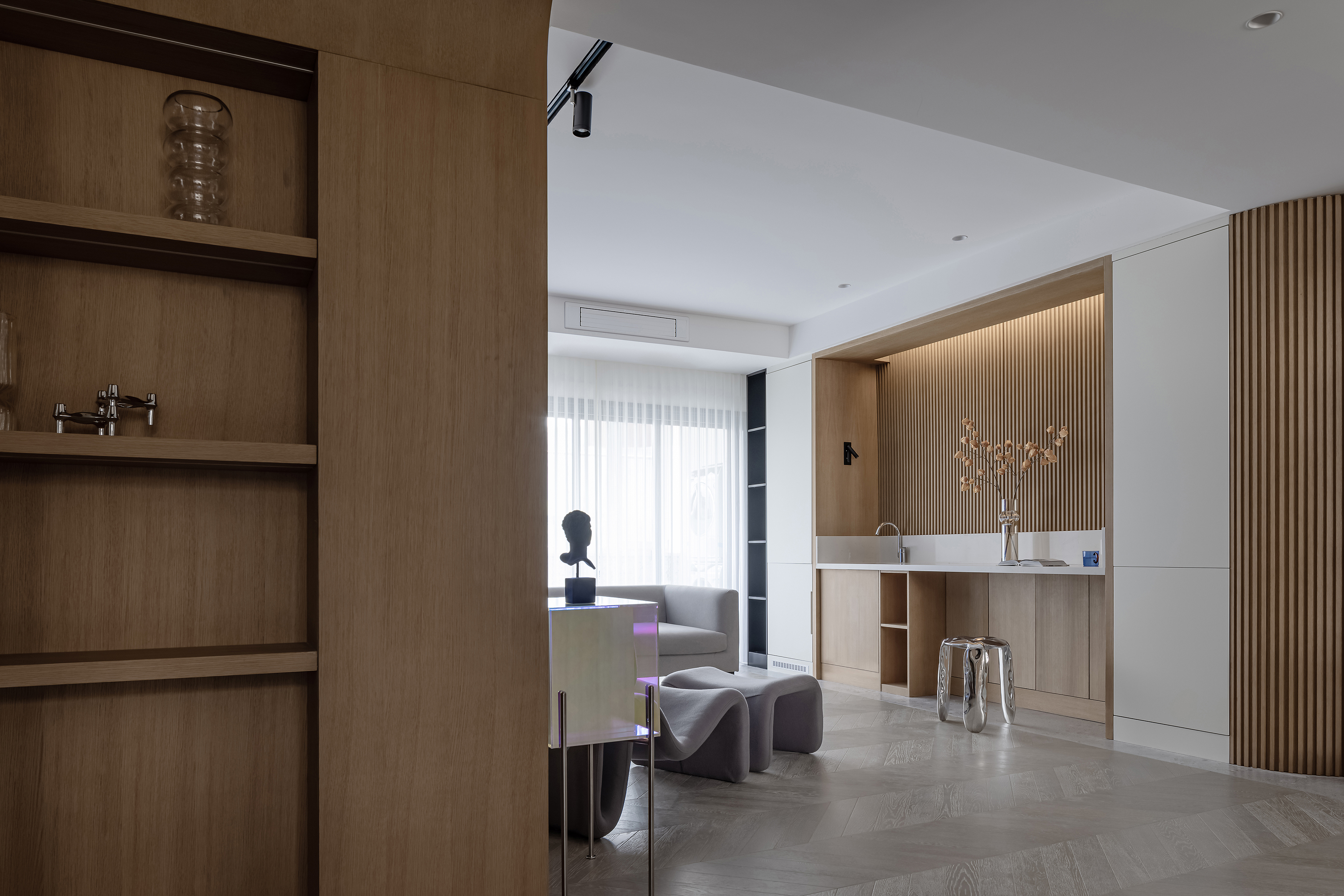 客厅沙发非常规布置,客厅制作水吧台,内嵌式冰箱,单水槽以及入户鞋柜。业主平时很少看电视,只在水吧台上方暗藏了电动投影幕布。
