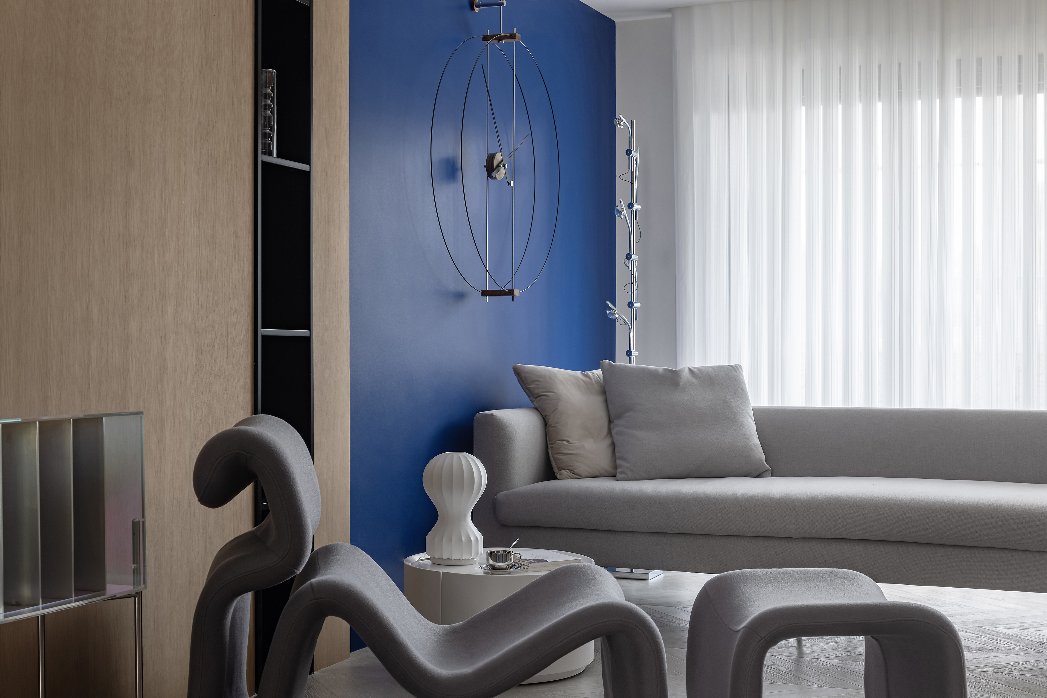 客厅横置沙发和单人躺椅形成互动,二三人或躺或坐,谈笑或观影,乐在其中。