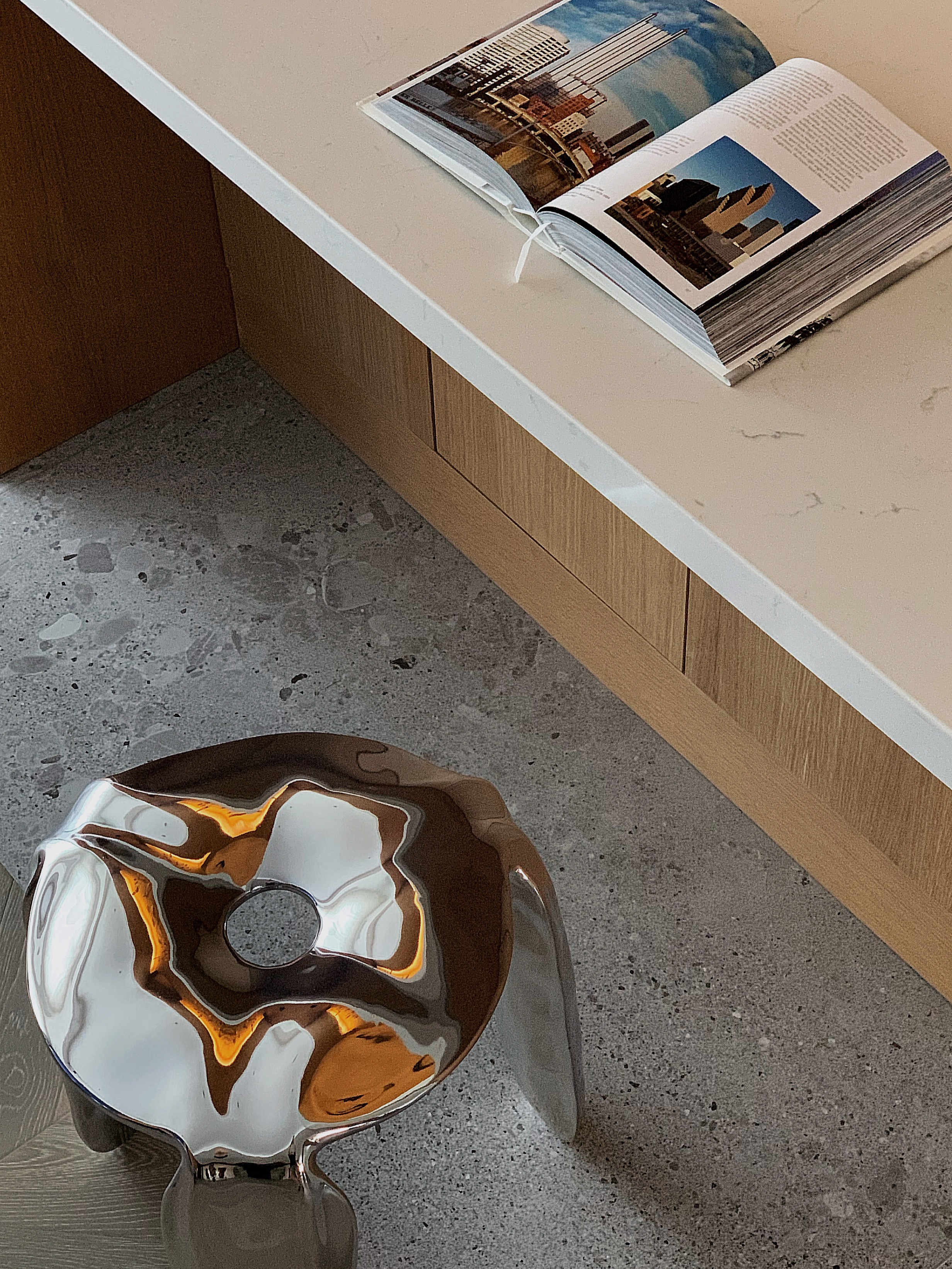 客厅水吧台同时也兼有阅读功能,和客厅沙发及单人位形成三点呼应交流。