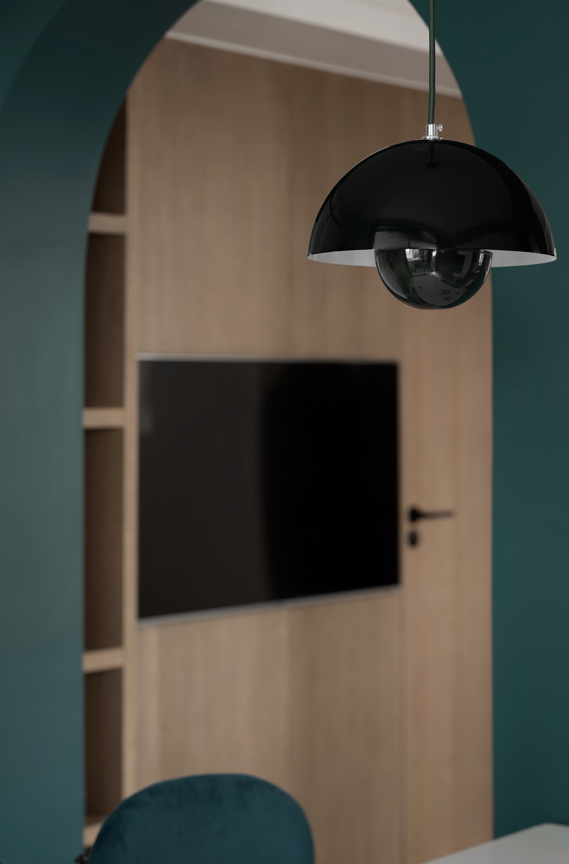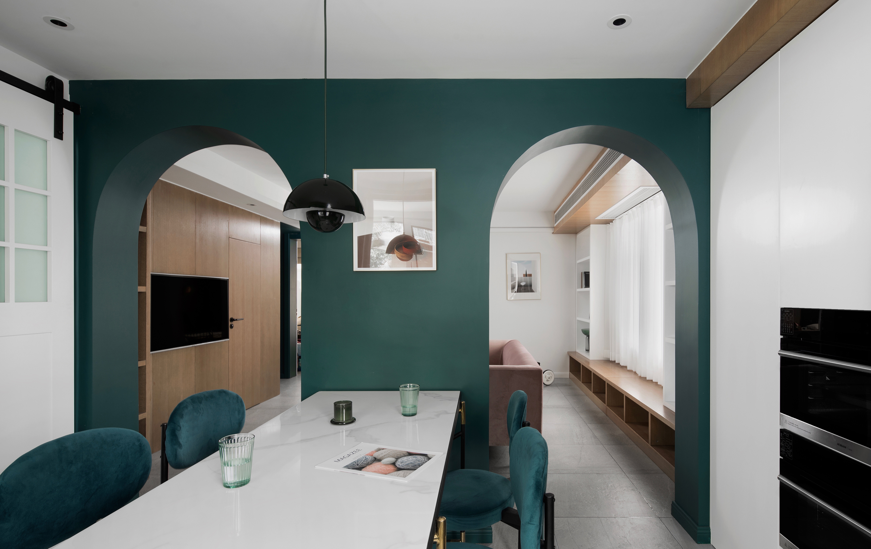 通过两个拱形门洞,可进入餐厅,现有餐厅是原有结构的厨房位置,放置四人桌,一家四口可轻松就餐。在餐厅西墙布置设备柜放置冰箱和蒸烤箱,增加了储物空间更实用。