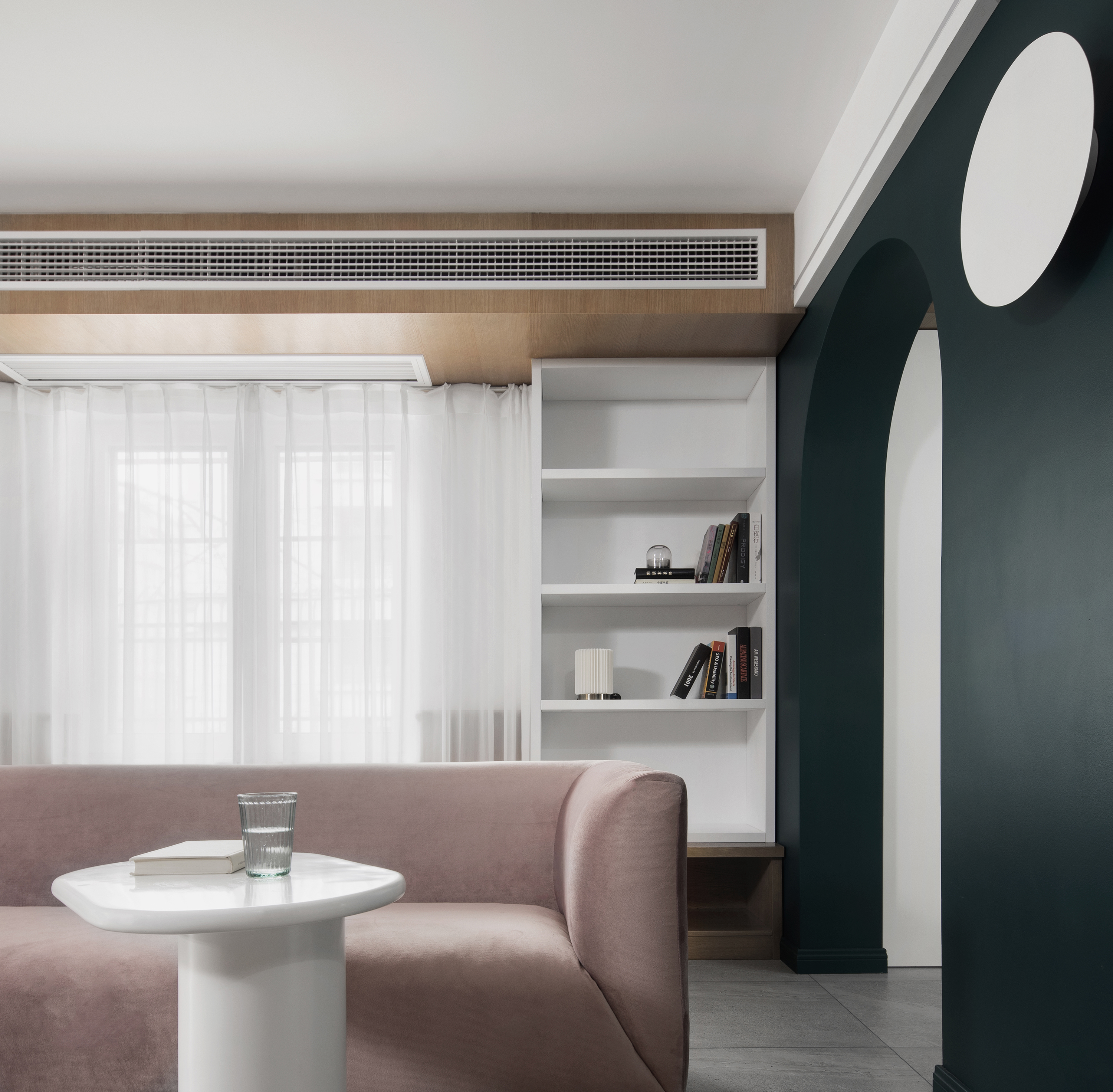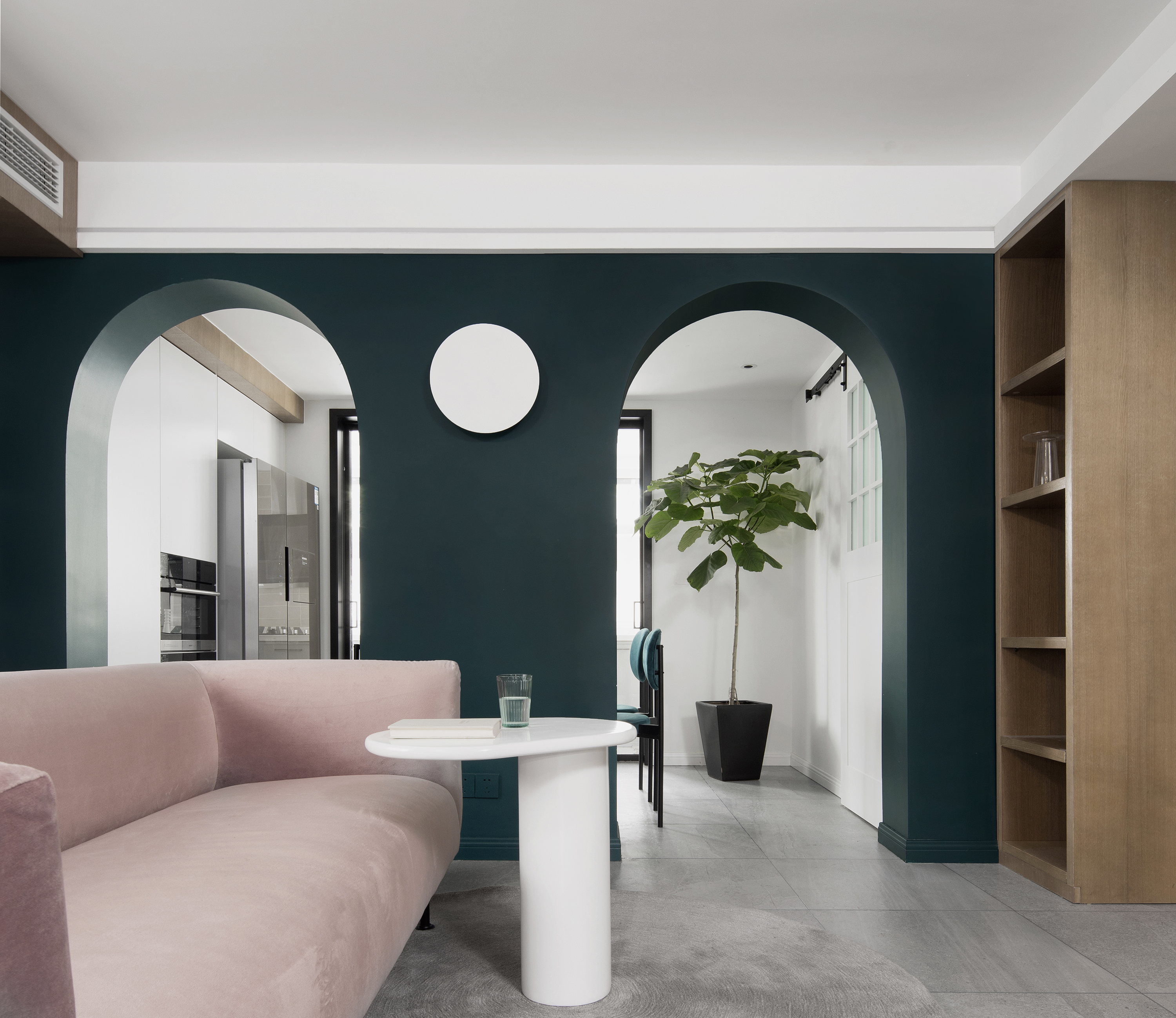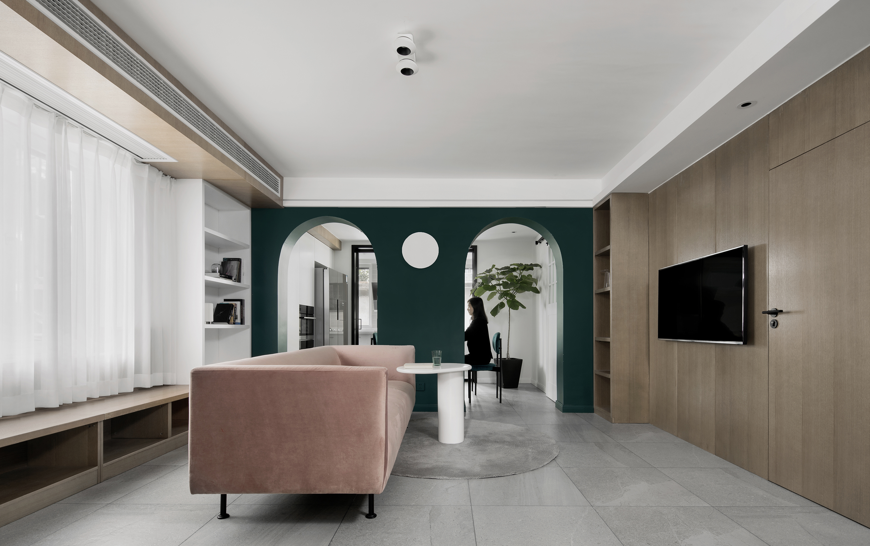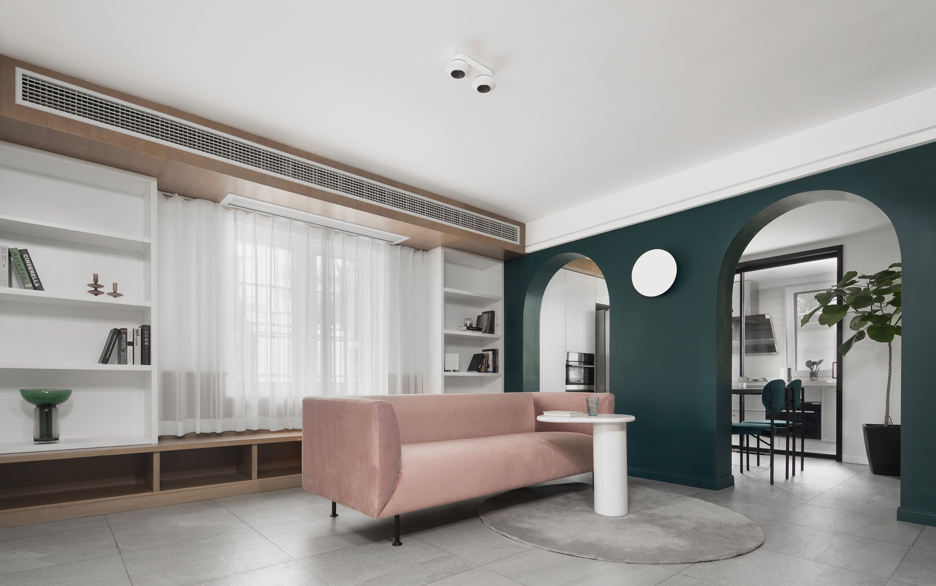 客厅沙发后方留过道,利用原窗户墙面做书柜和卡座,沙发后留空间,宝宝有更多动线。通过两个拱门可到餐厅。