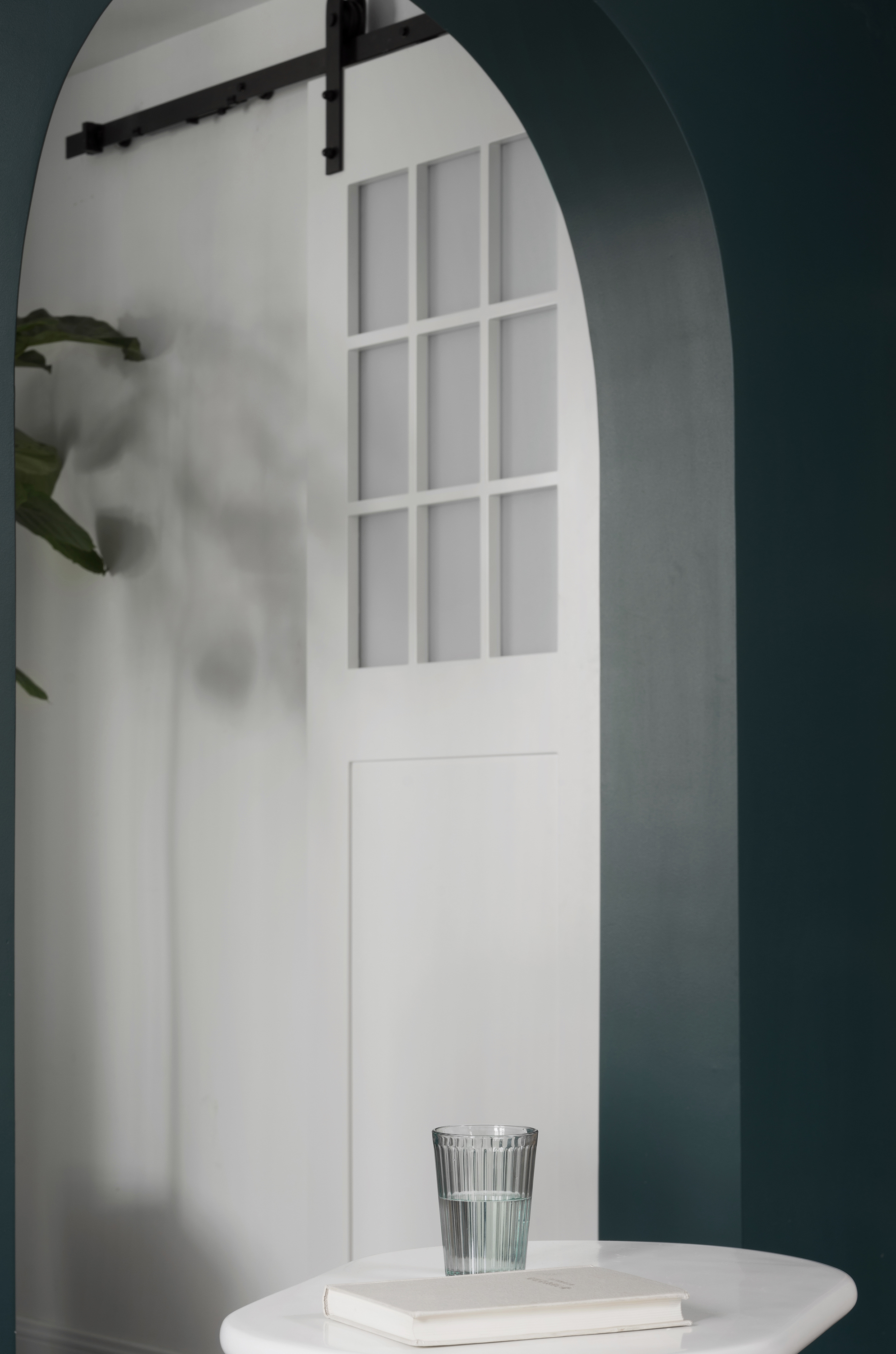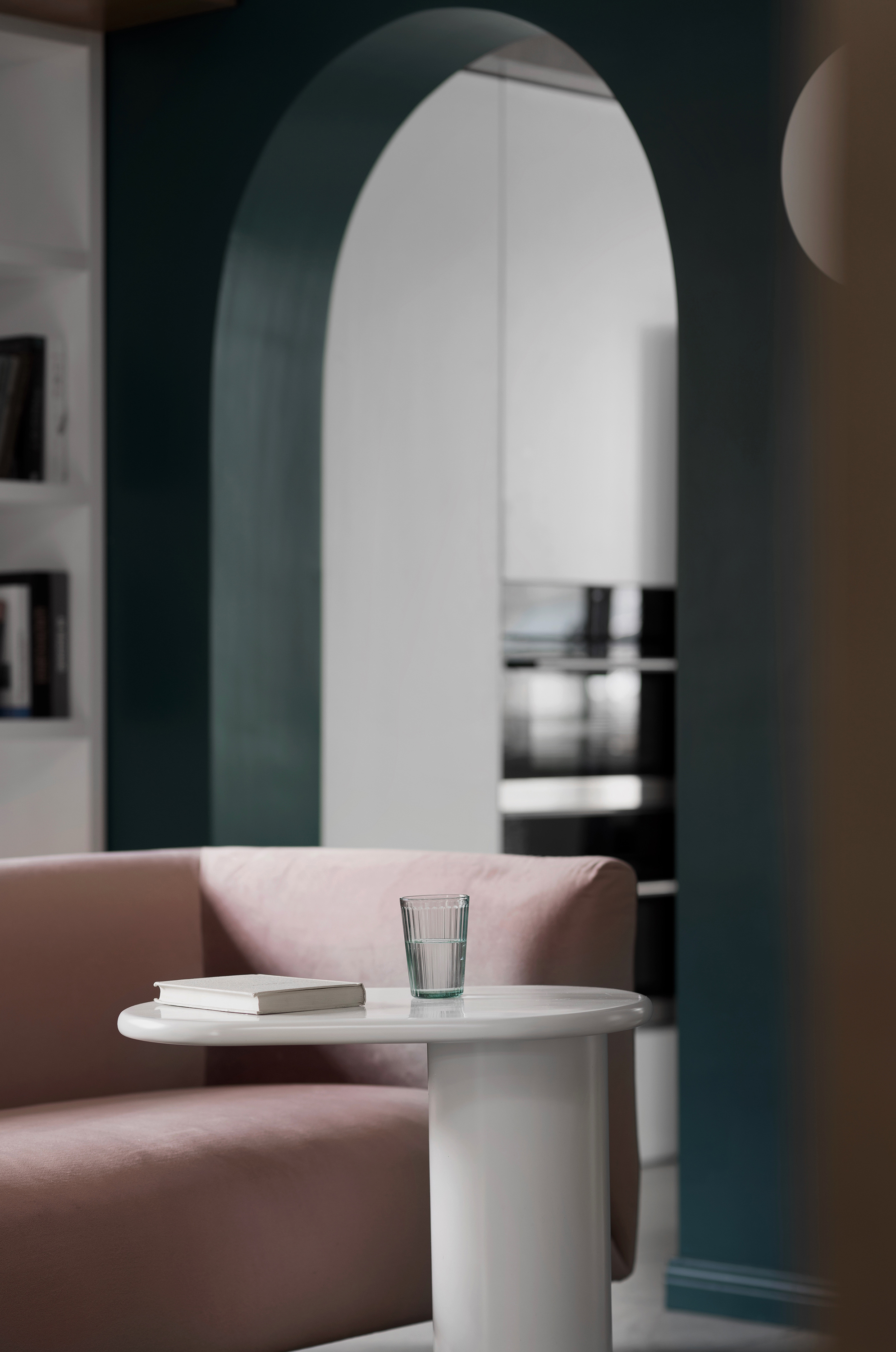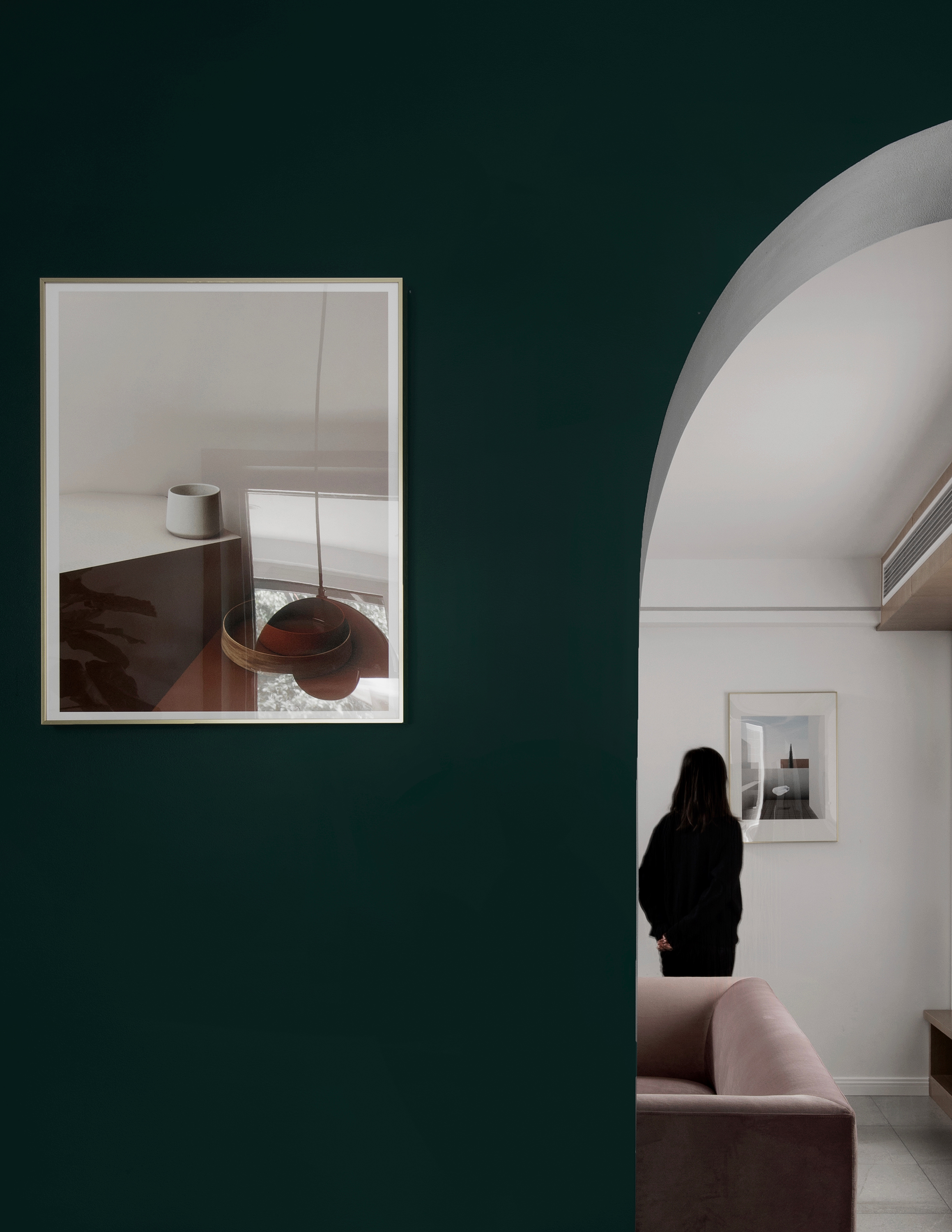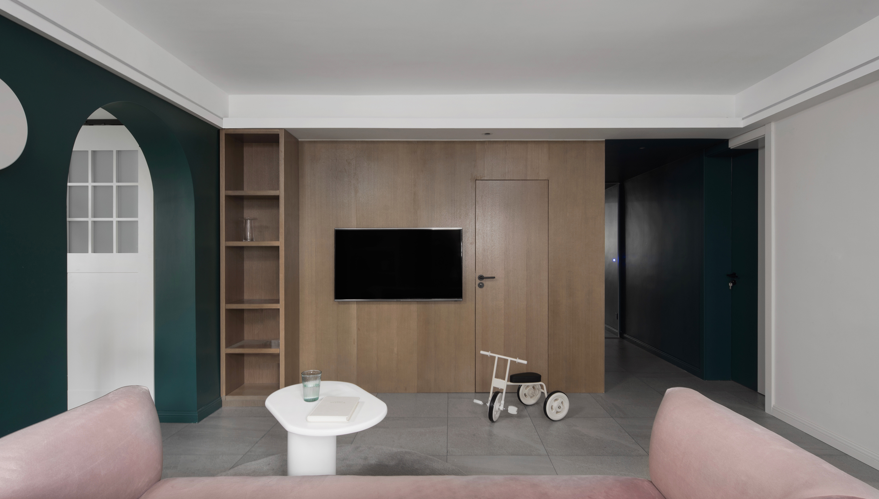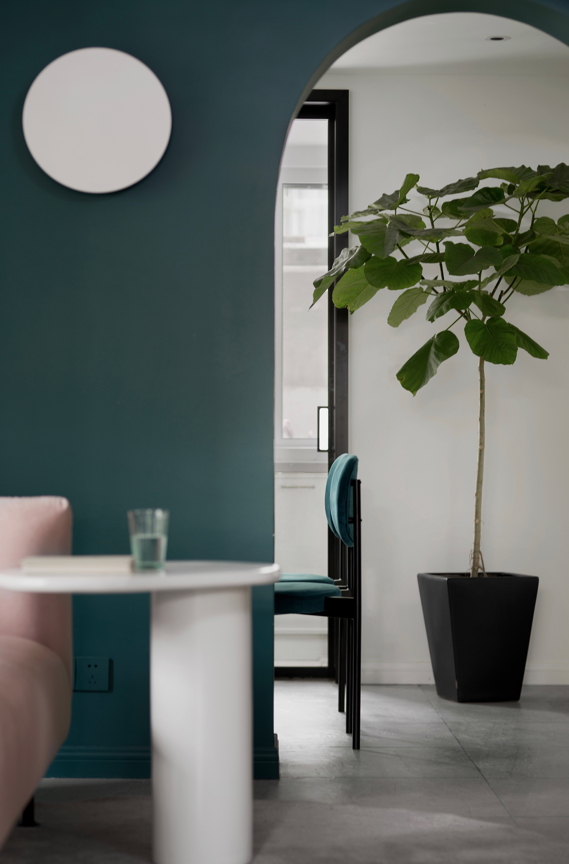 客厅沙发后方留过道,利用原窗户墙面做书柜和卡座,沙发后留空间,宝宝有更多动线。通过两个拱门可到餐厅。